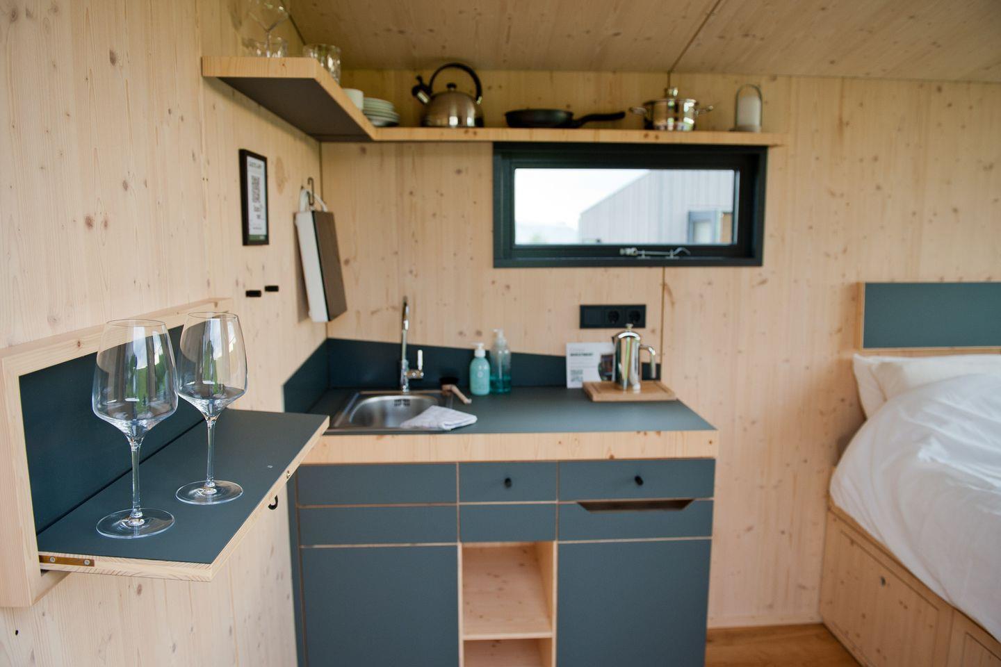 Die neuen Green Tiny Sleep Spaces sind ideal geeignet für Fahrradfahrer, Wanderer und andere Naturliebhaber, die nach einer nachhaltigen und stilvollen Übernachtungsmöglichkeit suchen. Auf fünf Quadratmetern findest du alles, was du für einen Kurzaufenthalt benötigst: ein komfortables Bett für zwei Personen, eine Kochnische mit Waschbecken und ausreichend Staumöglichkeiten. Duschen und Toiletten findest du in den Waschräumen der Flugschule Dolmar. Die kleinen Geschwister der Green Tiny Houses vom Typ Pioneer werden ebenfalls in Schleswig-Holstein gebaut und bestehen ausschließlich aus wohngesunden Materialien. Außerdem bieten wir dir eine klimaneutrale Übernachtung dank Kompensation aller anfallenden CO2-Emissionen.
