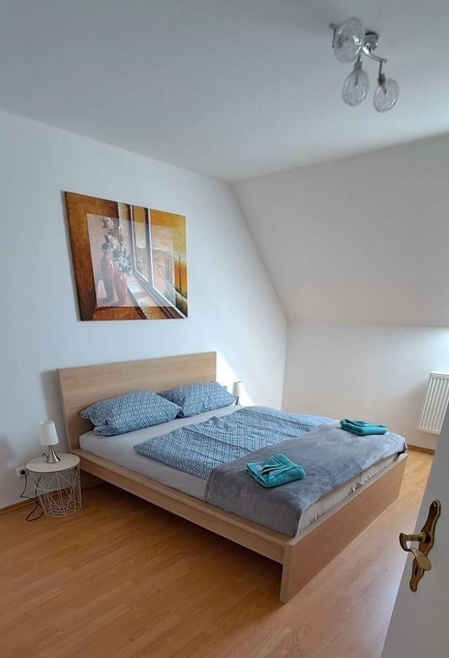 Im Schlafzimmer befindet sich ein Doppelbett und ein großer Kleiderschrank. Das Badezimmer ist ausgestattet mit einer ebenerdigen Dusche.