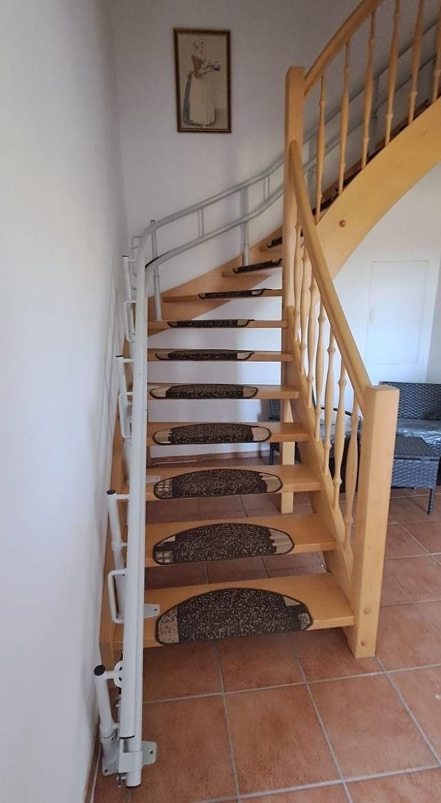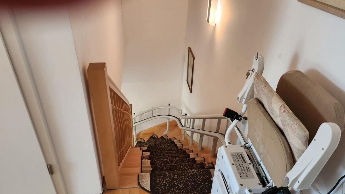 Über eine Treppe mit Treppenlift erreichen Sie das obere Stockwerk. Dort befindet sich das Wohnzimmer mit dem Zugang zum Balkon. Hierbefindet sich auch eine auszuehbare Schlafcouch, eine Schrankwand, sowie ein Flachbildfernseher. Eine separate Küche mit großem Esstisch und vier Stühlen, einer großen Küchenzeile mit Herd, Backofen, Geschirrspüler, Kaffeemaschine, Toaster und allen nötigen Annehmlichkeiten, ist direkt nebenan.