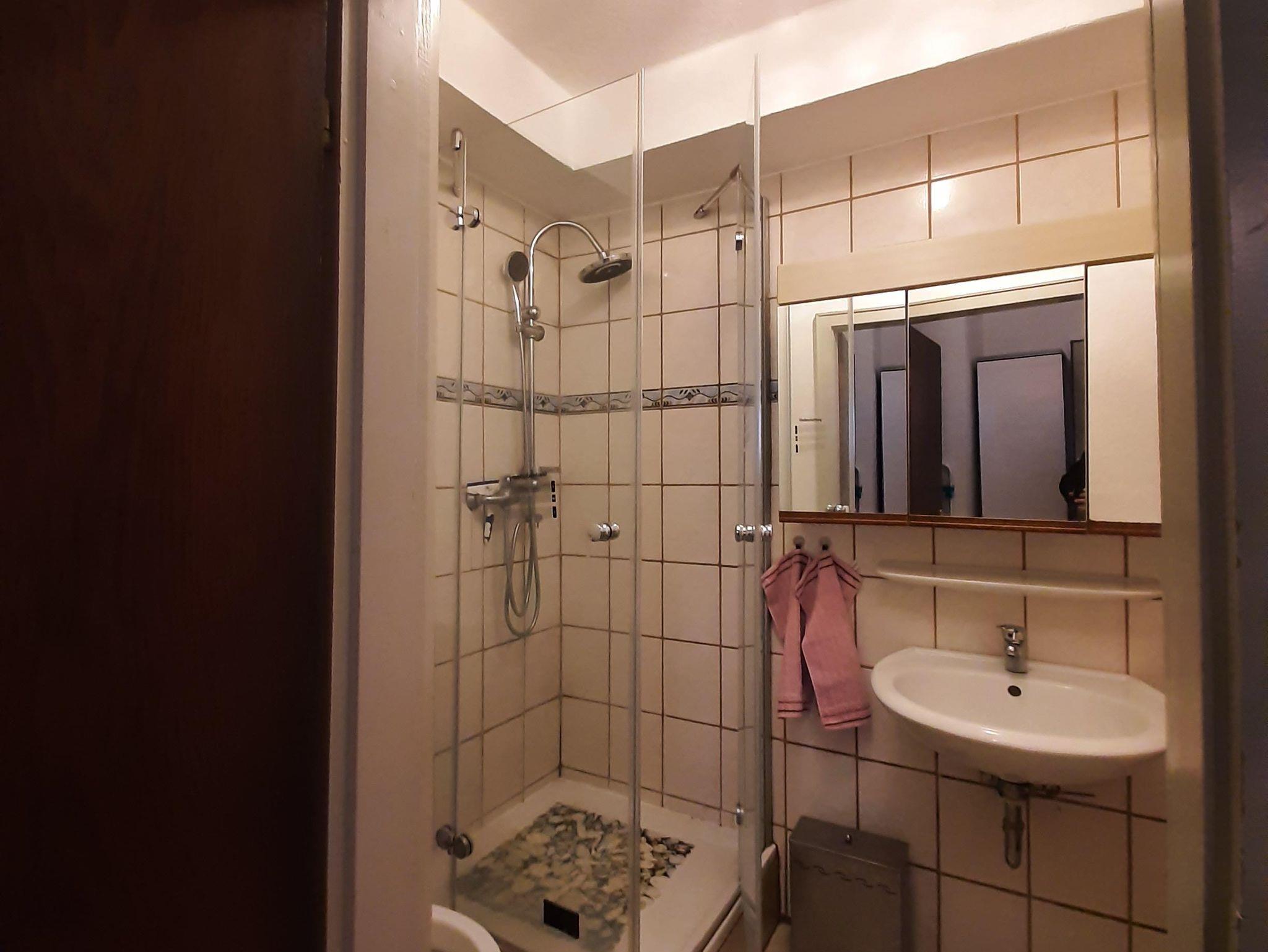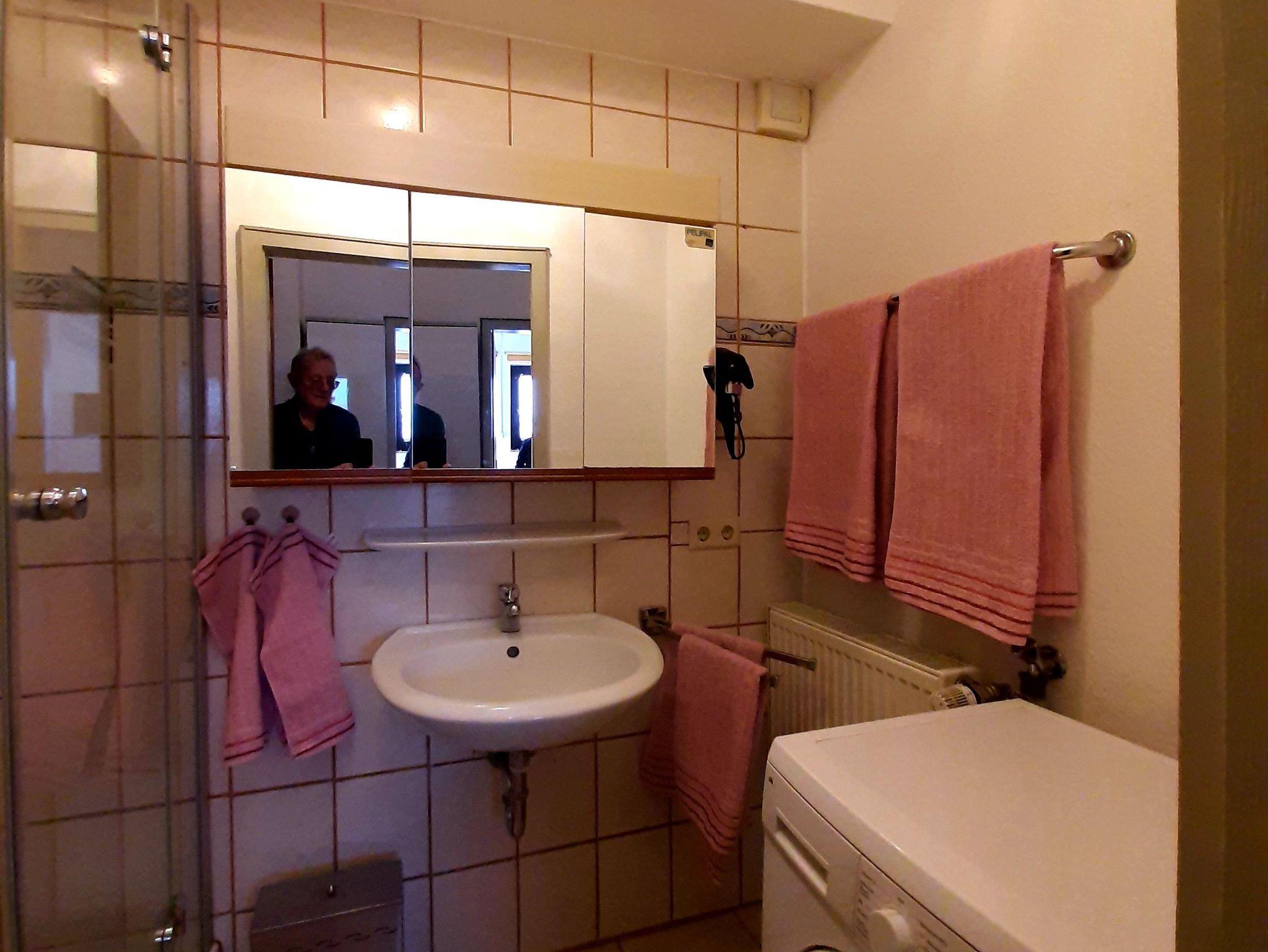 Das kleine Bad (ca. 3 qm) verfügt über eine Dusche, WC, Waschbecken, Spiegelschrank und Waschmaschine. Föhn, Dusche- und Handtücher.