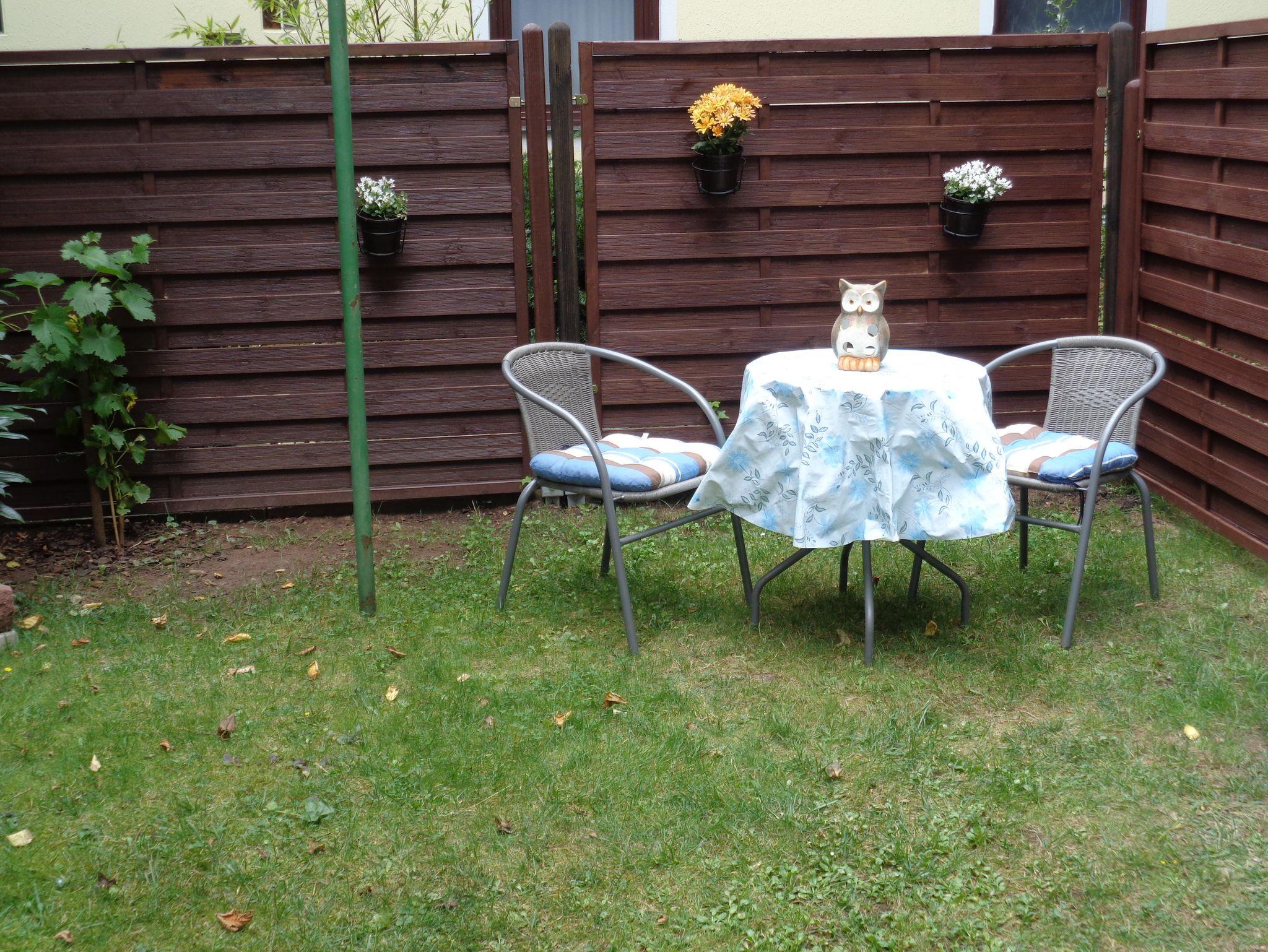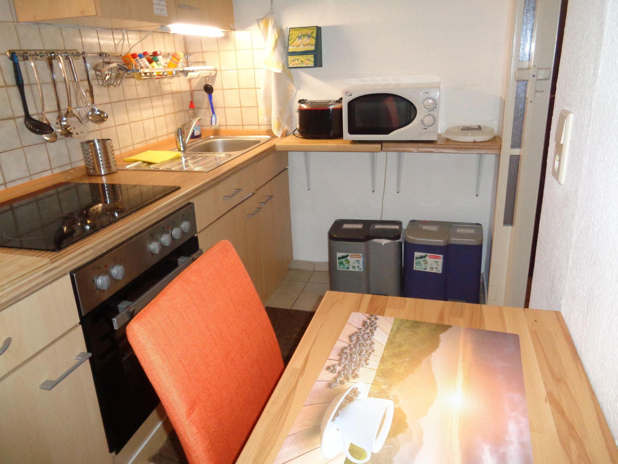 In der Wohnung befindet sich eine kleine Einbauküche (ca. 5 qm), ausgestattet mit Kühlschrank/ Gefrierfach, Elektroherd mit Ceranfeld und Backofen, Spüle, Tisch und 2 Stühle, Mikrowelle, Kaffeemaschine, Wasserkocher und Toaster.