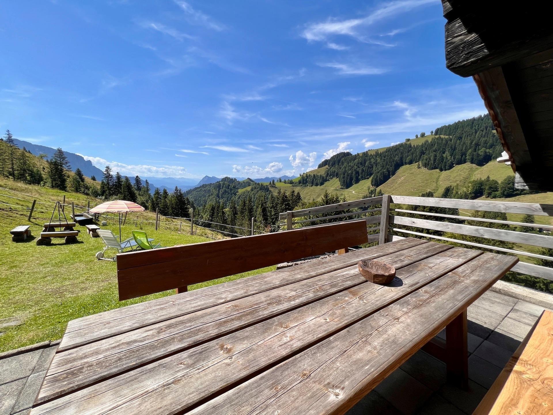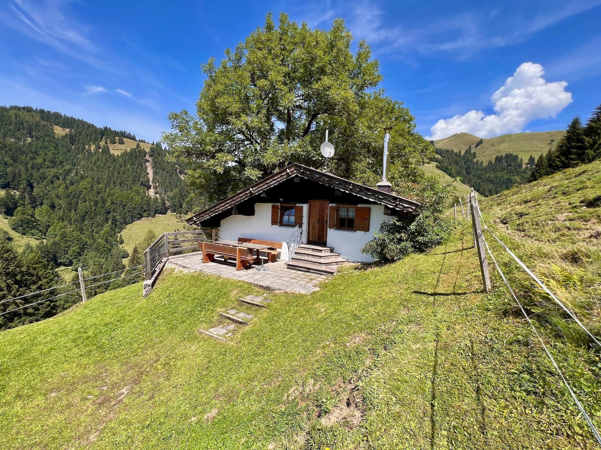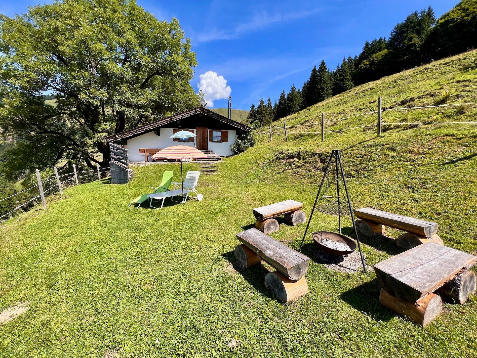 Vor der Hütte bietet sich Ihnen von der Terrasse mit Sitzbank und Tisch ein beeindruckender Blick über die Bergwelt. An der schönen Feuerstelle mit Feuerkorb und Grill können Sie bei schönem Wetter die einmalige Aussicht genießen. Hinter der Alm befindet sich ein kleiner Stall, in dem die Kühe im Sommer Schatten finden.