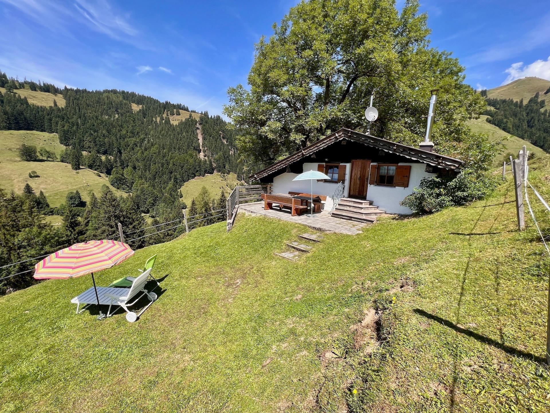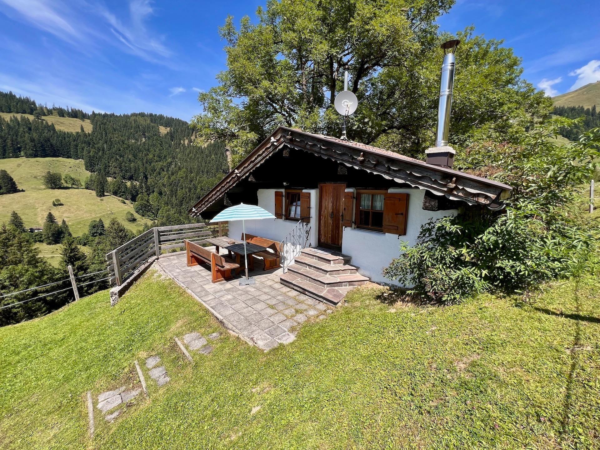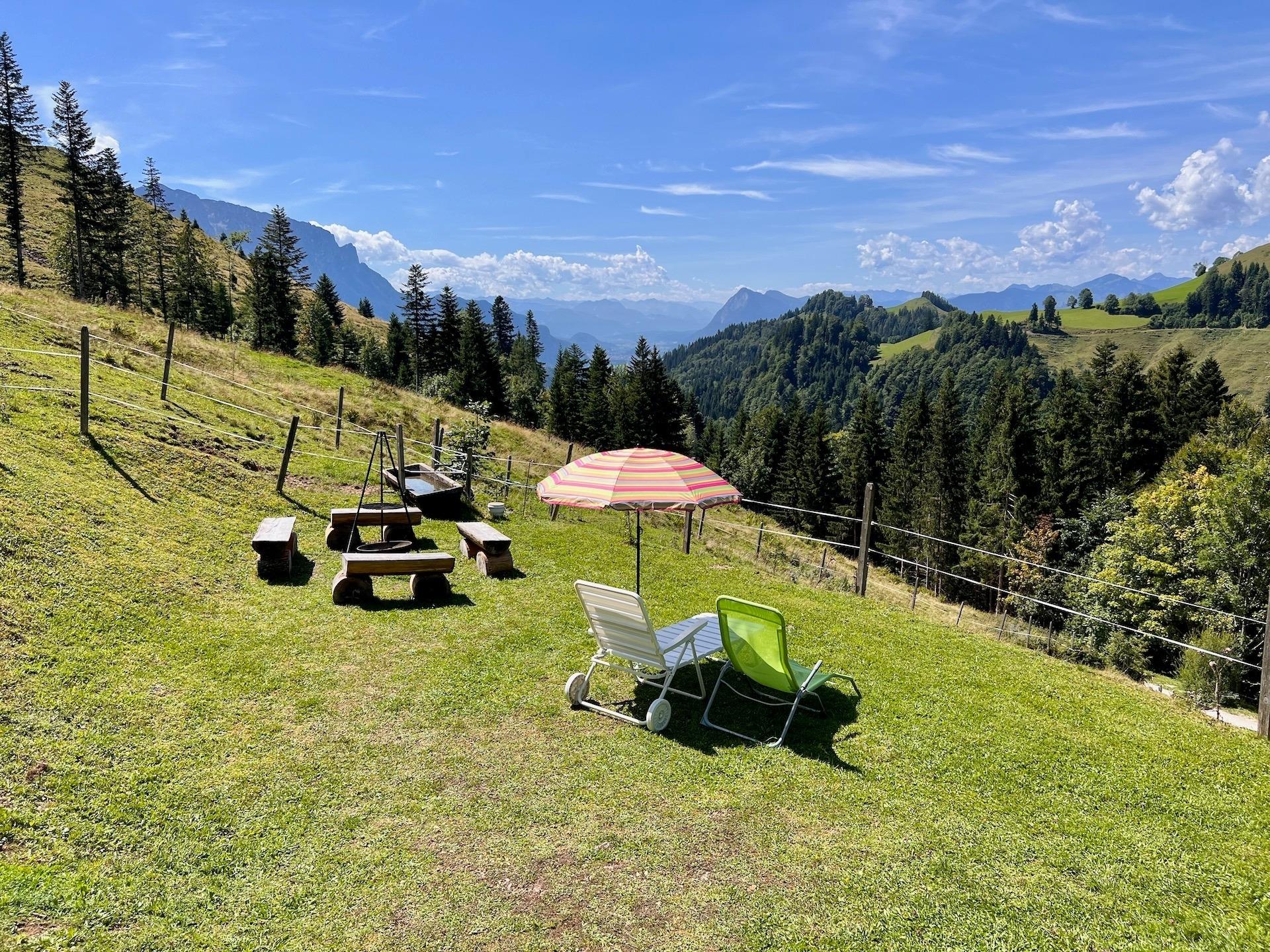 Vor der Hütte bietet sich Ihnen von der Terrasse mit Sitzbank und Tisch ein beeindruckender Blick über die Bergwelt. An der schönen Feuerstelle mit Feuerkorb und Grill können Sie bei schönem Wetter die einmalige Aussicht genießen. Hinter der Alm befindet sich ein kleiner Stall, in dem die Kühe im Sommer Schatten finden.