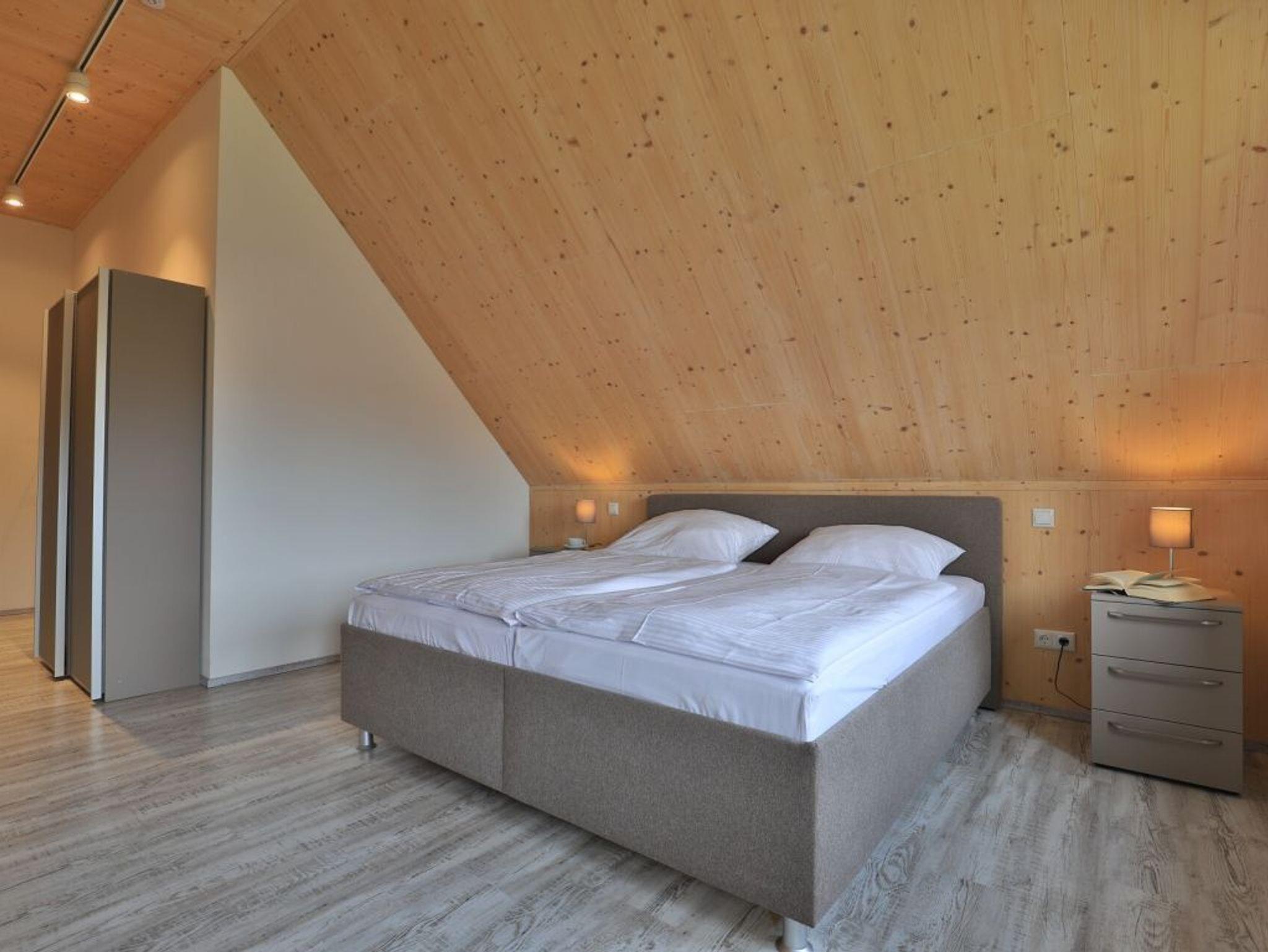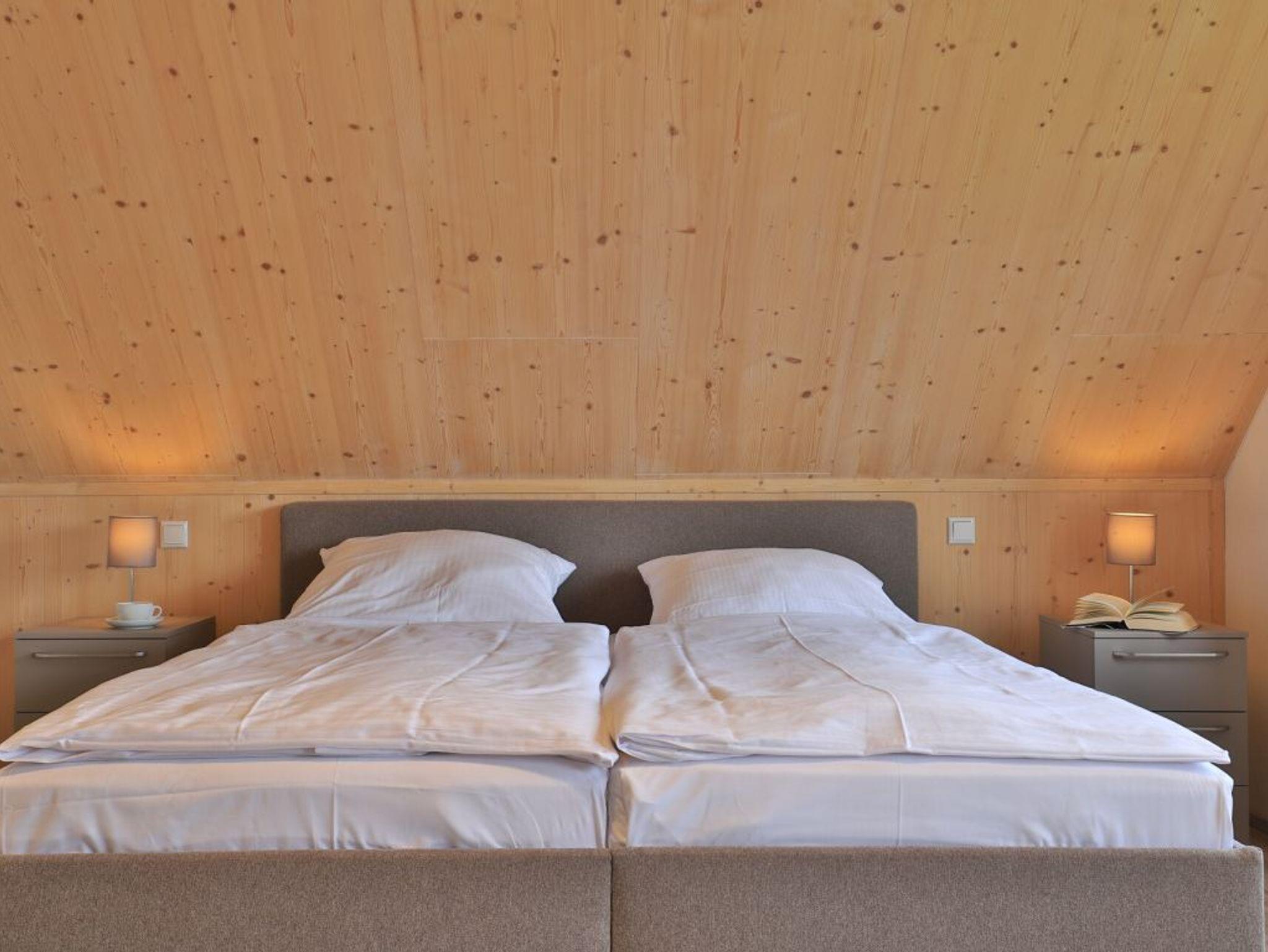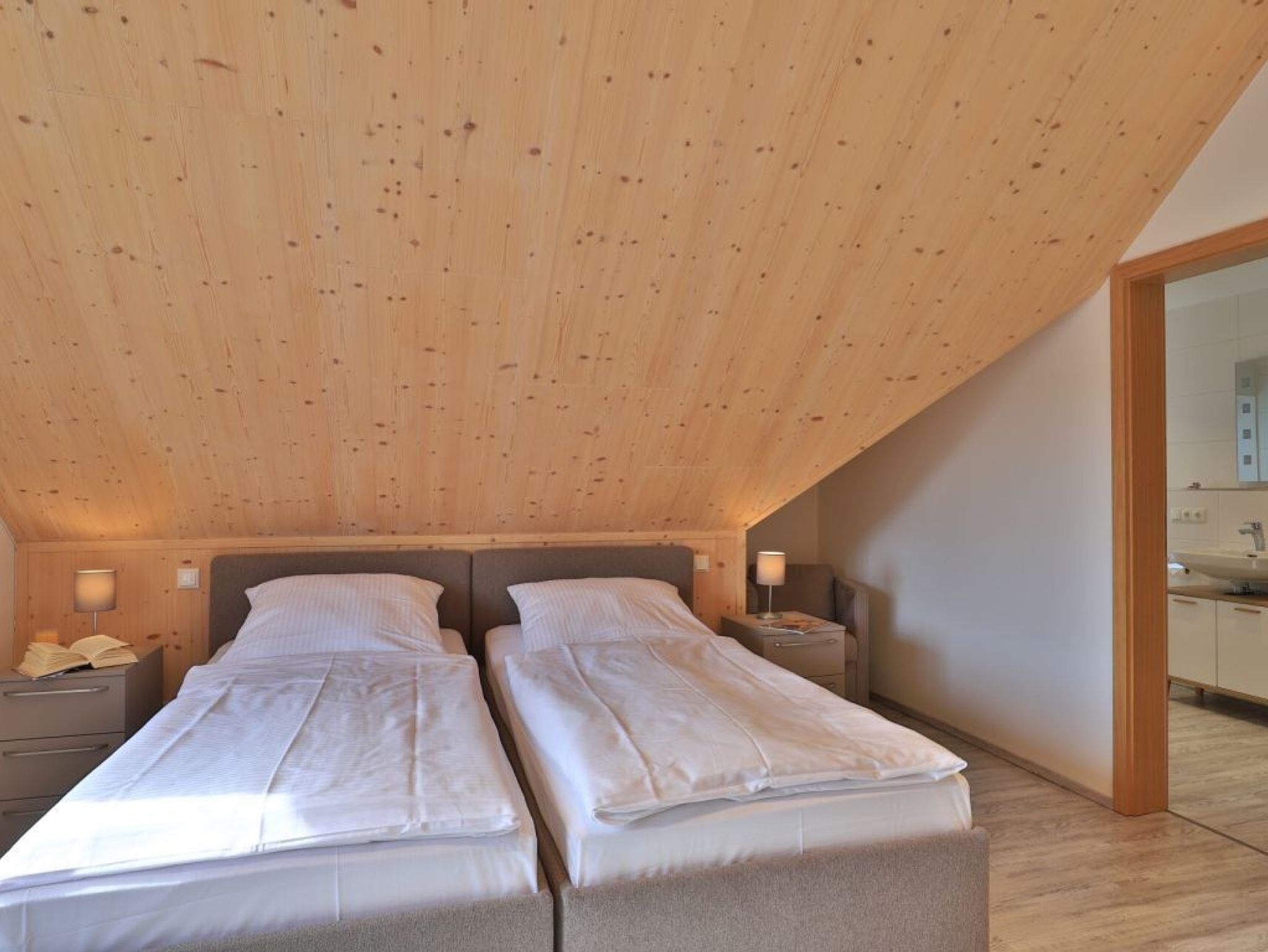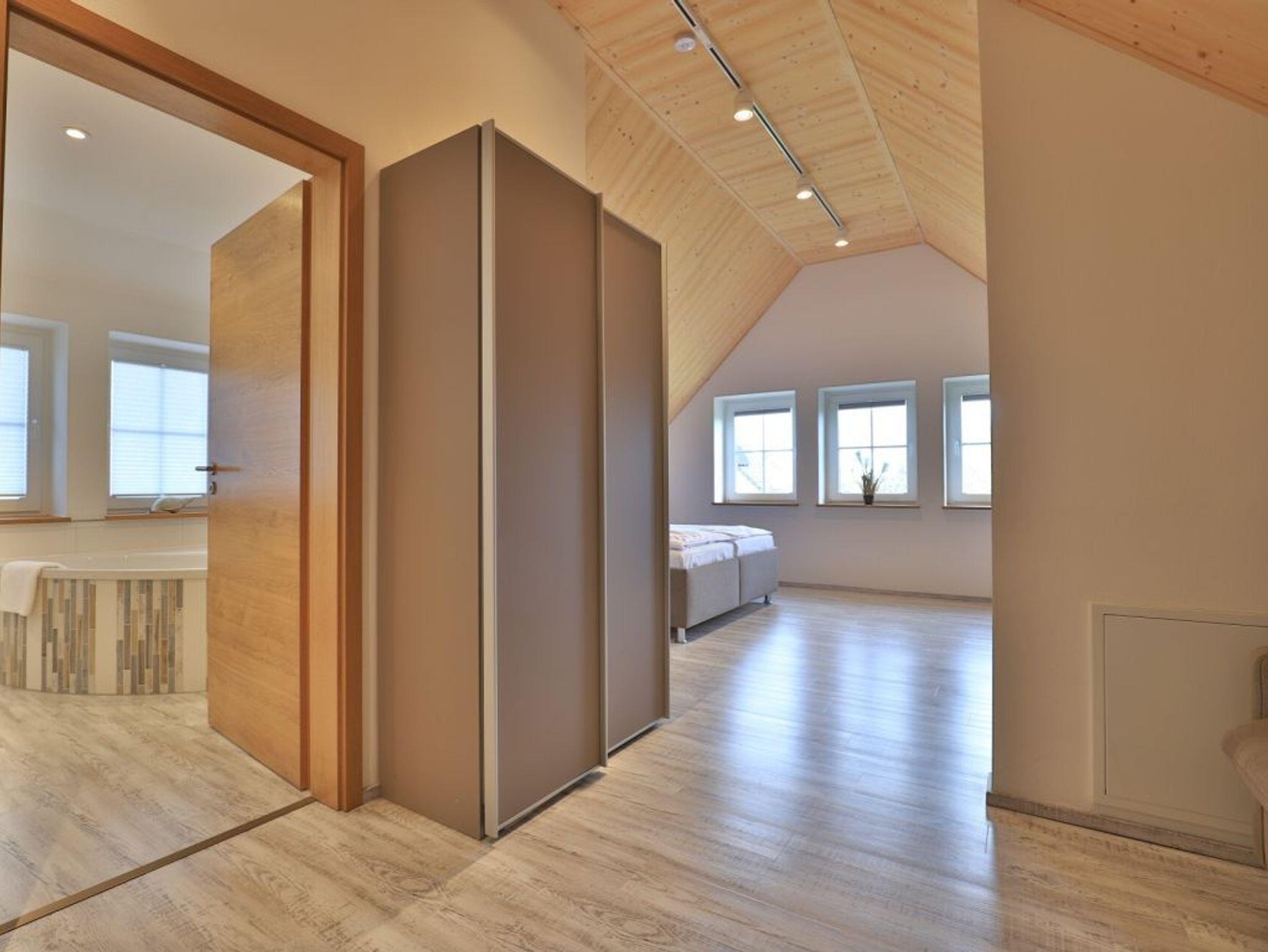 Eine Treppe führt in das Obergeschoss, wo sich zwei weitere Schlafzimmer mit zwei eigenen Bädern befinden. Eines der Schlafbereiche besitzt ein Doppelbett, Fernseher, Duschbad mit Waschtisch, WC. Das weitere, sehr geräumige Familienschlafzimmer bietet ein Doppelbett, ein Schlafsofa ideal für Kinder (160cm x 200cm) und ist zudem mit einem modernen Tageslicht Badezimmer mit Eckbadewanne, Dusche, Waschtisch und WC ausgestattet.