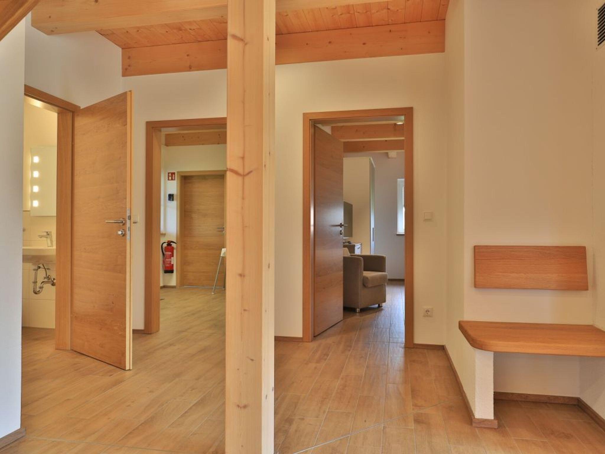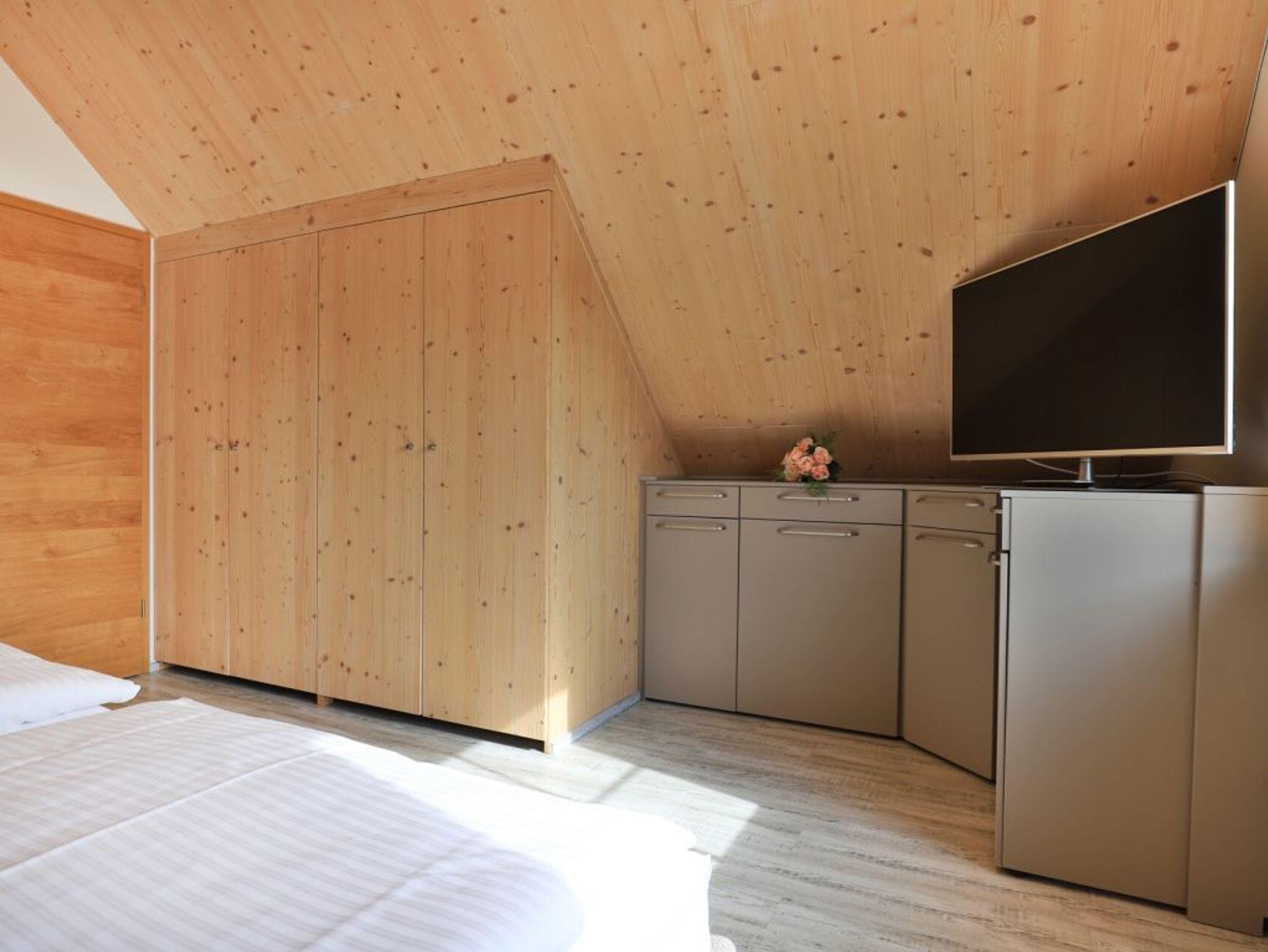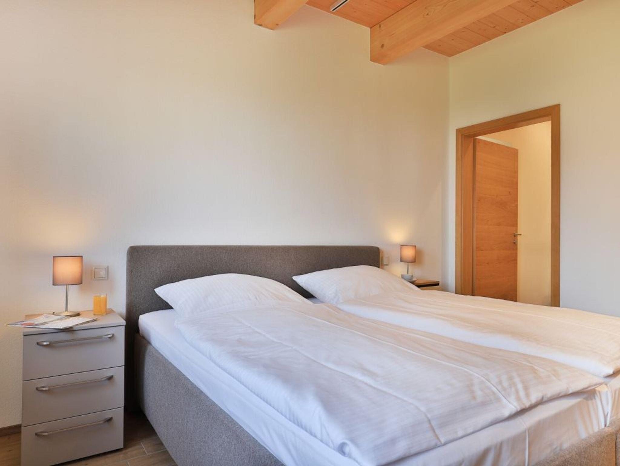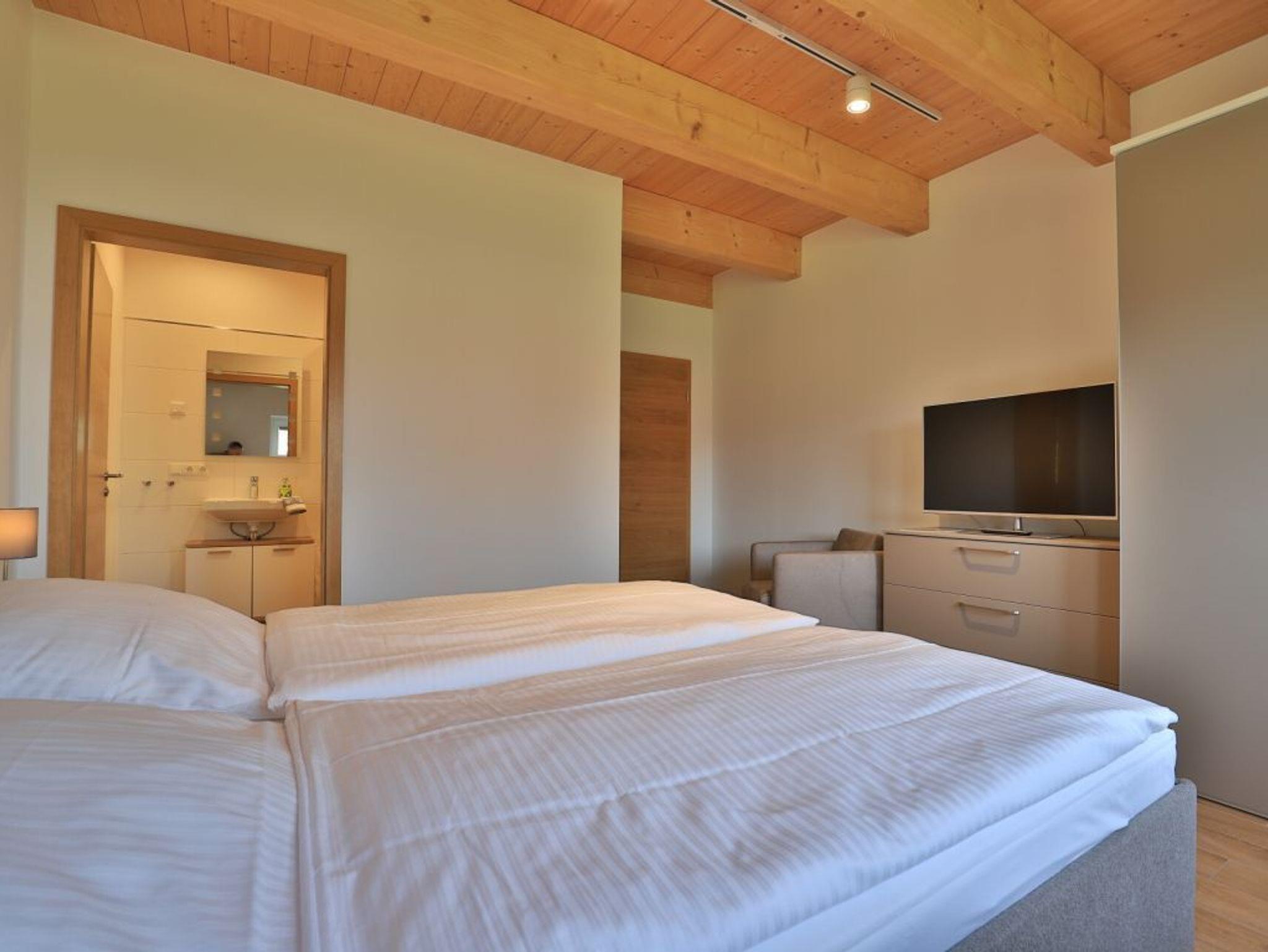 Eine Treppe führt in das Obergeschoss, wo sich zwei weitere Schlafzimmer mit zwei eigenen Bädern befinden. Eines der Schlafbereiche besitzt ein Doppelbett, Fernseher, Duschbad mit Waschtisch, WC. Das weitere, sehr geräumige Familienschlafzimmer bietet ein Doppelbett, ein Schlafsofa ideal für Kinder (160cm x 200cm) und ist zudem mit einem modernen Tageslicht Badezimmer mit Eckbadewanne, Dusche, Waschtisch und WC ausgestattet.