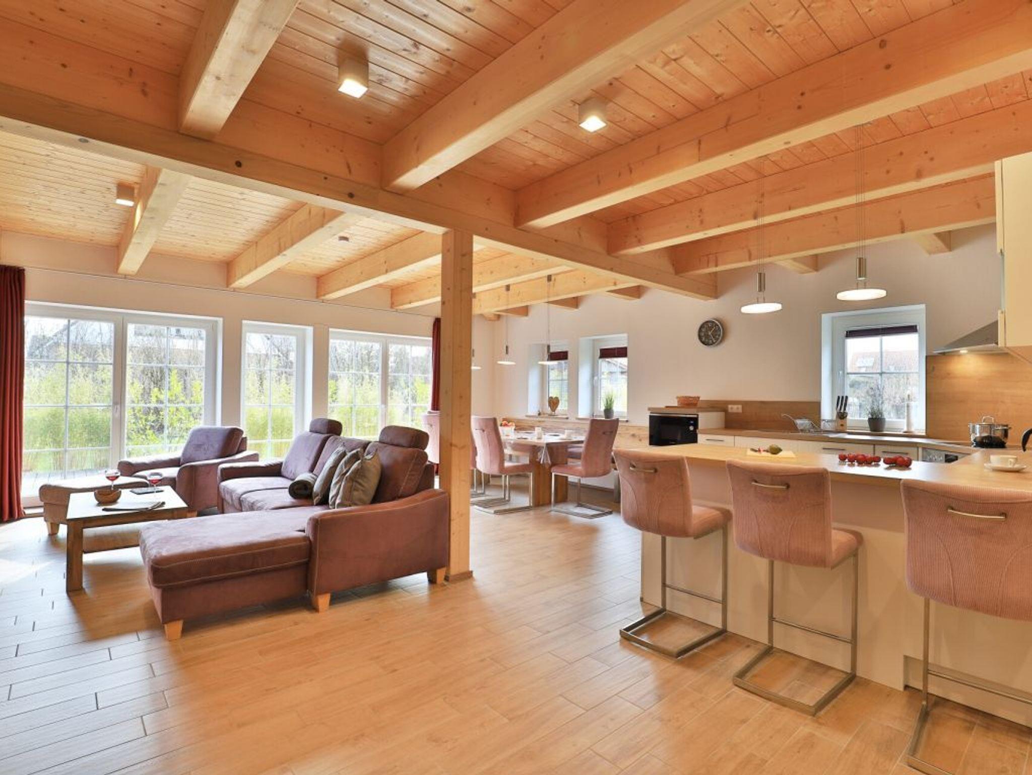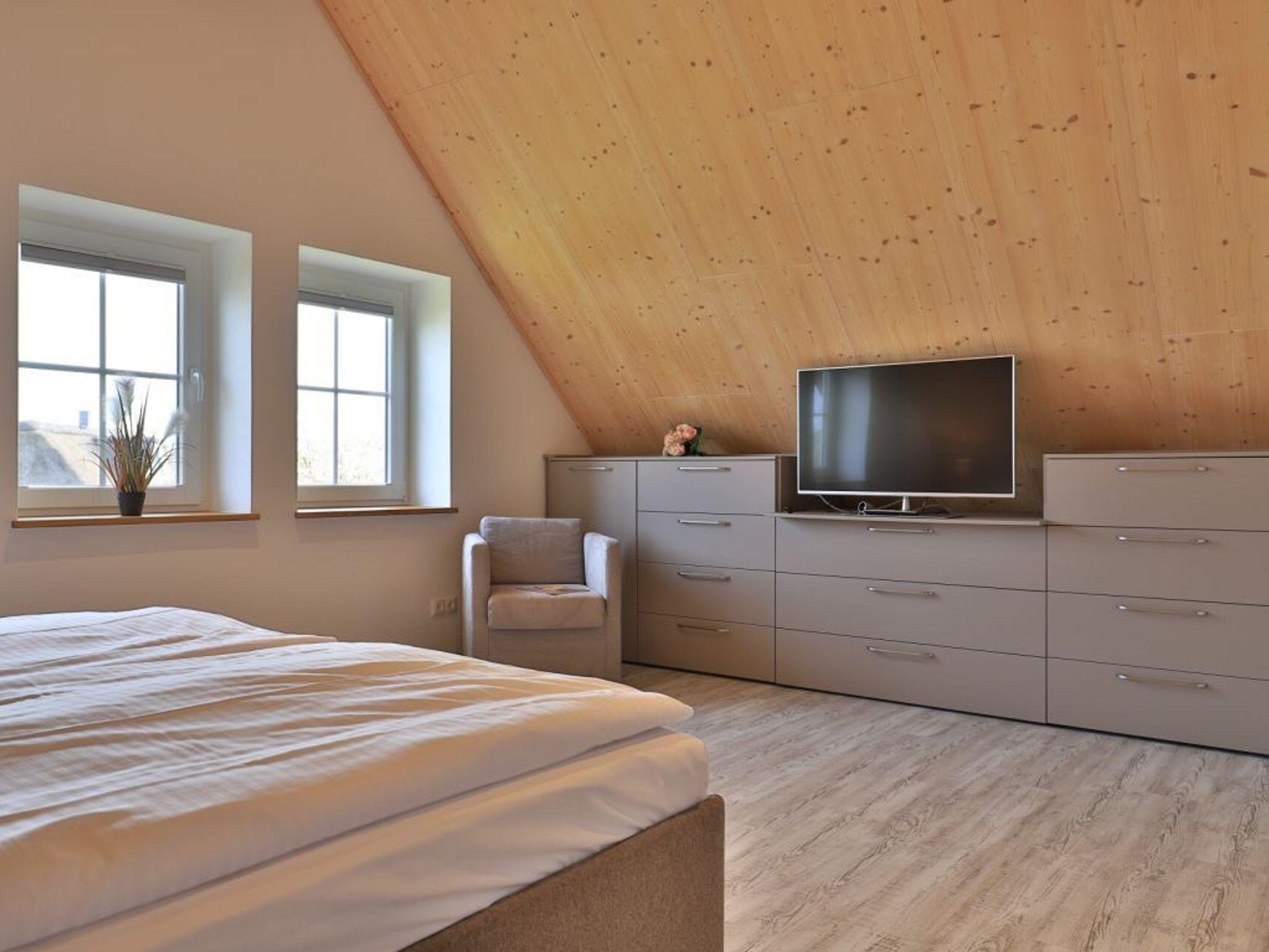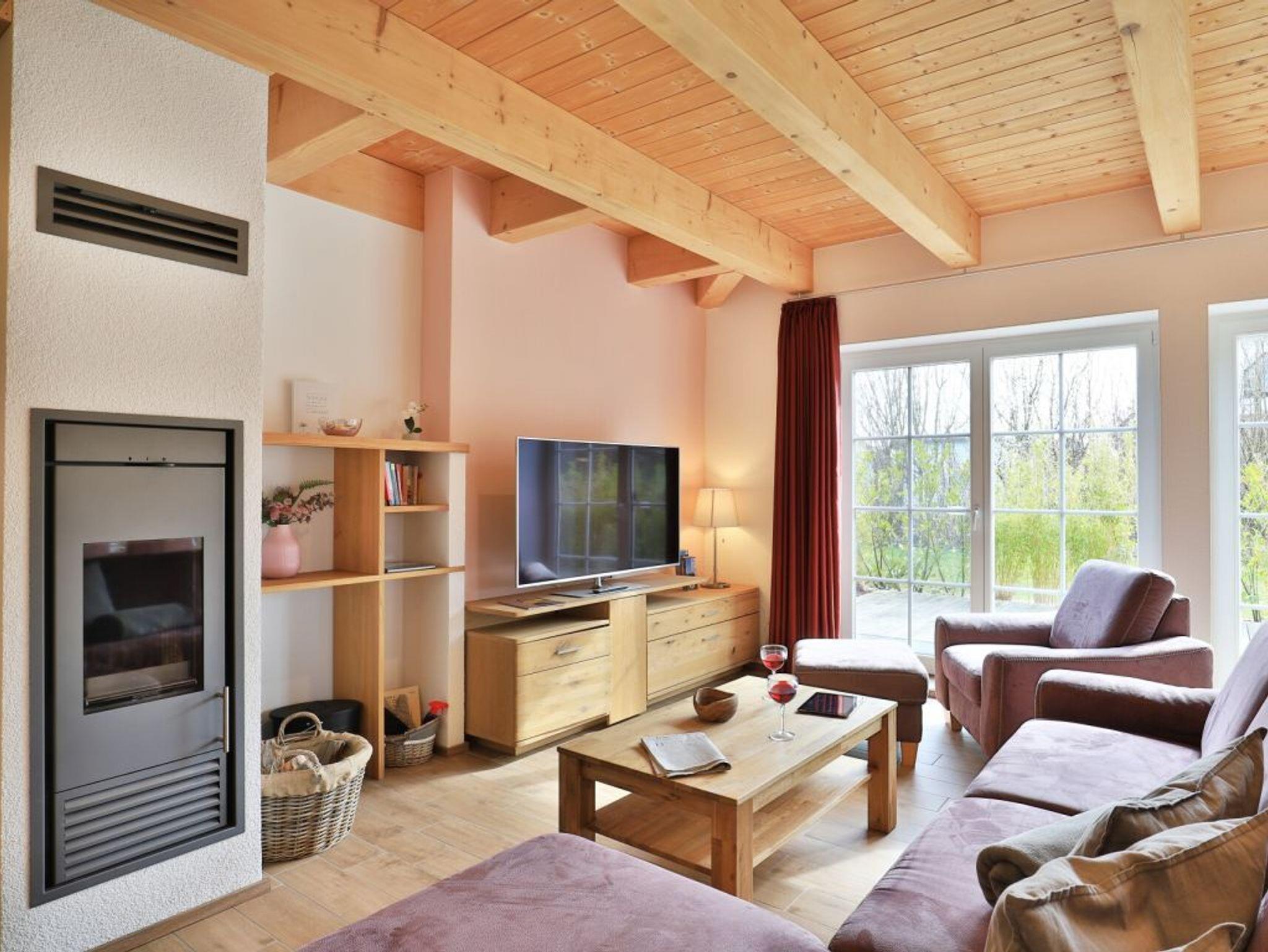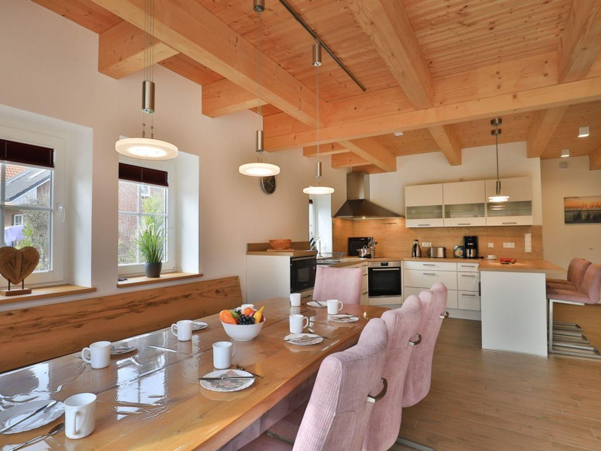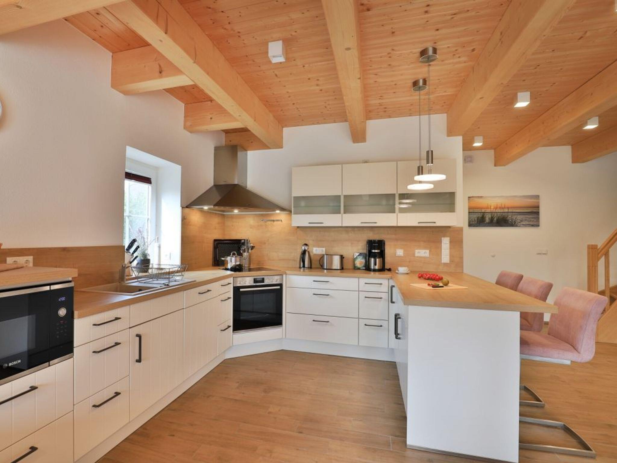 Die Möblierung im Erdgeschossbereich ist stilvoll. Eine Sofalandschaft lädt zur Auszeit am wohligen Kaminofen ein. Fernseher, Musikanlage und auch kostenfreie WLAN-Nutzung sind vorhanden. Vom Wohnbereich gelangen Sie eine saisonal möblierte Terrasse in süd-/westliche Ausrichtung. Der große Garten ist ideal für Kinder und bietet zudem eine Grillmöglichkeit. Die offene Küche ist in den Wohnbereich integriert und verfügt über ein Induktionskochfeld, Backofen, Mikrowelle, Kühlschrank, Gefrierschrank, Kaffeemaschine, Toaster, Wasserkocher, Geschirrspüler u.v.m. Ihre zubereiteten Mahlzeiten nehmen Sie an einem großen Esstisch zu sich. Bei schönem Wetter, bestimmt auch gerne auf der Terrasse mit Blick in den Garten. Eines der separaten Komfort- Schlafzimmer befindet sich auf der Wohnebene. Dieses Schlafzimmer ist mit einem Doppelbett, TV und einem eigenen Bad mit ebenerdiger Dusche ausgestattet. Auch ein Hauswirtschaftsraum mit kostenfreier Waschmaschine & Wäschetrocknernutzung sowie ein Gäste-WC sind im Erdgeschoss vorhanden.