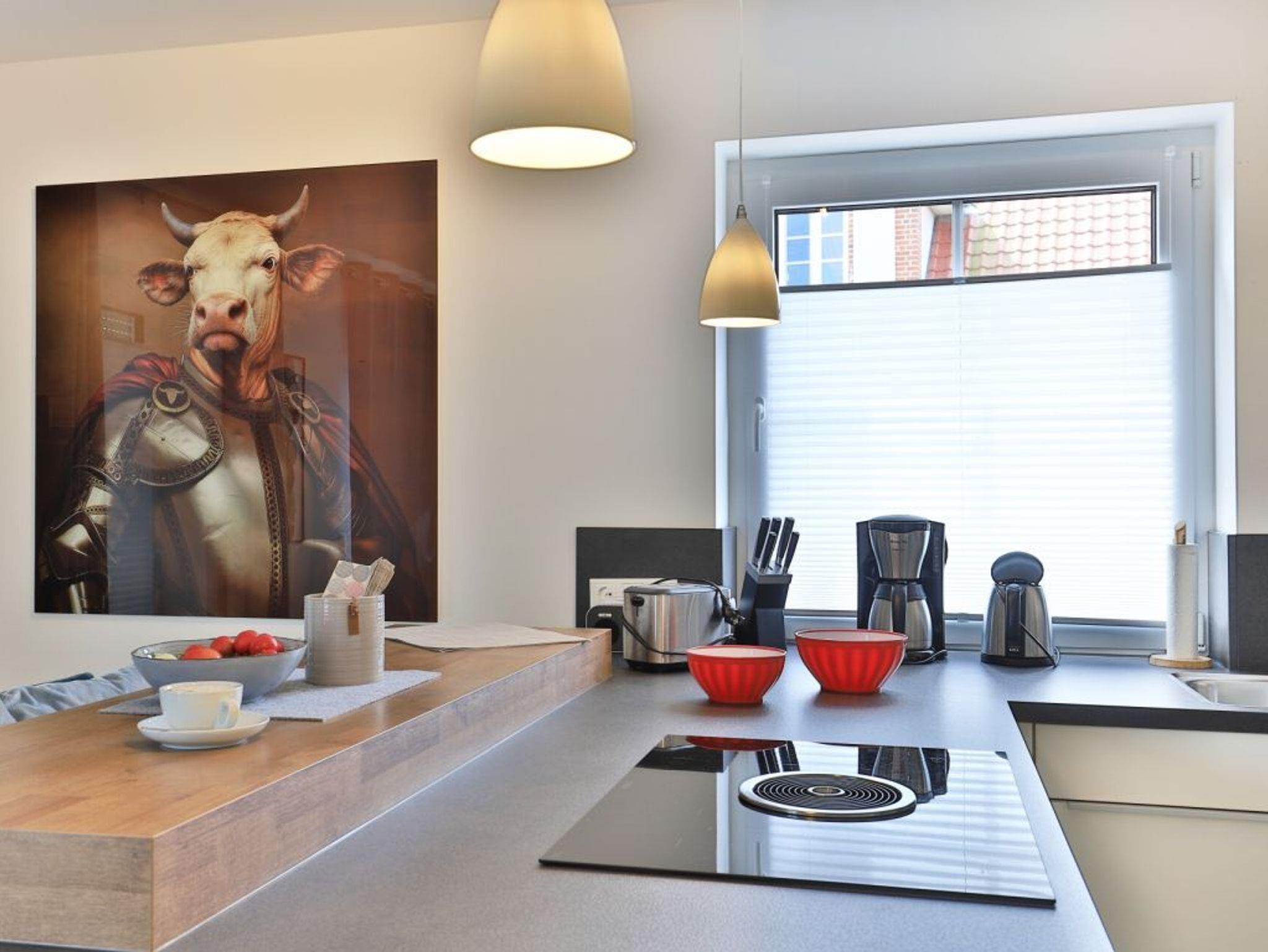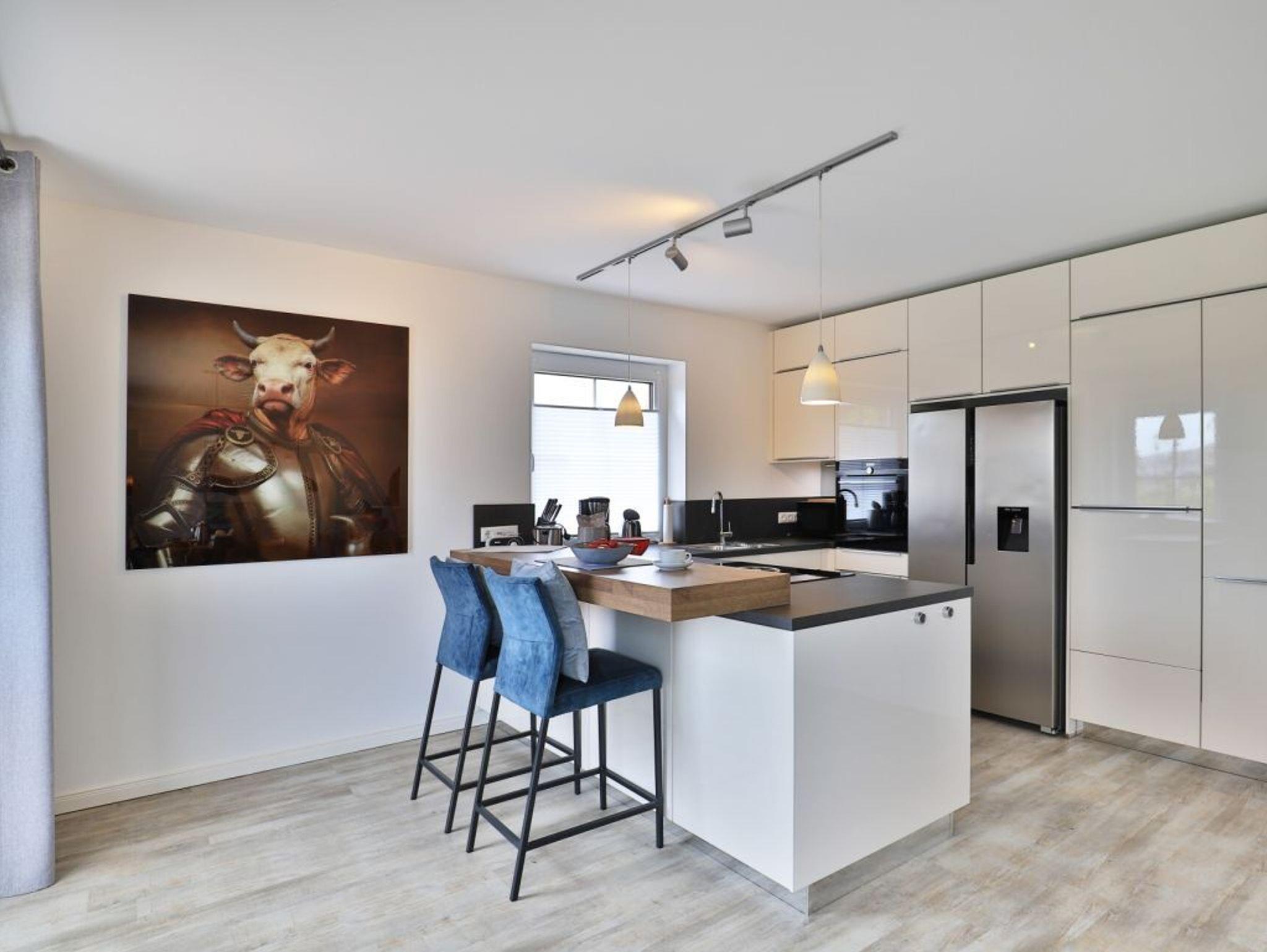 Die in den Wohnbereich integrierte, durch einen Tresen getrennte, Küchenzeile ist modern und mit Herd, Backofen, Mikrowelle, Dunstabzug, Kühlschrank mit Gefrierfach, Geschirrspüler, Kaffeemaschine, Toaster, Wasserkocher u.v.m. bestens ausgestattet.