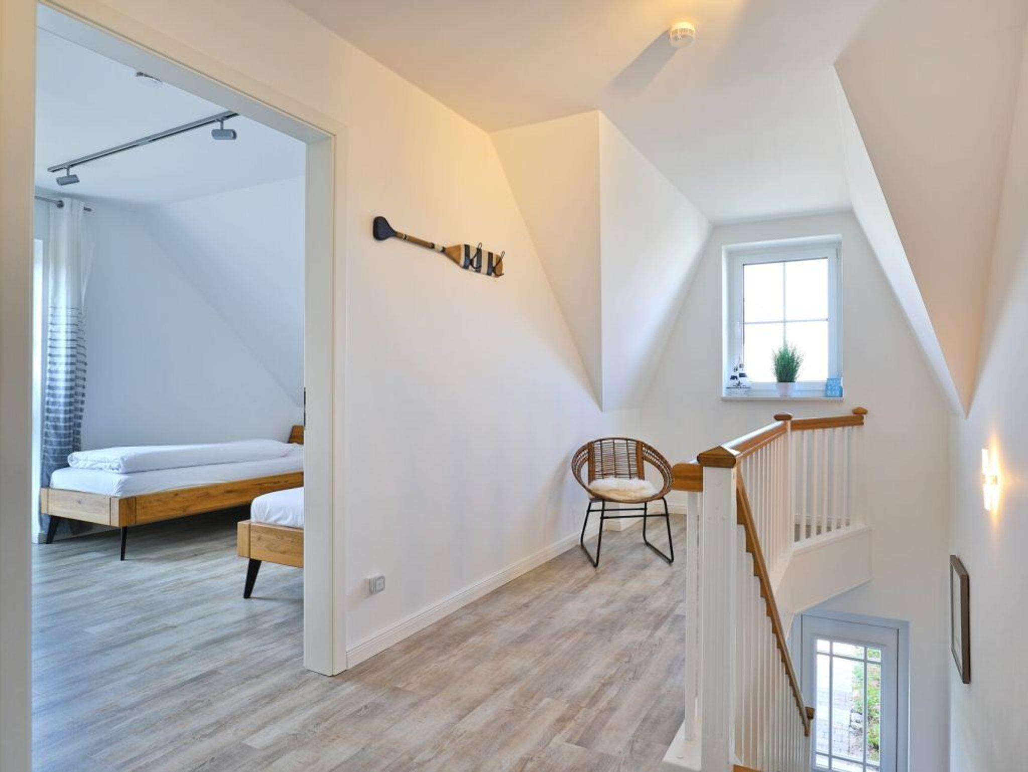 Über eine Treppe im Eingangsflur gelangen Sie in die obere Etage, wo sich zwei weitere Komfort Schlafzimmer befinden. 1x mit Doppelbett, Kleiderschrank, TV sowie Balkonzugang mit Blick über die Felder, 1x mit zwei Einzelbetten, Kleiderschrank und TV. Idealerweise besitzt auch diese Etage ein großzügiges Tageslicht Badezimmer mit Eckbadewanne, bodengleicher Dusche, zwei Waschtische und WC.