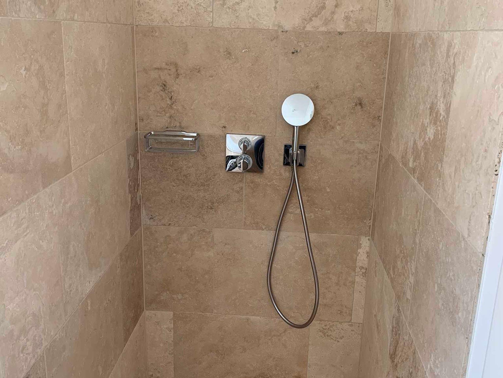 Dusche, Badewanne und Travertinsteinplatten sorgen für ein mediterranes