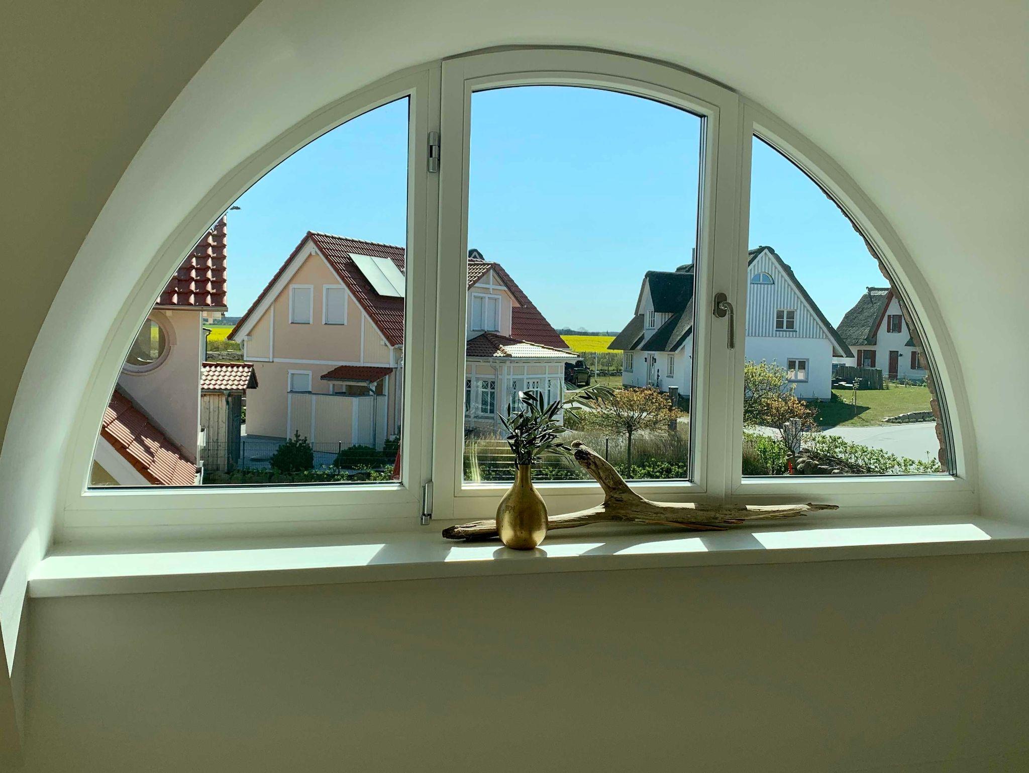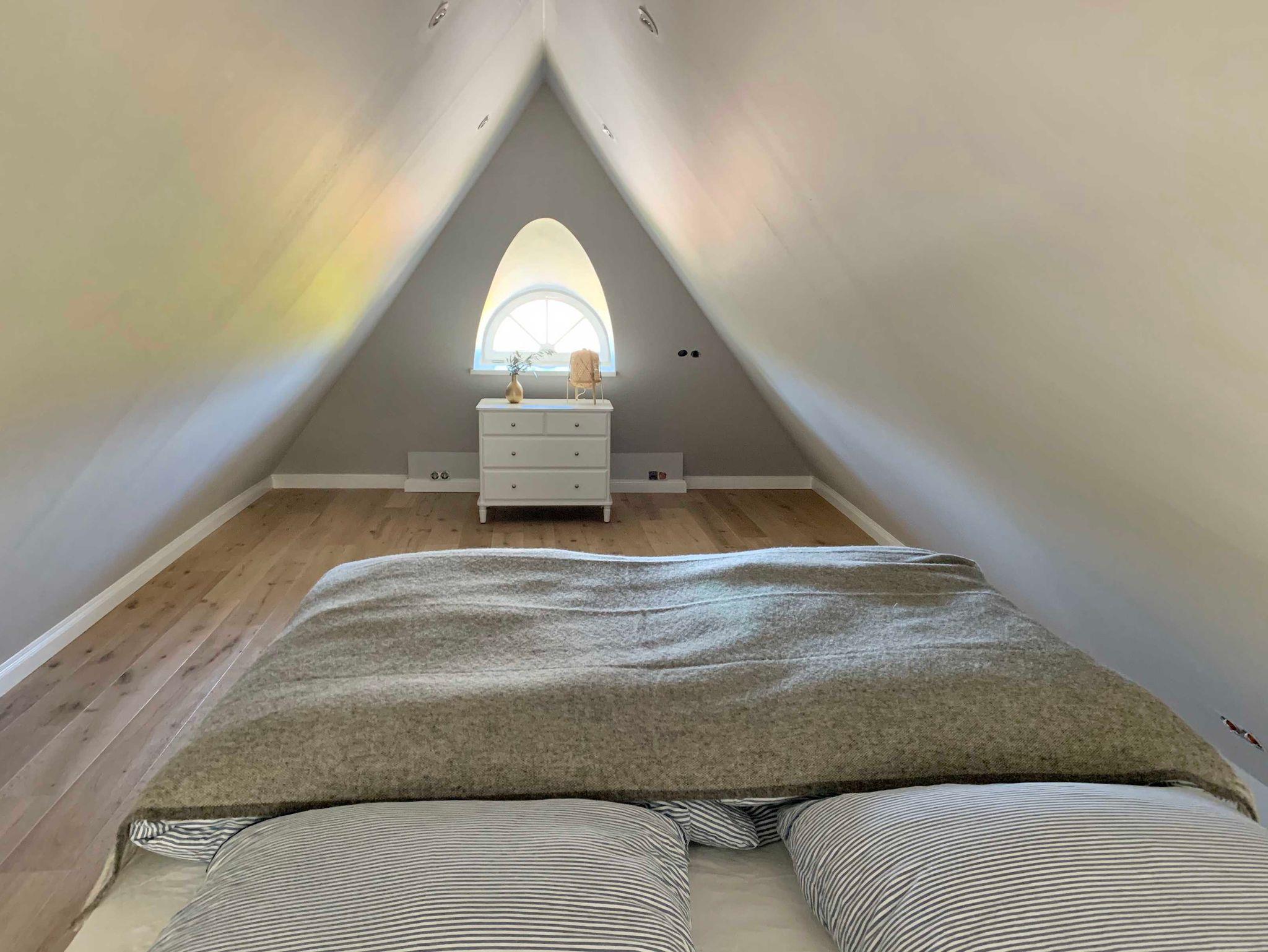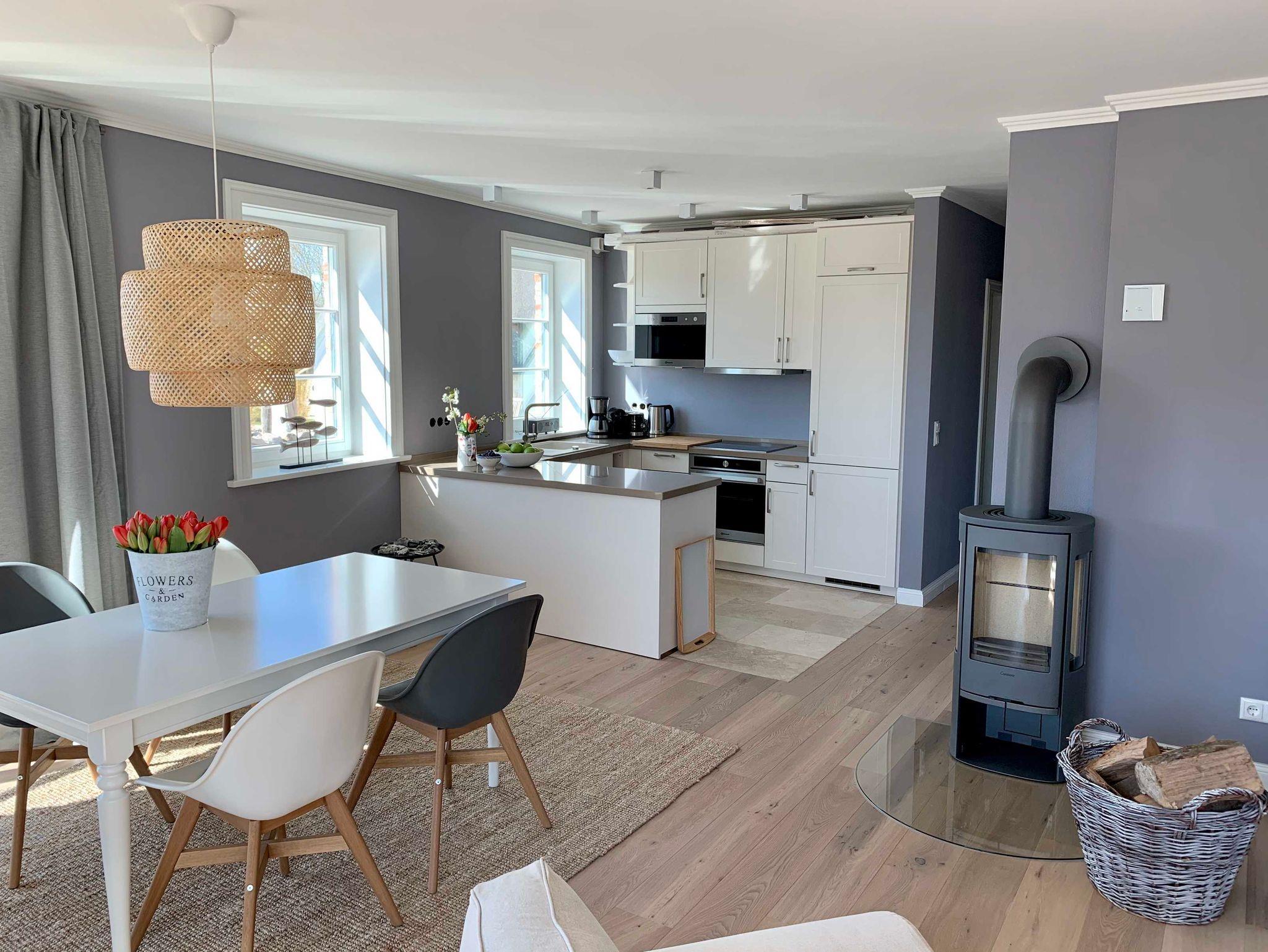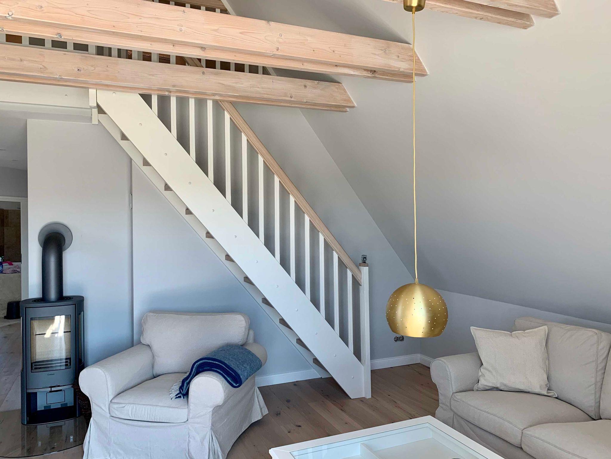 mit dänischem Kaminofen. Die runden Gaubenfenster unterstreichen hier das