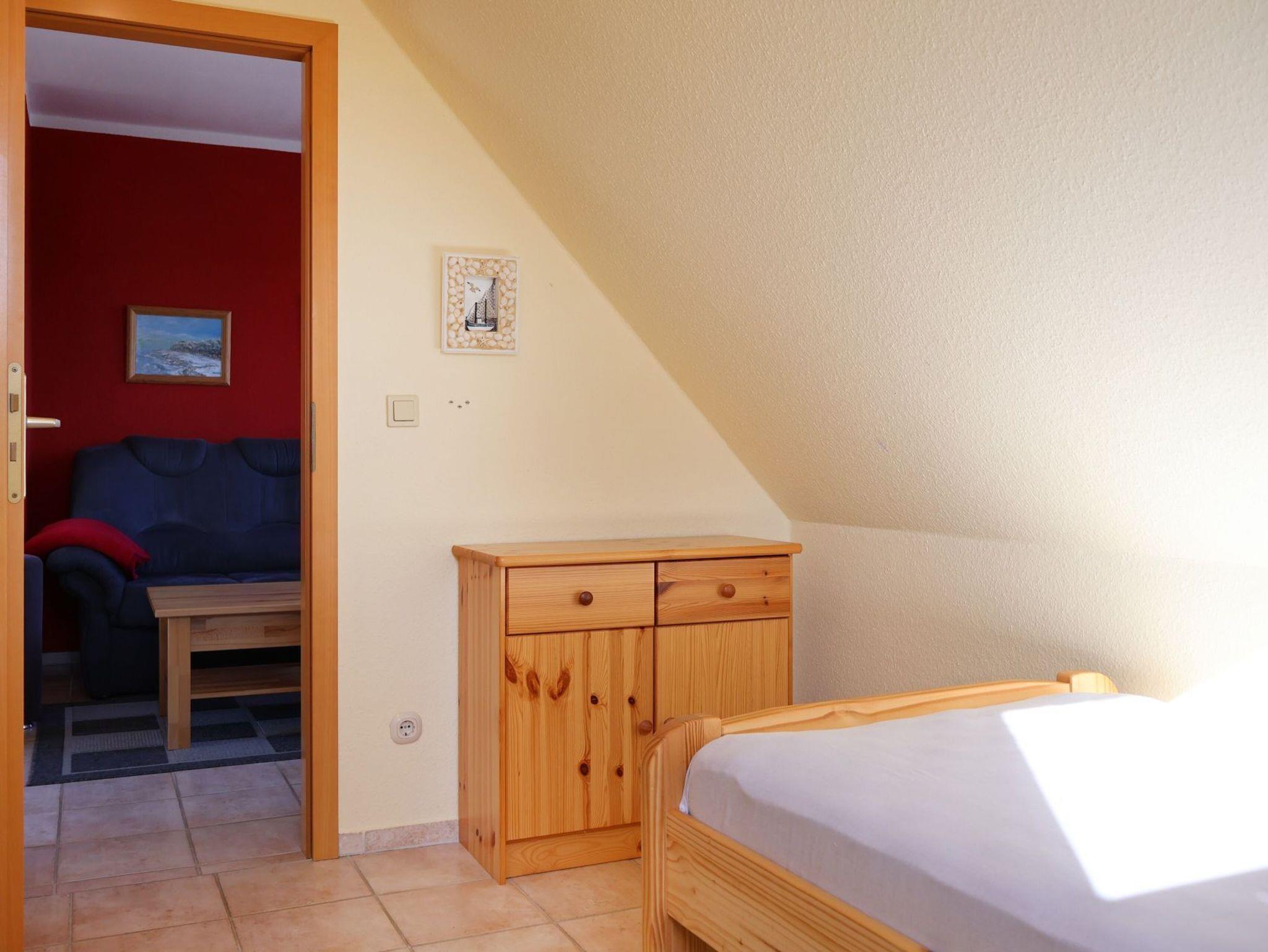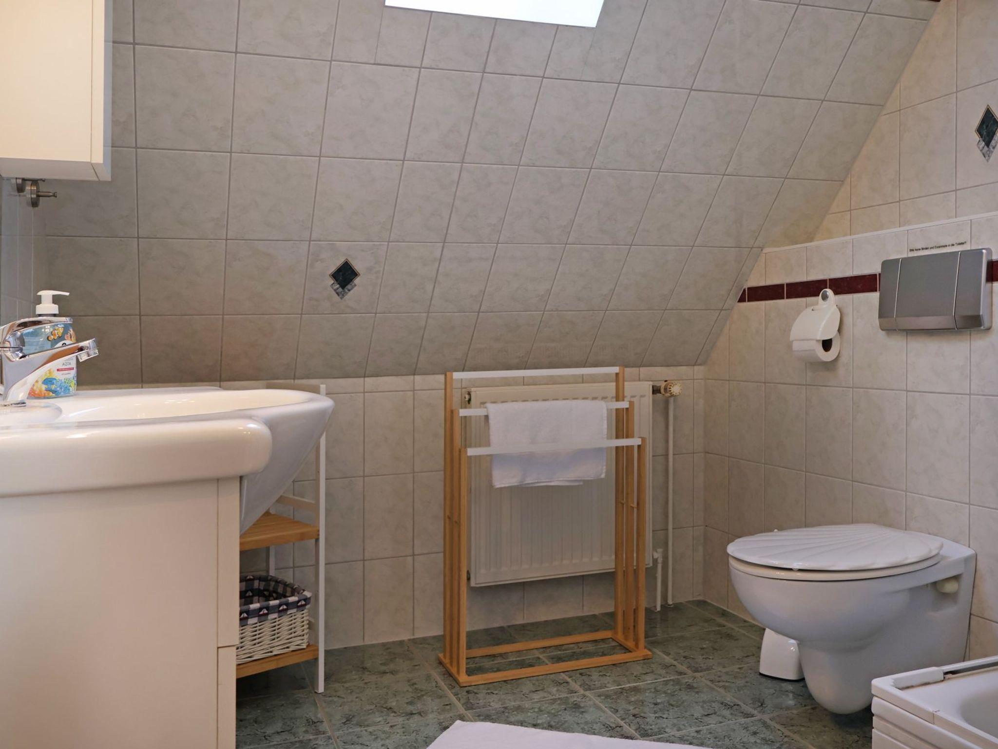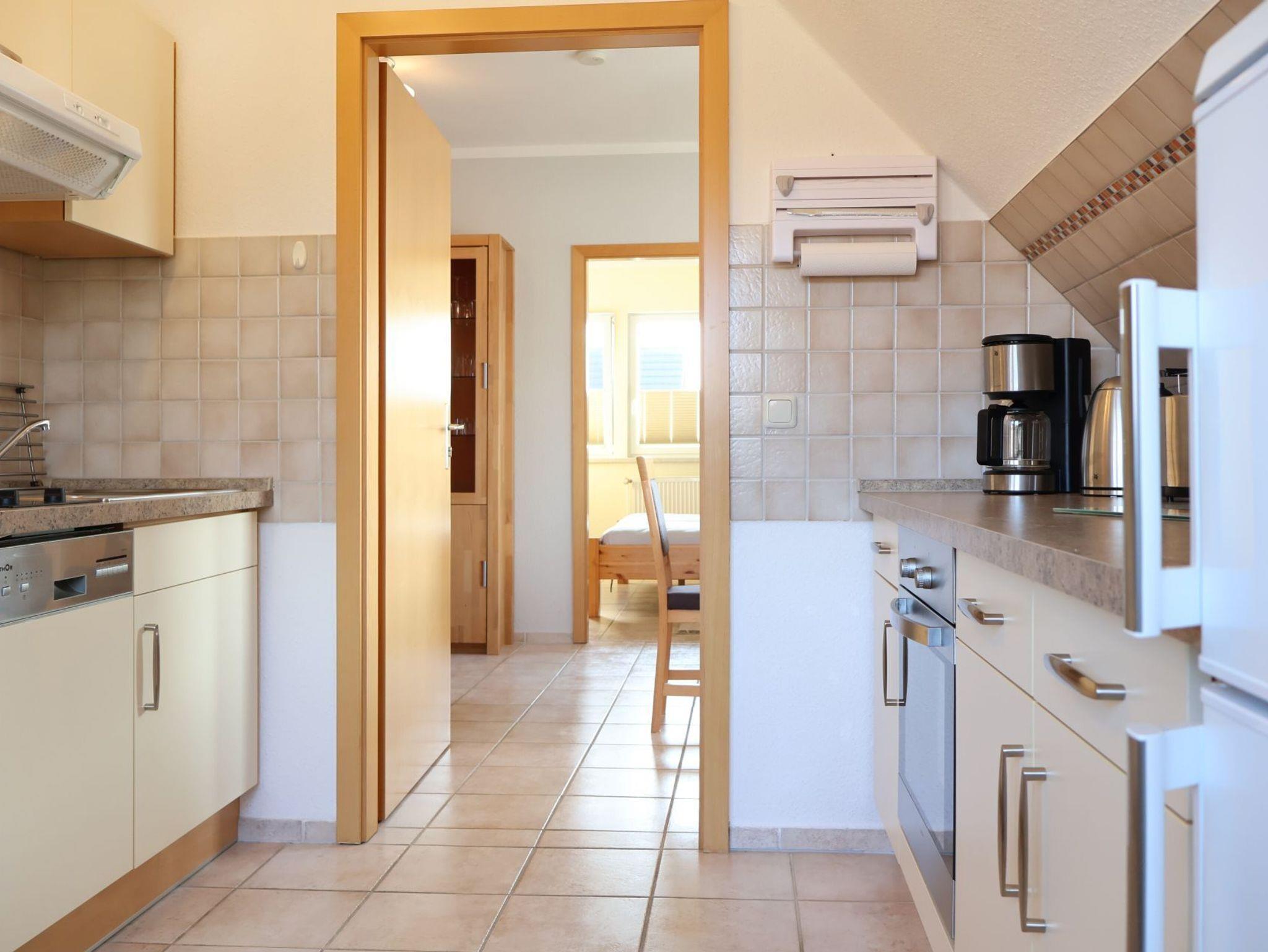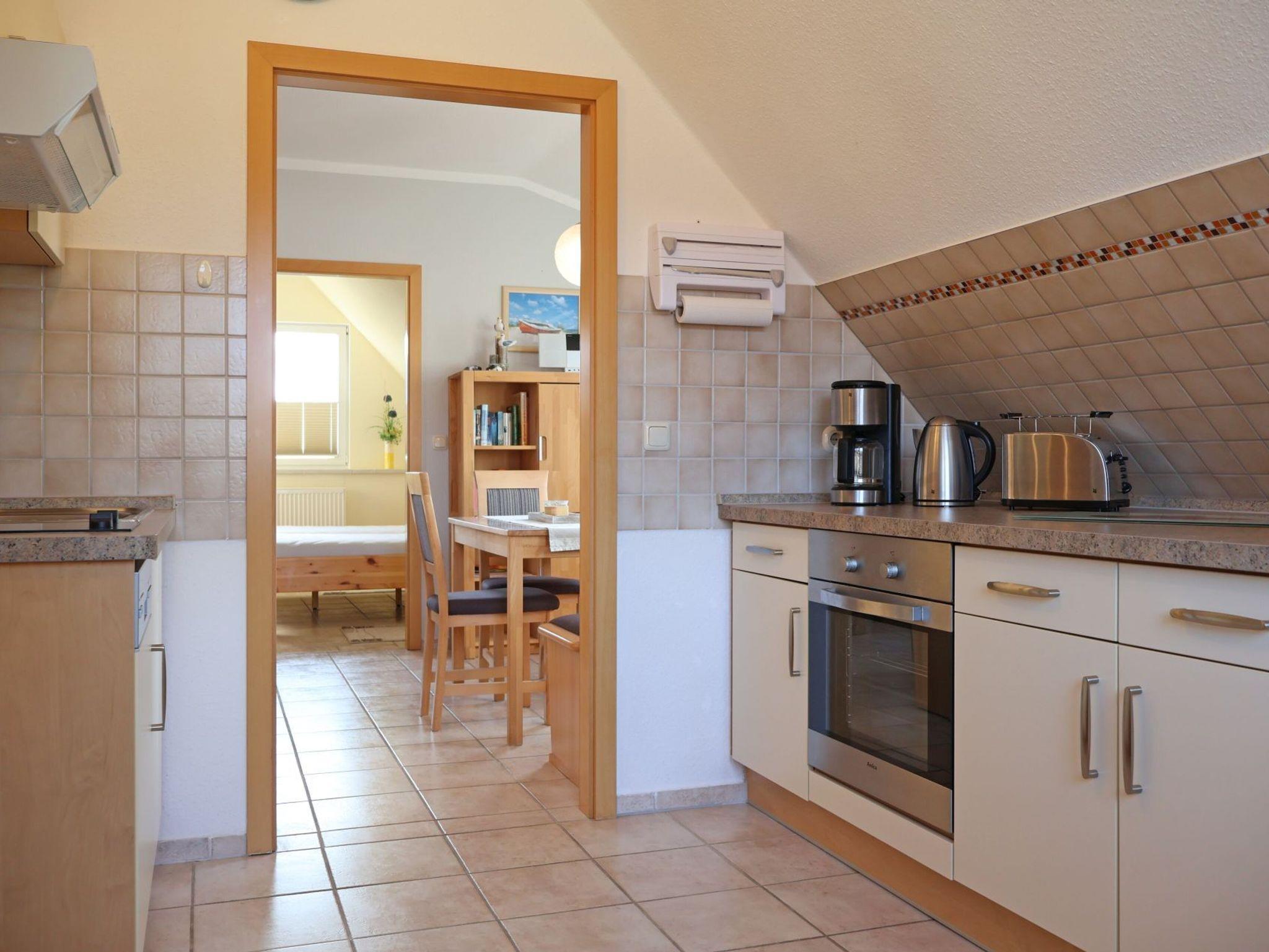 Das gut ausgestattete 3-Zimmer Dachgeschoss Appartement besitzt eine Wohnfläche von 55qm und ist ideal für einen Urlaub mit bis zu 3 Personen. Sie erreichen die Wohnung über eine Treppe. Im Wohn-/Essbereich sind eine Sofagarnitur, zwei Sessel, Fernseher vorhanden. WLAN steht ohne Gebühr zur Verfügung. Selbstversorgern bietet eine Einbauküche gute Bedingungen mit: Ceranfeldherd, Backofen, Mikrowelle, Kühlschrank mit sep. Gefrierfach, Kaffeemaschine, Wasserkocher, Toaster, Geschirrspüler u.v.m. Ihre Mahlzeiten nehmen Sie am Esstisch zu sich. Ebenso können Sie den hauseigenen Garten mitnutzen.