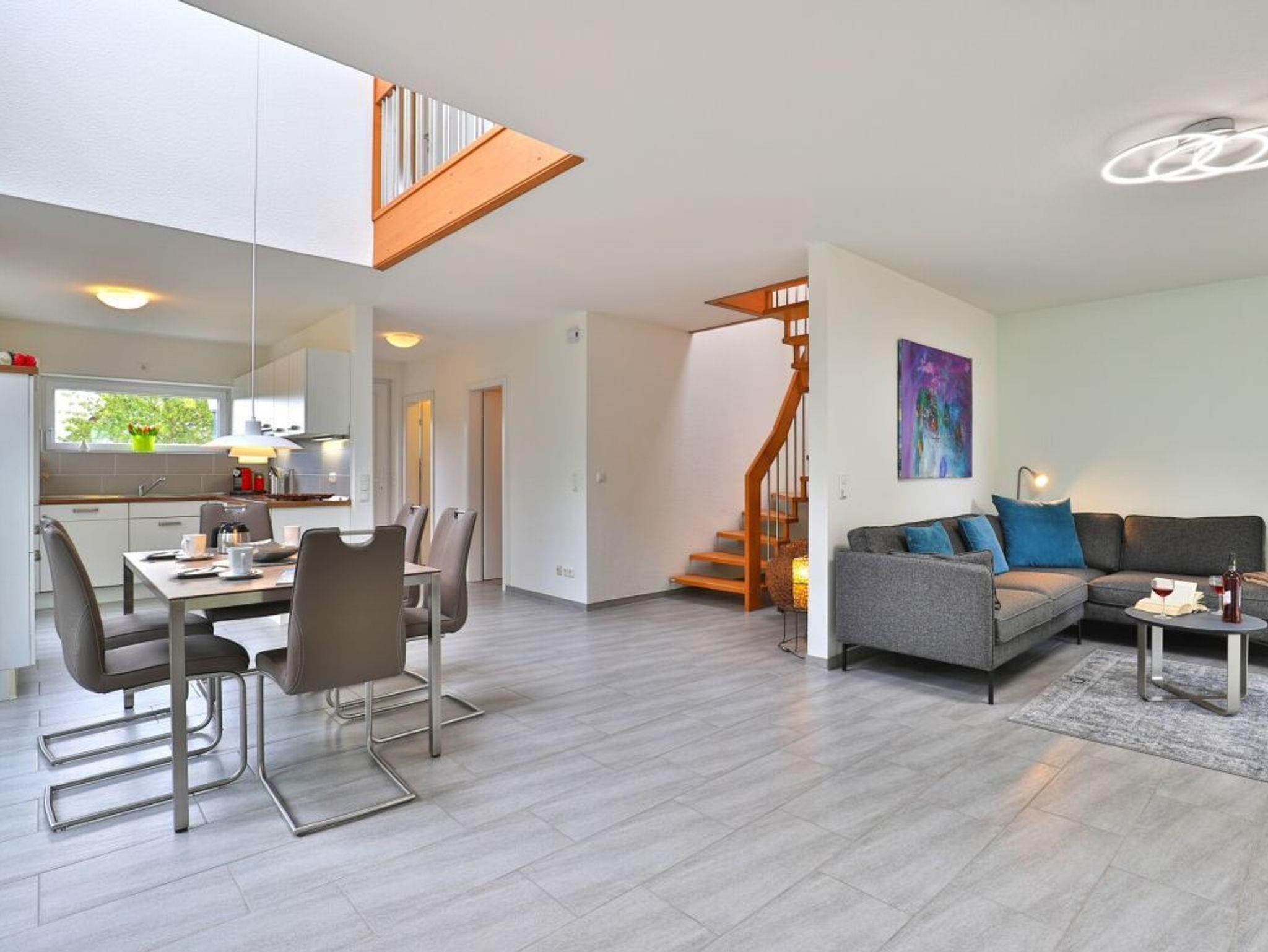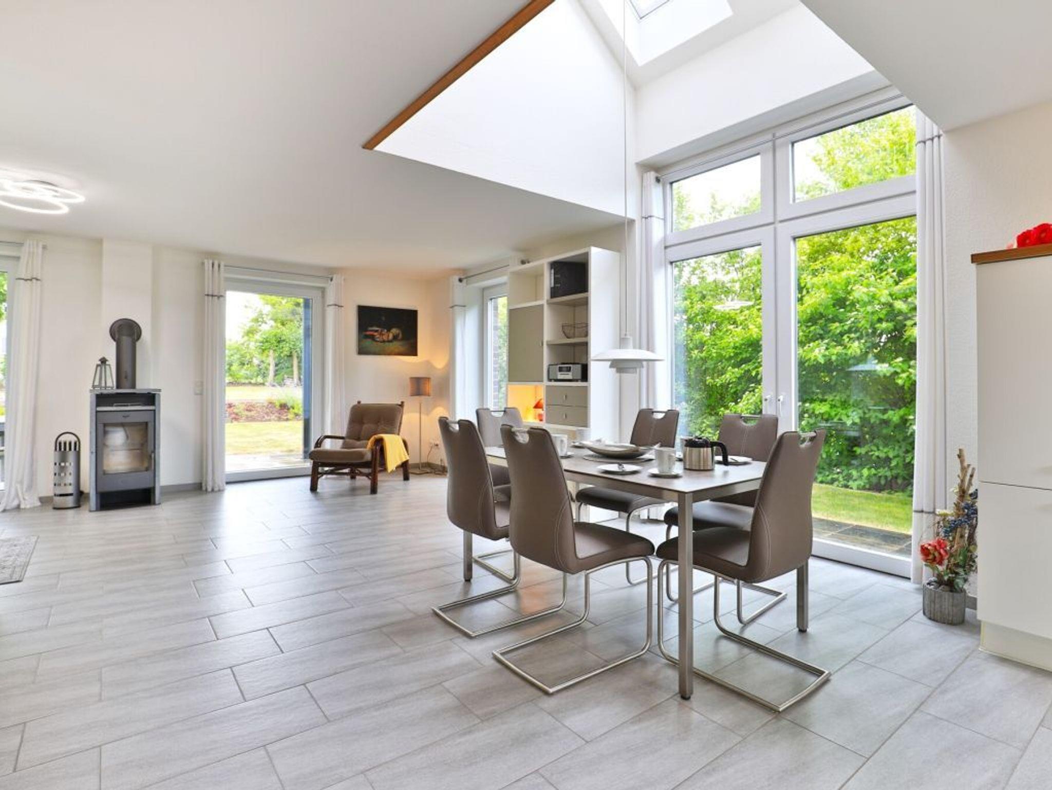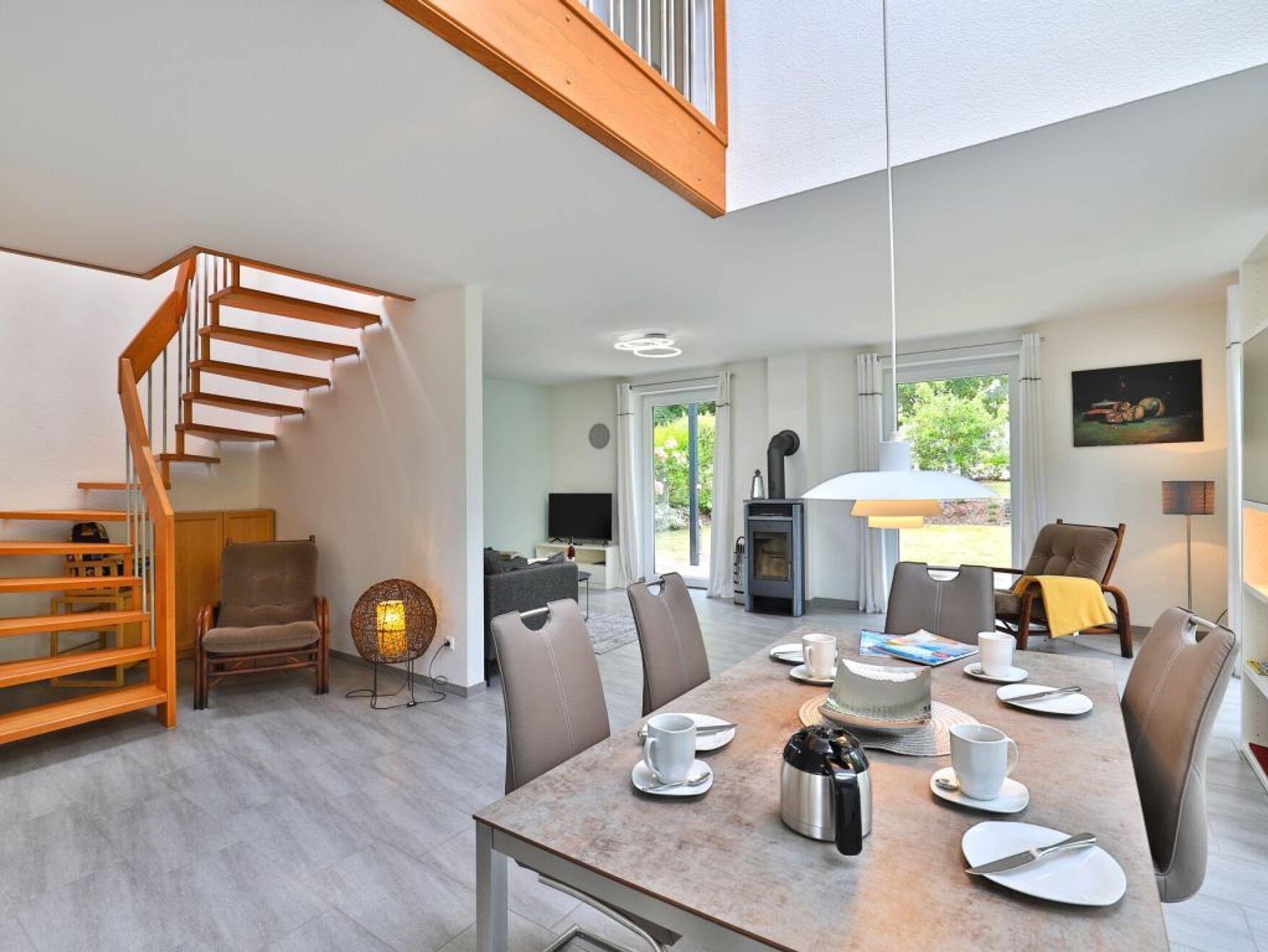 Willkommen in Ihrem komfortablen Feriendomizil. Im Erdgeschoss erwartet Sie ein stilvoll eingerichteter, offen gestalteter Wohn- und Essbereich mit harmonisch abgestimmten Farben und hochwertigem Ambiente. Das gemütliche Komfort-Sofa lädt zu entspannten Stunden vor dem Kaminofen ein ? perfekt für Fernsehabende oder zum Musikhören. Die moderne, voll ausgestattete Küche bietet alles, was Sie für die entspannte Selbstversorgung benötigen, darunter Cerankochfeld, Backofen, Kühlschrank mit Gefrierfach, Geschirrspüler, Kaffeemaschine, Wasserkocher und Toaster. Ihre Mahlzeiten genießen Sie entweder am Esstisch mit Blick ins Grüne oder auf der sonnigen, saisonal möblierten Terrasse mit Zugang zum Garten. Zusätzlich stehen Ihnen im Erdgeschoss ein Hauswirtschaftsraum mit Waschmaschine und Trockner sowie ein ebenerdiges Duschbad zur Verfügung. Über eine Holztreppe gelangen Sie in das Obergeschoss mit lichtdurchfluteter Galerie und Zugang zum Balkon. Hier befinden sich drei separate Schlafzimmer: eines mit Doppelbett und Kleiderschrank, eines mit Doppelbett, Kleiderschrank und direktem Balkonzugang sowie ein weiteres Zimmer mit Schlafsofa (140 × 200 cm), Kinderbett und ebenfalls Zugang zum Balkon. Ein großzügiges Tageslichtbad mit Badewanne, Dusche, Handtuchheizung, Waschtisch und WC sorgt für zusätzlichen Komfort. Das Feriendomizil ist familienfreundlich ausgestattet und hält ein Kinderreisebett, einen Hochstuhl und einen Bollerwagen bereit. Direkt am Haus stehen Ihnen zwei kostenfreie PKW-Stellplätze zur Verfügung. Bitte beachten Sie, dass bei Anreise eine Kaution in Höhe von 250 ? zu hinterlegen ist.