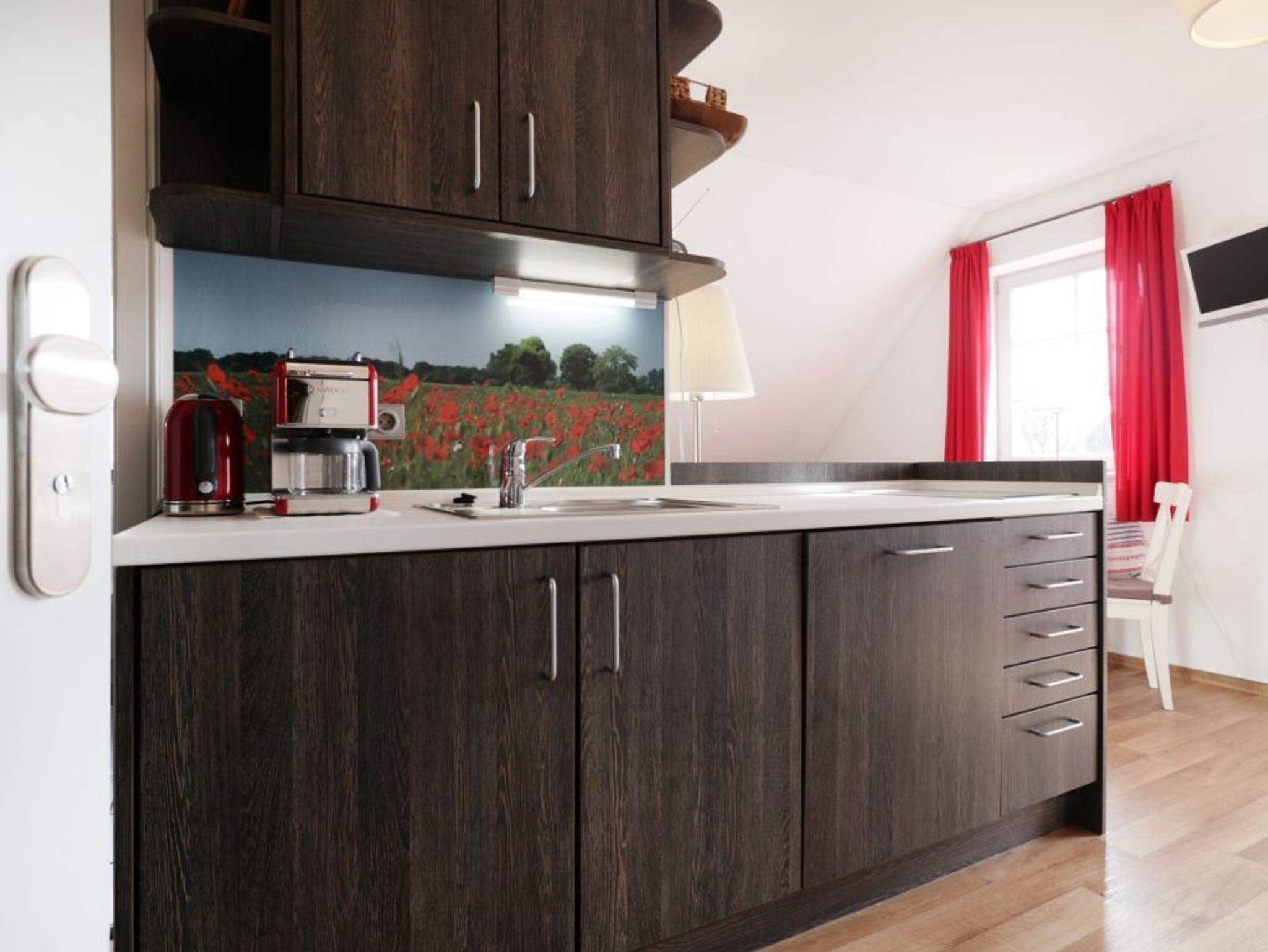 Die offene Miniküche ist integriert und mit 2 Feld- Induktionsherd, Mikrowelle, Kühlschrank ohne Frostfach, Kaffeemaschine, Wasserkocher, Toaster und Spülmaschine ausgestattet. Ihre zubereiteten Speisen nehmen Sie am Esstisch zu sich, oder während der Sommermonate auf dem saisonal möblierten Süd-Balkon. Ebenso können Sie den hauseigenen Garten mitnutzen.