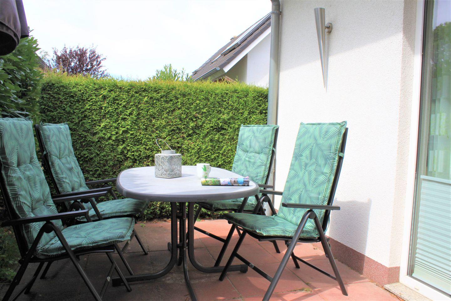 Im Erdgeschoss befinden sich der kombinierte Küchen- und Wohnbereich mit TV-Gerät und Kaminofen, der für wohlige Atmosphäre sorgt. Über eine Terrassentür gelangen Sie auf die geschützte, möblierte Terrasse in Süd-Westausrichtung mit Sonnenschirm und Grill.