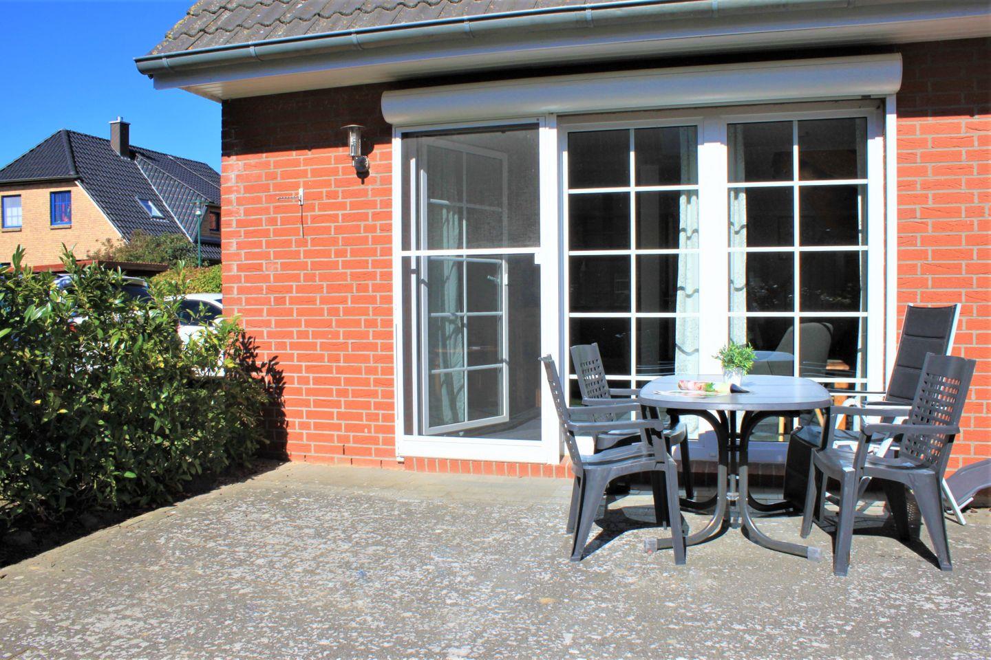Über den Flur gelangen Sie in den hellen Wohn- und Essbereich mit Zugang zu der möblierten Terrasse. Ausgestattet mit einem gemütlichen Sofa und TV-Gerät werden Sie sich rund um wohlfühlen. Die integrierte Küche ist unter anderem mit einem Kühlschrank mit Gefrierfach, einem Herd mit Backofen, Geschirrspülmaschine, Wasserkocher und Kaffeemaschine gut ausgestattet und lädt zu geselligen Kochabenden ein. Ihre Mahlzeiten genießen Sie entweder an dem angrenzenden Esstisch oder auf der möblierten Terrasse.