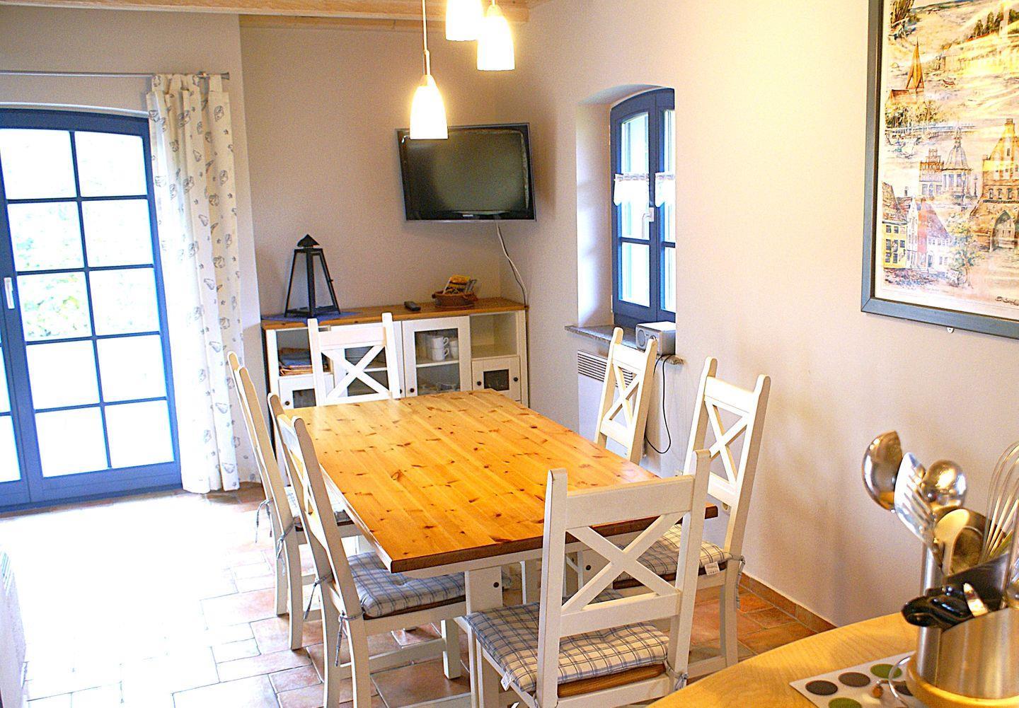 Das kombinierte Wohn- und Esszimmer bietet eine gemütliche Sofaecke mit TV, WLAN, Kaminofen und einen Esstisch. Die Küche ist ebenfalls in den Raum integriert und gut ausgestattet. Auf der angrenzenden Terrasse können Sie entspannt die Seele baumeln und Ihren Urlaub genießen.