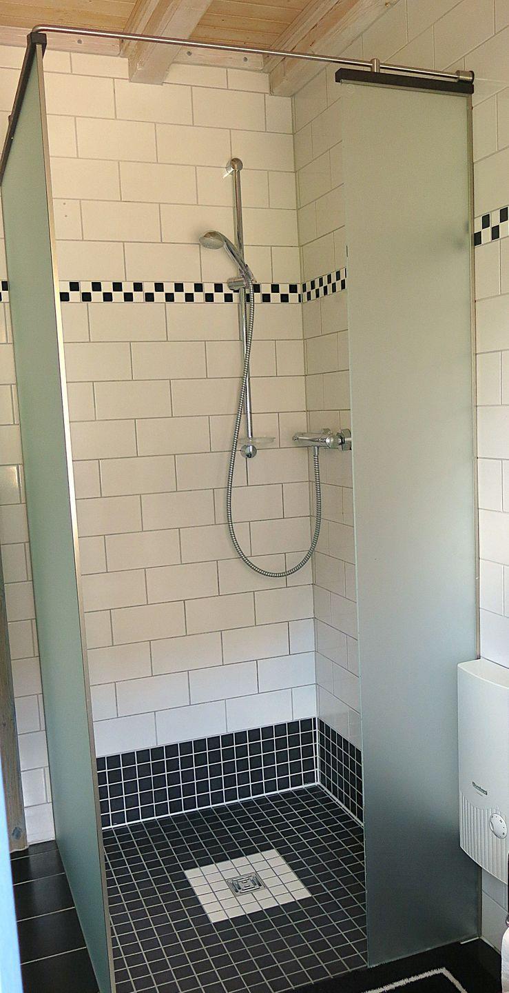Das Badezimmer bietet eine ebenerdige Dusche, Waschtisch, Föhn und WC.
