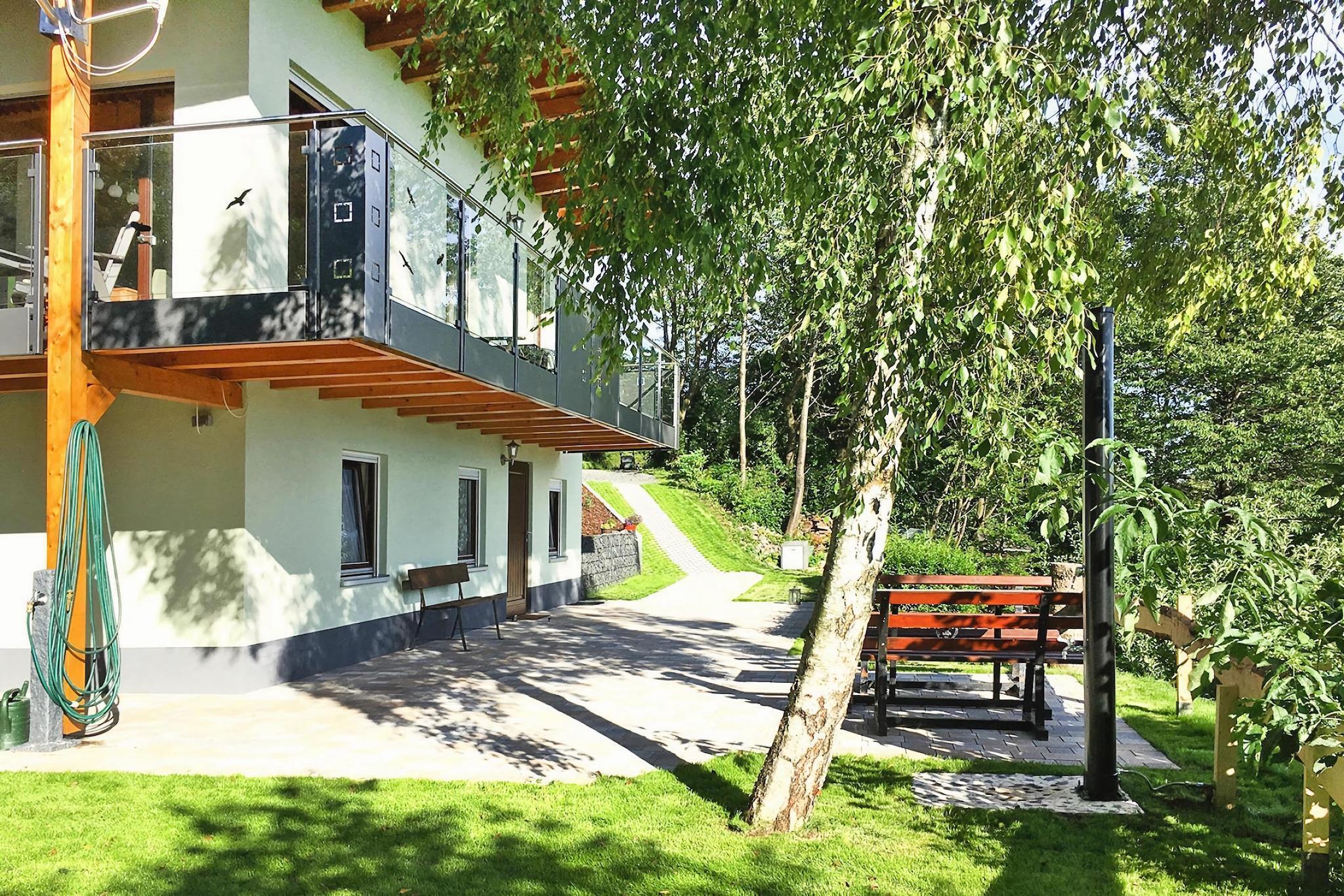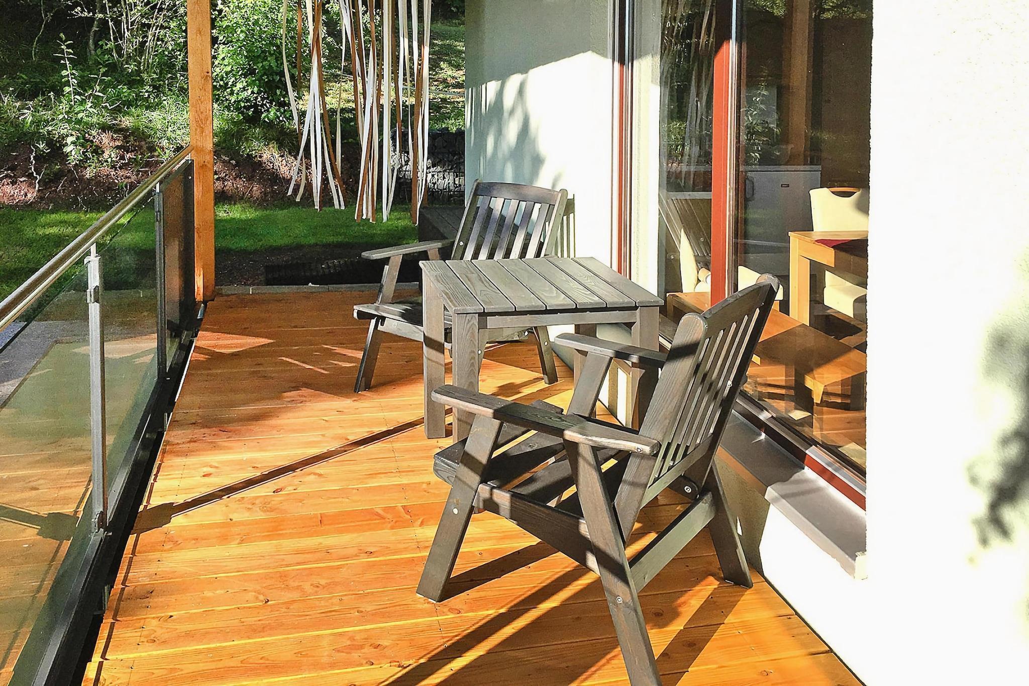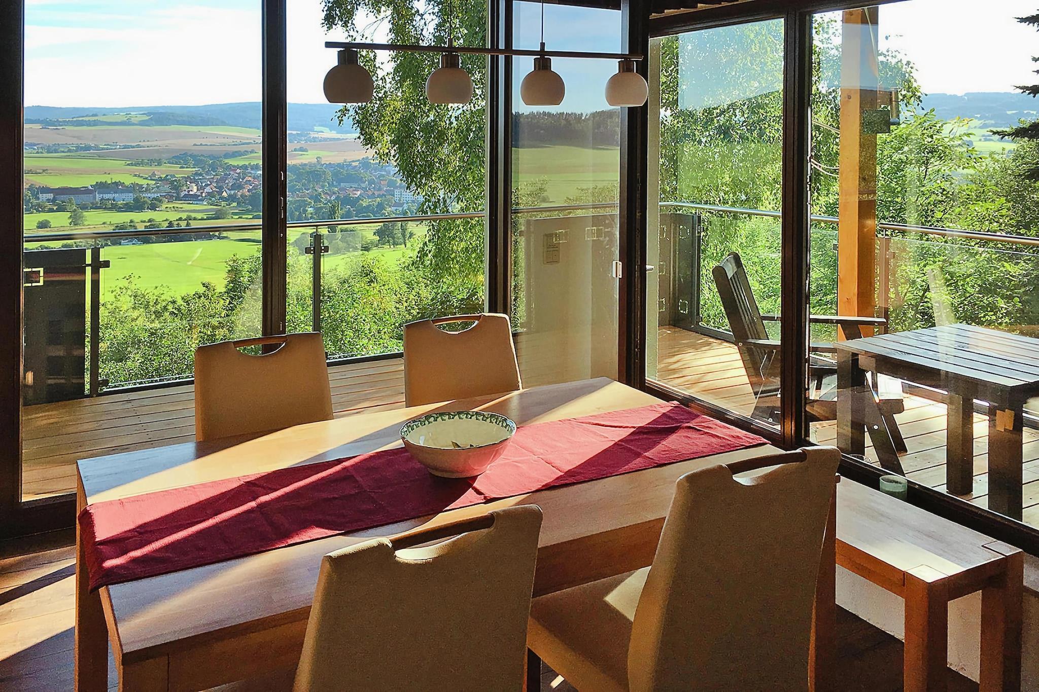 På grund af den sydvendte skrænt byder det nye sommerhus på en smuk panoramaudsigt, som I kan nyde, mens I spiser morgenmad på den rummelige altan. En pejs i stuen indbyder til hyggelige timer om aftenen. Efter en rundvisning eller en udflugt giver den udendørs bruser i haven den nødvendige afkøling på varme sommerdage. Dit feriehus er et vidunderligt udgangspunkt for vandreture og udflugter i biosfærereservatet Rhön. Hvis du sætter pris på naturoplevelsen og leder efter ro og afslapning, så er dette det rigtige sted for dig. Kaltennordheim ligger i Oberfeldatal i Thüringen Wartburg-distriktet. Omgivet af Rhöns smukke landskab byder den lille by ikke kun på smukke vandrestier i umiddelbar nærhed, men også masser af solide barer og restauranter til et hyggeligt stop efter gåturen. Detaljer: Velkomstpakke Aktiviteter i nærheden: Udforsk grænsetrekanten på cykel eller til fods. Mange smukke vandreture er mulige direkte fra feriehuset. Udforsk etaperne af ""Hochrhöner"", som løber 180 kilometer gennem tre forbundsstater med sine smukke udsigter. De, der vil have det lidt mere udfordrende, kan også bestige Rhön-bjergene på cykel. Der er en Segway-rejsearrangør omkring otte miles fra dit feriehus. Børn kan hygge sig i umiddelbar nærhed på eventyrbanen og på den indendørs legeplads. Og for dem, der vil gøre noget godt for sig selv: saltvandsverdenen Bad Salzungen med afgangstårnet kan nås på cirka 30 minutter. Også inden for 50 kilometer kan du nå fantastiske destinationer såsom Wartburg i Eisenach, barokbyen Fulda, teaterbyen Meiningen og Wasserkuppe i Rhön Ikke egnet til personer med nedsat mobilitet
