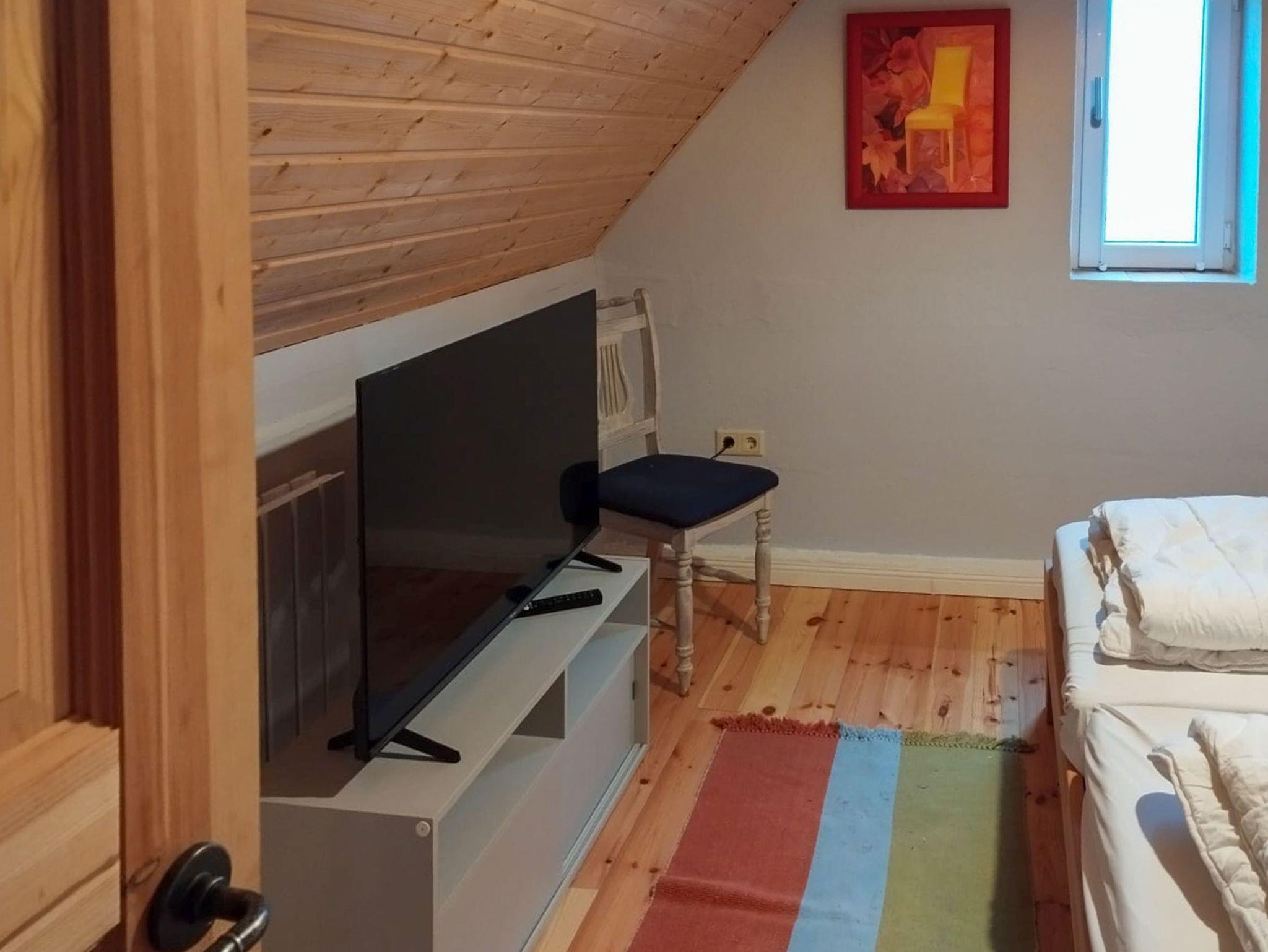 Eine steile Holztreppe führt Sie ins Obergeschoss, wo sich das Schlafzimmer mit einem komfortablen Doppelbett und ein Wohnzimmer mit einer Ottomane und einem Einzelbett befinden. Ein kostenfreier Parkplatz steht zur Verfügung; bei Bedarf können Sie einen weiteren Parkplatz anfragen. Ein Smart-TV befindet sich im Schlafzimmer. Den Kamin im Erdgeschoss dürfen Sie gerne benutzen, ein kleiner Vorrat an Holz steht für Sie bereit. Bitte reinigen Sie den Kamin bevor Sie abreisen.