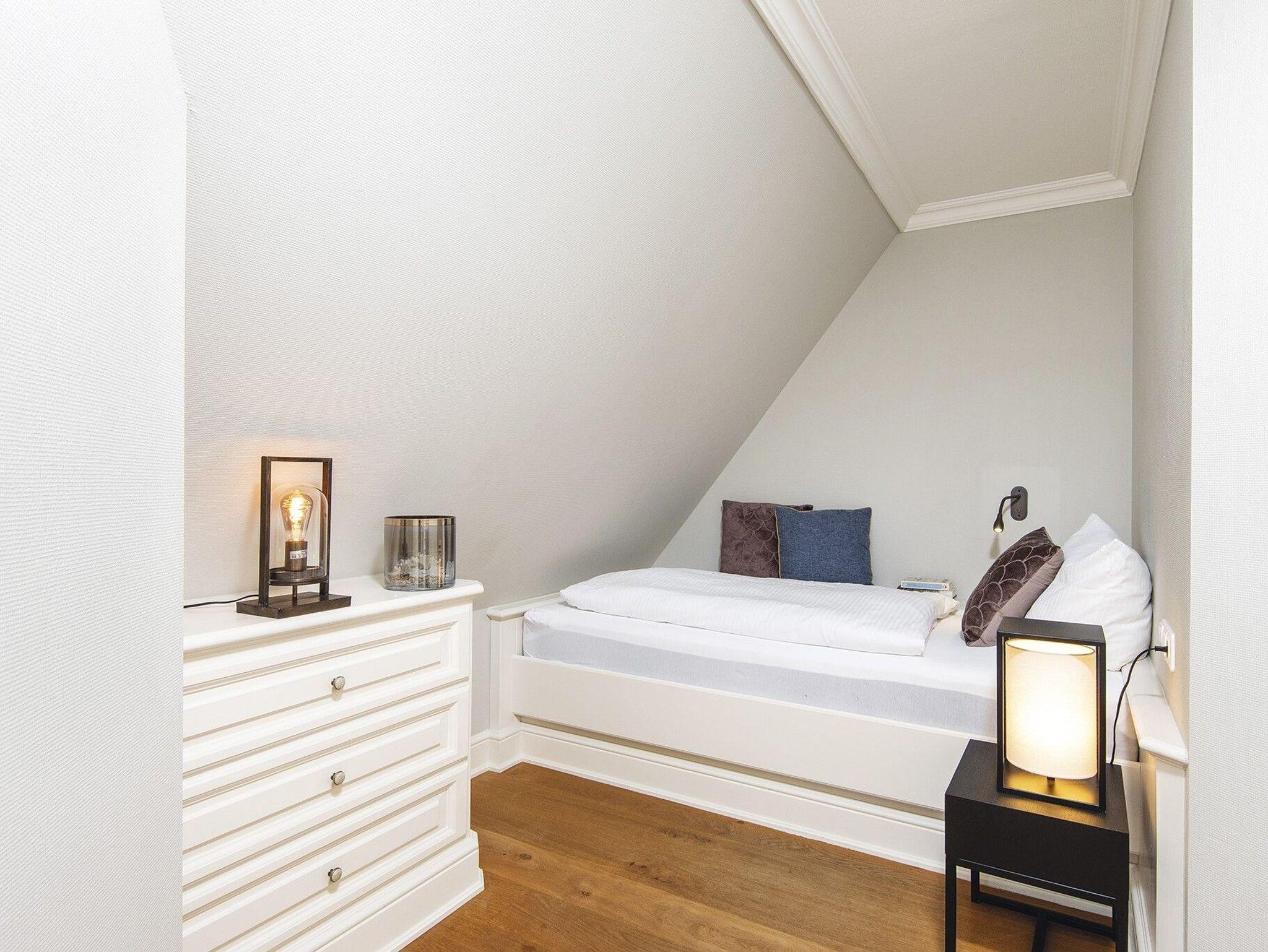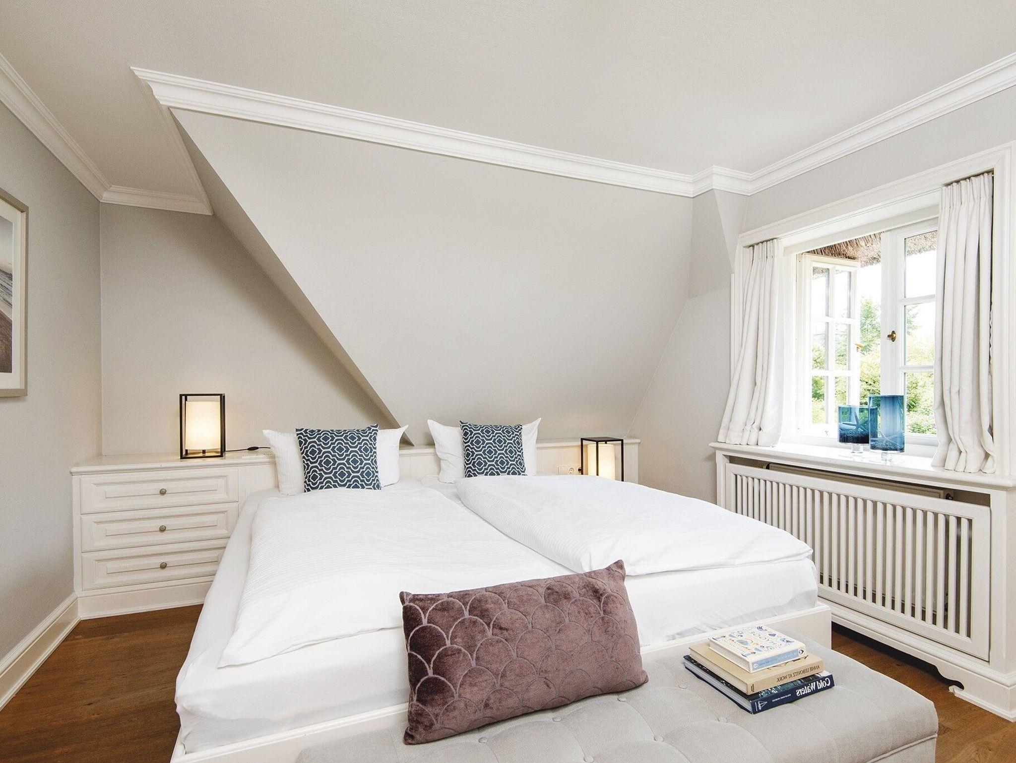 Klassisches Antlitz von draußen und moderner Chic innen - das stilvoll gemütliche Hausteil unter Reet für Fünf ist zentrumsnah und doch ruhig gelegen. Neben der separaten Küche erfreut im Erdgeschoss der in eleganten Naturtönen mit kleinen Farbakzenten gehaltene Wohnbereich mit Kamin und bequemen Polstermöbeln, sowie einem schönen Esstisch für gemütliche Runden. Von hier haben Sie auch Zugang zum Garten mit Terrasse und Strandkorb. Ein Doppelschlafzimmer mit großen Einbauschränken und ein Wannenbad erwartet Sie im hellen Untergeschoss. Im Obergeschoss lässt das große Doppelschlafzimmer mit Gartenblick nebst modernem Duschbad und einem schönen Einzelschlafzimmer keine Wünsche offen. Das Quartier ist mit Terracotta- und Holzfußböden ausgestattet.