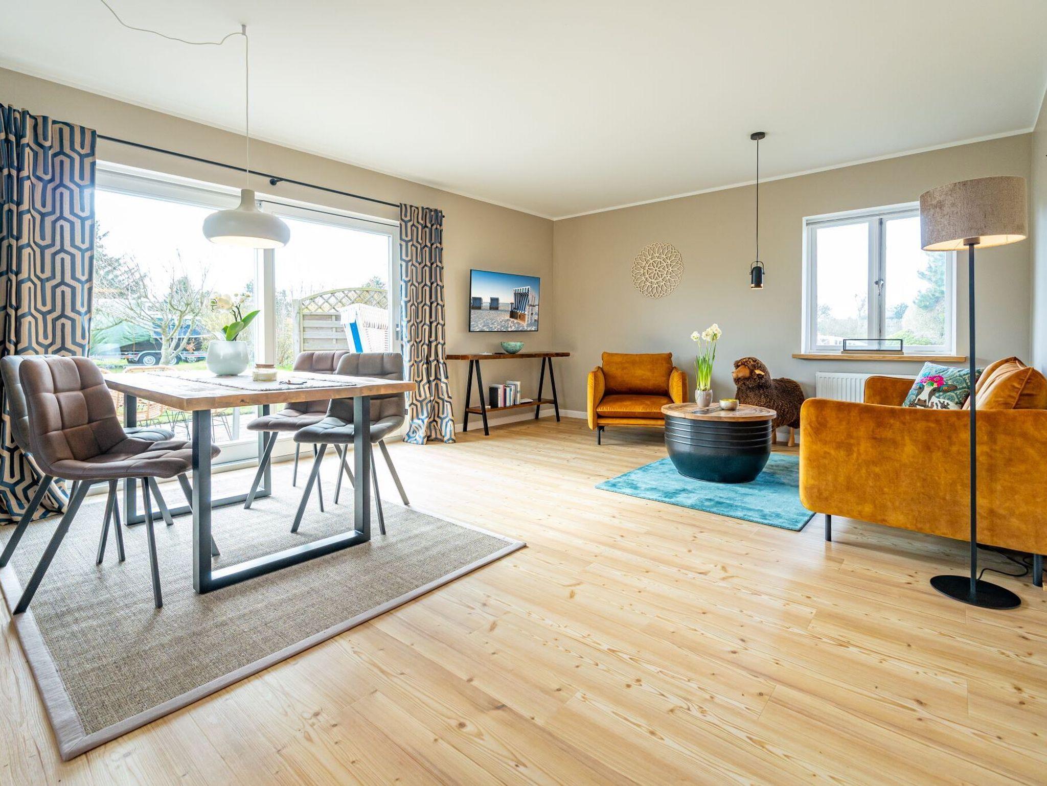 Wohnen in bester Lage und doch mitten in der Ruhe der Natur. Heideland, Wildblumenwiese und sogar ein kleiner Hühnerstall sorgen für ländliche Gemütlichkeit - fußläufig nach Kampen Mitte. Frisch saniert erreichen Sie dieses schmucke Appartement für bis zu Vier Sie einen Pfad durch den naturbelassenen Garten und betreten es direkt im Wohnbereich. Bequeme Polstermöbel, ein Esstisch für gemütliche Runden, Zugang zur Südterrasse mit Strandkorb und eine halboffene voll ausgestattete Küche erwarten Sie hier. Über den Flur, vorbei am kleinen und ganz neuen Duschbad, teilt sich der Weg in zwei Doppelzimmer mit zwei Bettvarianten - zu stellen jeweils als ein Doppel- oder zwei Einzelbetten. Das Quartier ist mit Designboden in Holzoptik ausgelegt. Landhausstil gemixt mit stylischen Elementen, eine Terrasse mit fast den ganzen Tag über Sonne und Weitblick über die Heide.