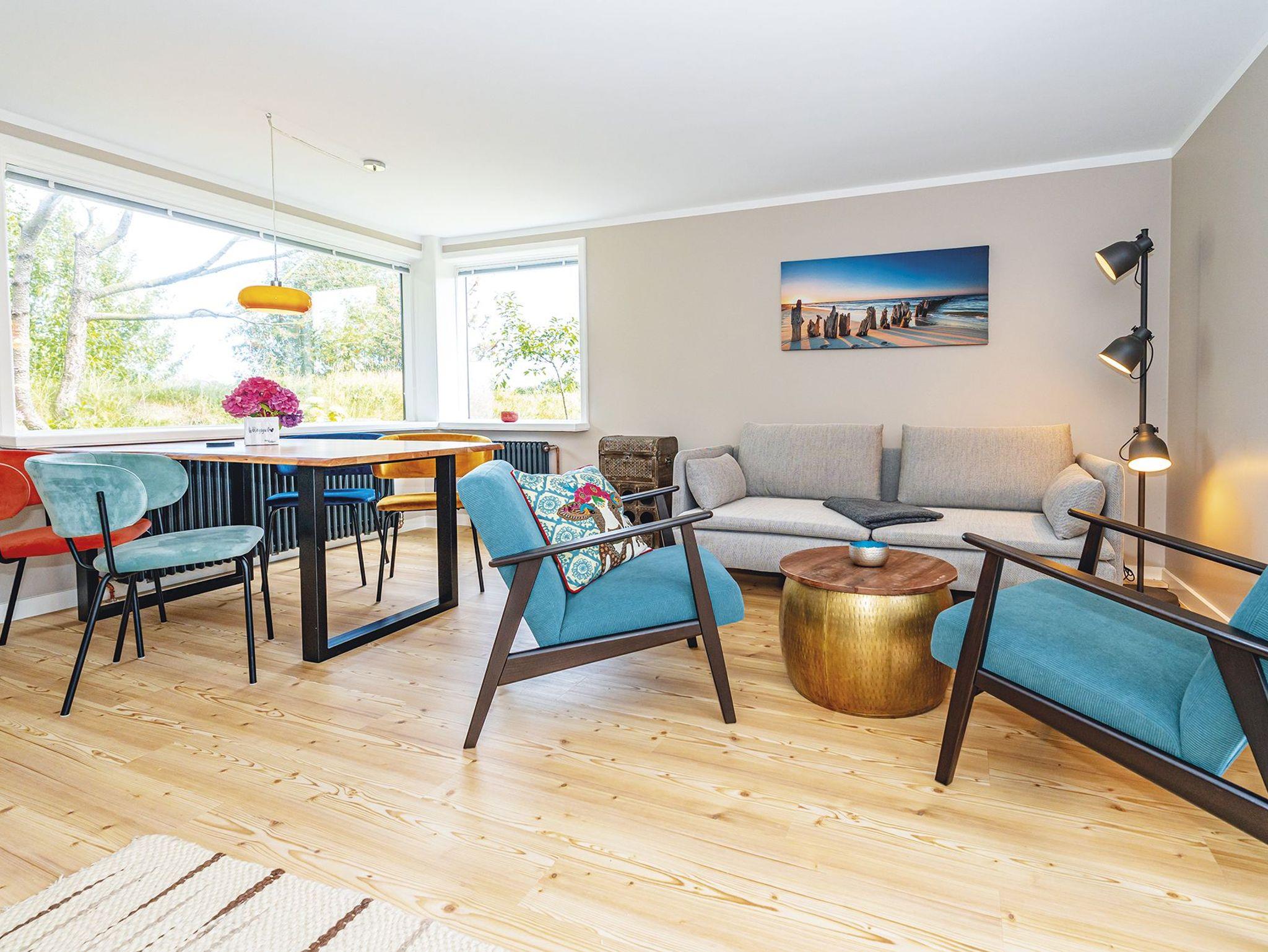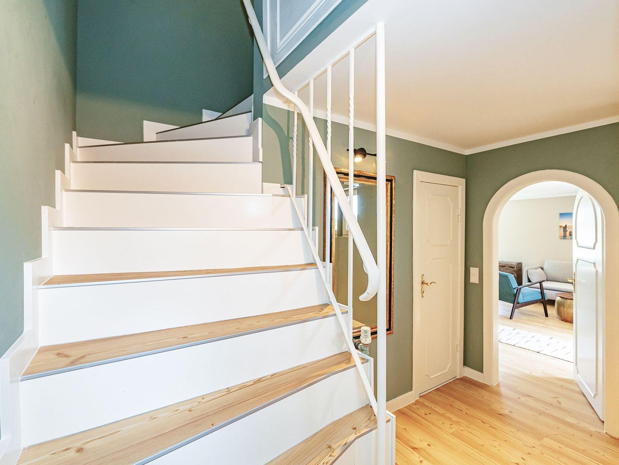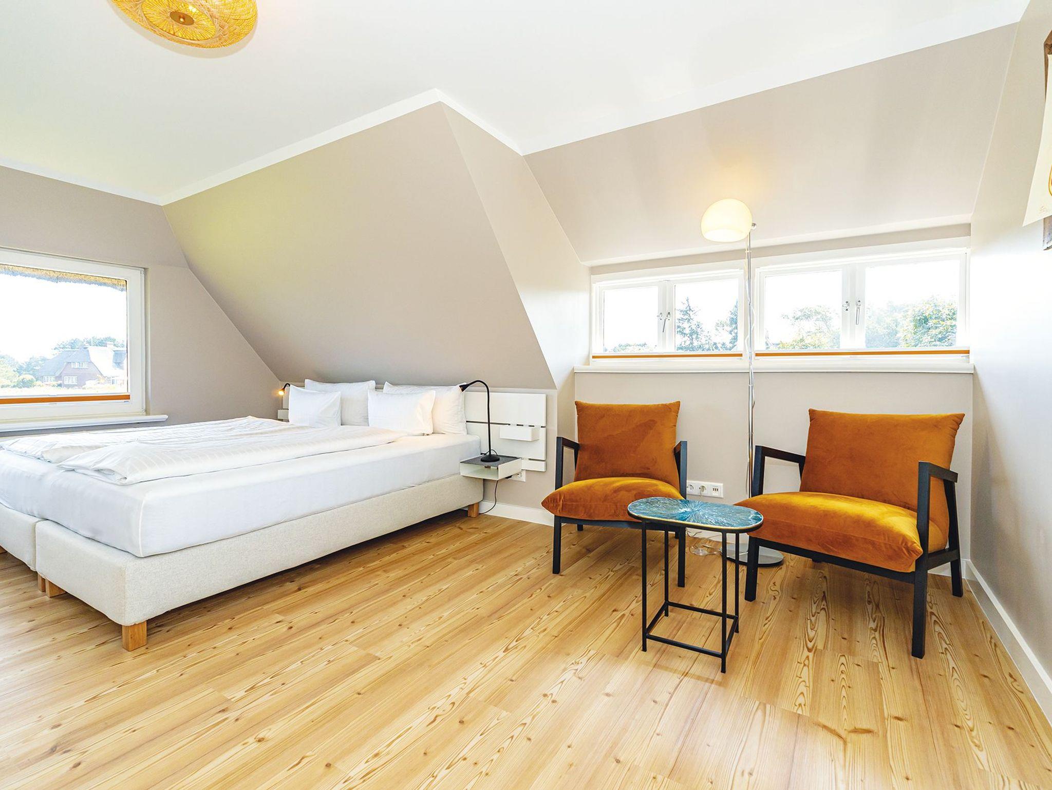 Mitten in der Heide und herrlich ruhig wartet dieses entzückende und frisch renovierte Hausteil bei Flut sogar mit einem glitzernden Meerblick auf. Im offenen WohnEssbereich sorgen Farbtupfer gepaart mit Möbeln im Industrial Chic für ein Höchstmaß an Gemütlichkeit. Von hier schaut man durch die Panoramafenster auf das friedliche Heideland. Die separate Küche verfügt über alles was nötig ist. Über den Flur und vorbei am kleinen Gäste-WC mit Dusche, gelangen Sie über die friesisch schmale Treppe ins 1. Obergeschoss. Hier erwarten Sie ein kleines Schlafzimmer für Zwei und ein größeres Doppelschlafzimmer mit Duschbad en suite. Besonderen Komfort bieten hier die gemütliche Sitzecke und ein grandioser Gartenblick, wo man vom Bett aus bis zum Watt schauen kann. Ebenfalls befindet sich hier ein kleiner Schreibtisch mit Ausblick zum Arbeiten und Sinnieren. Das Quartier ist mit Designboden in Holzoptik ausgelegt.