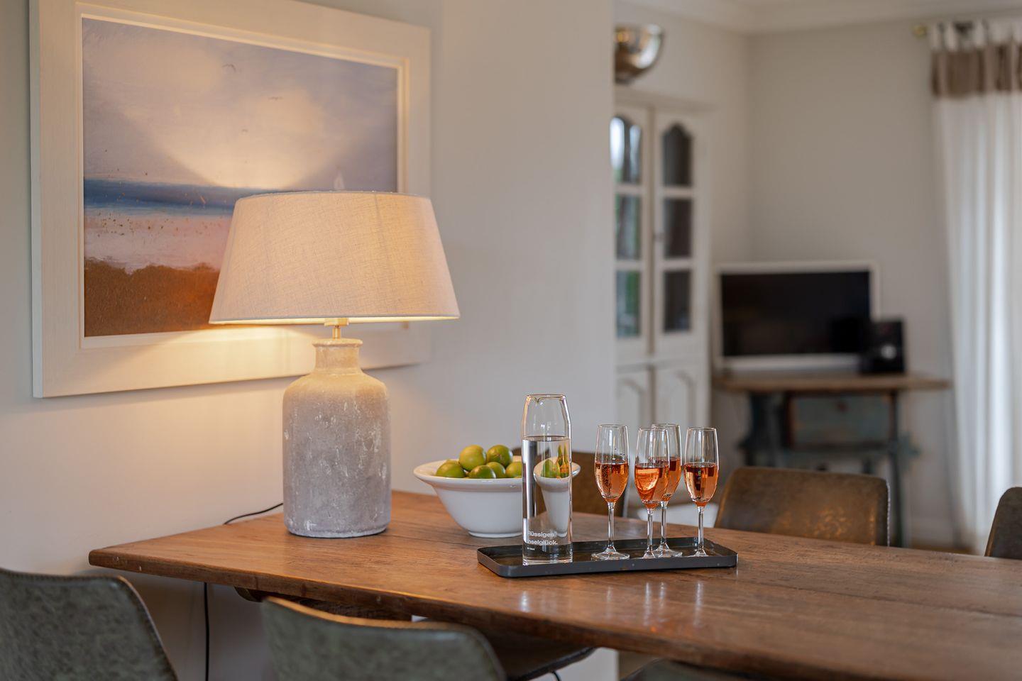 Es erwartet Sie ein stilvoll eingerichteter Wohnraum mit voll ausgestatteter Küchenzeile.