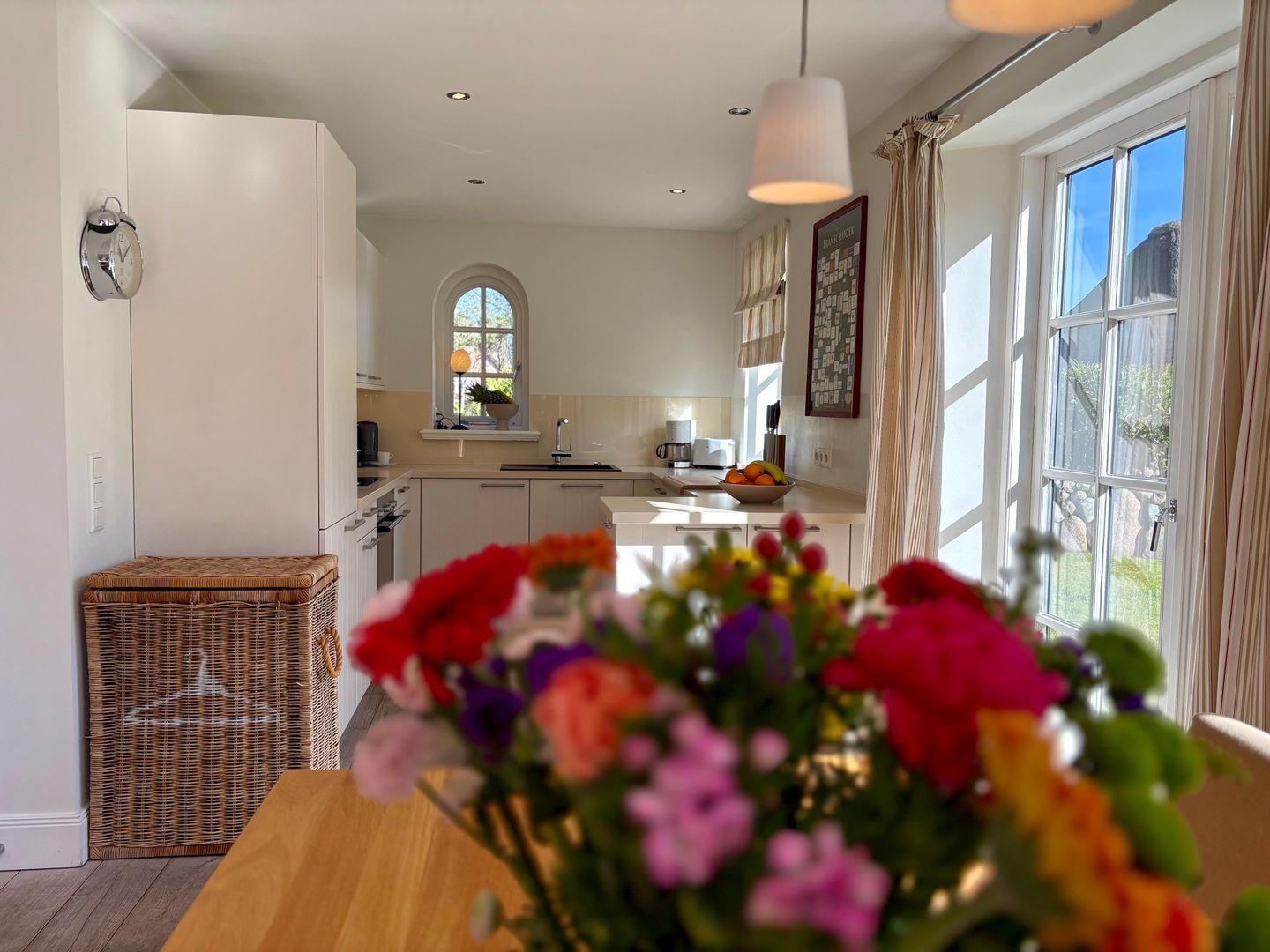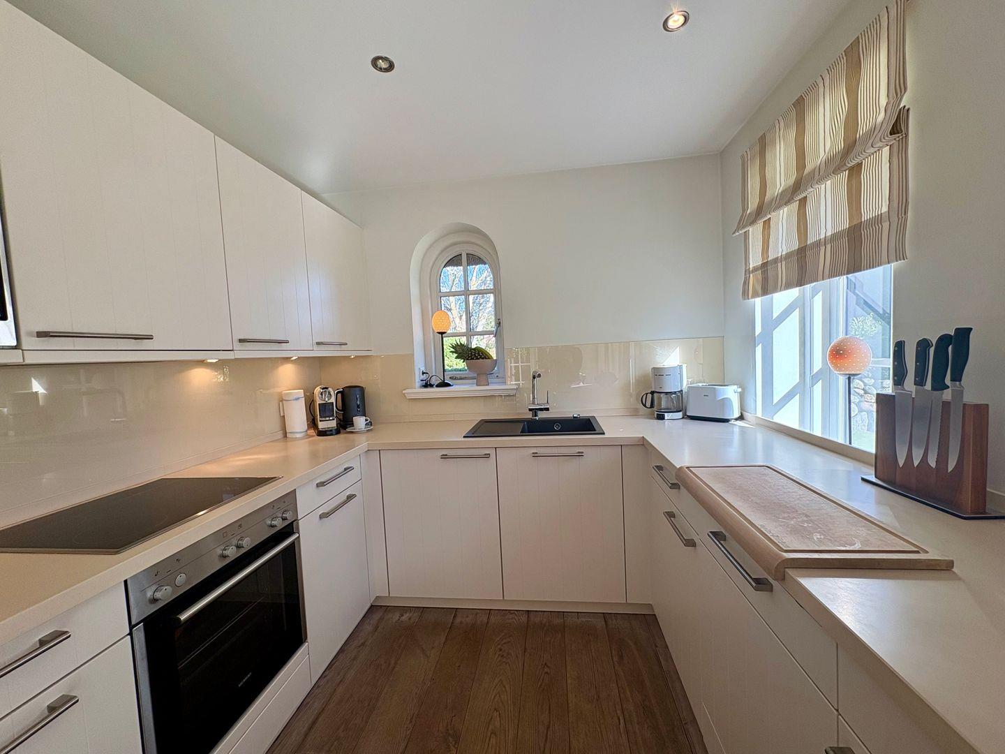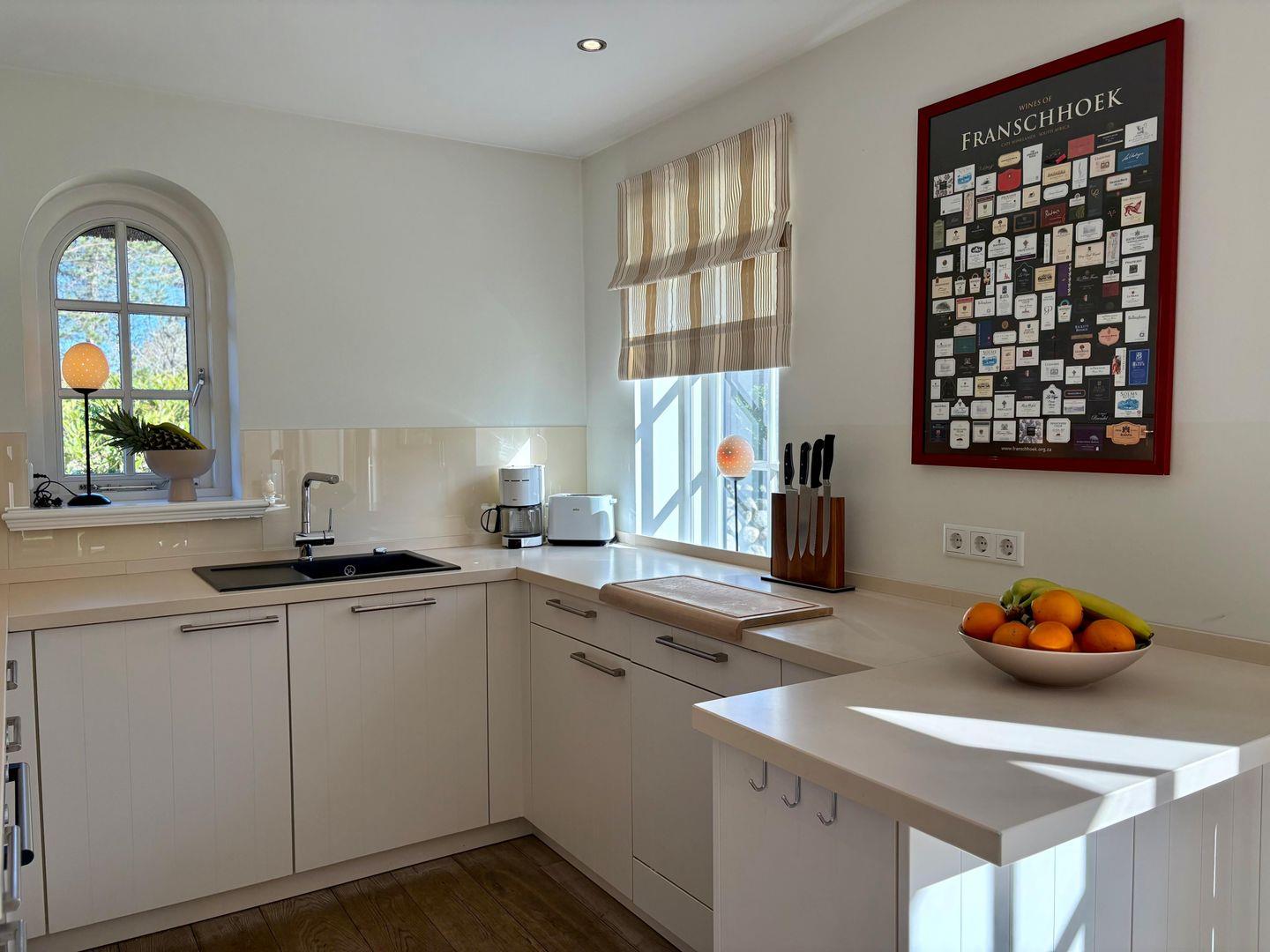 Die offene, modern ausgestattete Küche ist das Herzstück des Hauses. Der großzügige, lichtdurchflutete Raum mit großen Fenstern sorgt nicht nur für eine freundliche Atmosphäre, sondern bietet auch direkten Zugang zur Terrasse – ideal für Frühstück im Freien oder gesellige Sommerabende. Der große Esstisch für bis zu acht Personen lädt zu gemeinsamen Kochabenden, ausgiebigen Mahlzeiten und gemütlichem Beisammensein ein. Hochwertige Geräte, großzügige Arbeitsflächen und liebevolle Details machen das Kochen hier zum echten Vergnügen.