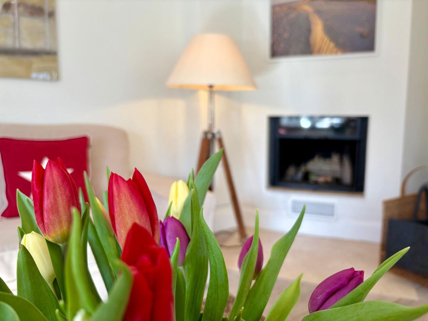 Der helle, freundliche Eingangsbereich heißt Sie herzlich willkommen und führt direkt in den offenen Wohn- und Essbereich. An kühlen Tagen verbreitet der Kamin im Wohnzimmer wohlige Wärme, während die weichen Sofas dazu einladen, sich einzukuscheln, zu lesen oder den Lieblingsfilm zu genießen.