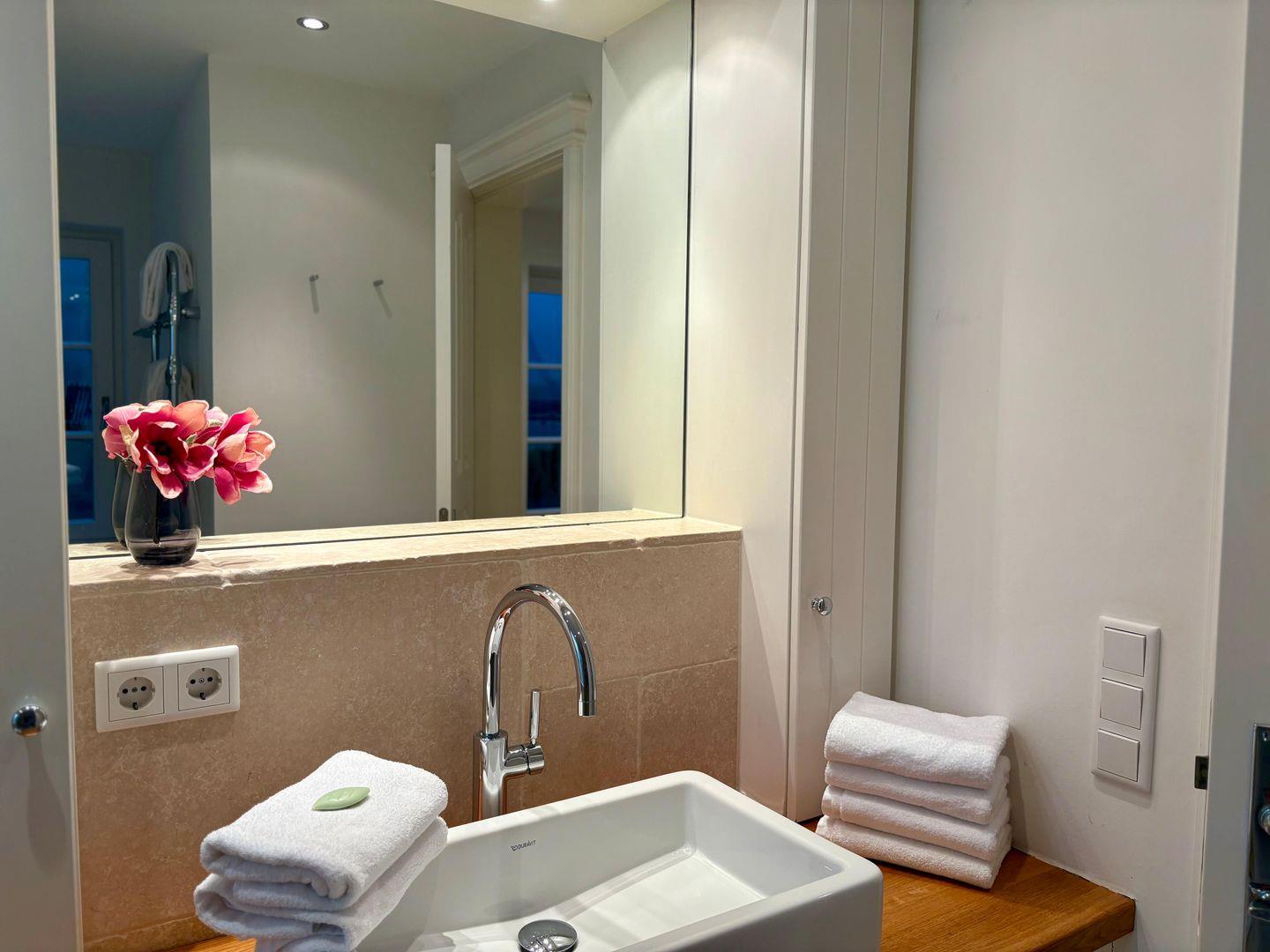 Im Obergeschoss erwartet Sie eine kleine Galerie mit Arbeitsplatz – ideal zum Lesen oder Arbeiten – sowie ein verwunschenes, leicht verwinkeltes Doppelschlafzimmer mit großzügigem Einbauschrank und Wannenbad. Ein weiteres Schlafzimmer mit kleinem Doppelbett (160cm breit) und eigenem Duschbad rundet diese Etage ab.