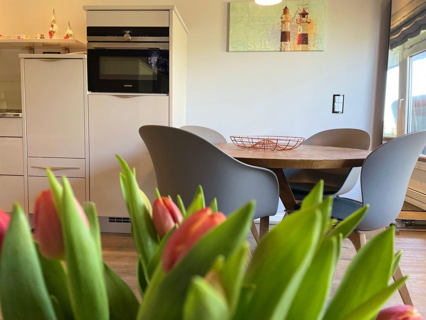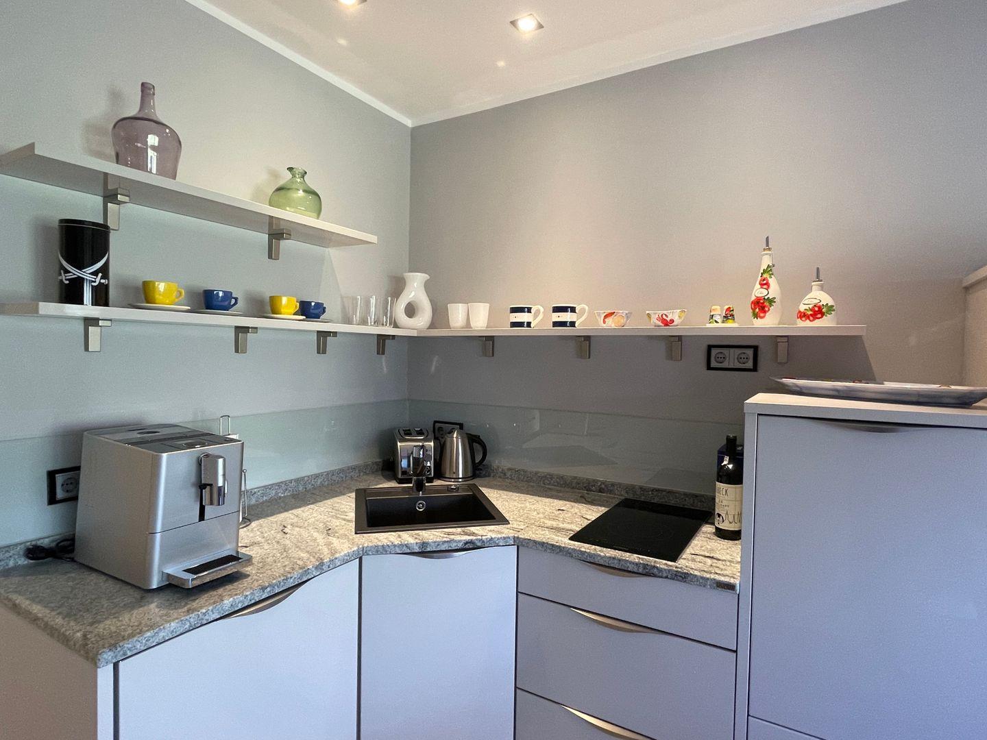Die offen gestaltete Küche präsentiert sich nicht nur im modernen Gewand, sondern wurde auch umfangreich ausgestattet. Neben Herd, sowie Kaffeevollautomat (ganze Bohnen), Kühlschrank und Spülmaschine steht Ihnen beispielsweise auch ein Backofen zur Verfügung. Dieser wurde erhöht angebracht und lässt sich daher besonders komfortabel bedienen.