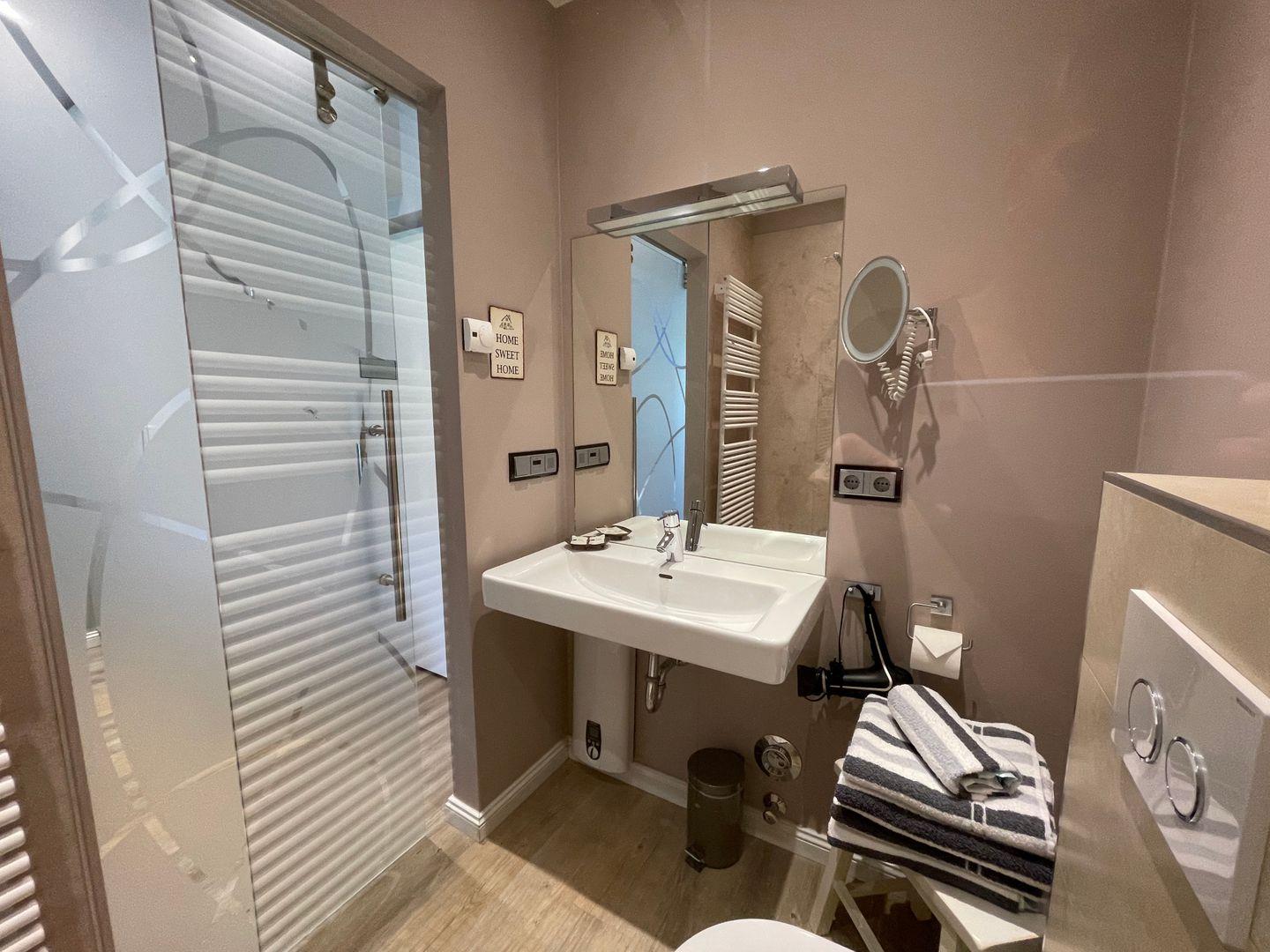 Helle, gedeckte Farben sorgen für ein harmonisches Gesamtkonzept im Wohn- und Schlafzimmer. Diese Harmonie erstreckt sich auch auf das hübsche Badezimmer. Auch im Bad wurde an Ihren Komfort gedacht. Die bodentiefe Dusche mit Glasabtrennung bietet viel Platz und einen bequemen Zugang. Auf dem Handtuchheizkörper erreichen Ihre Duschtücher schnell Wohlfühltemperatur. Der beleuchtete, große Spiegel hinter dem Waschtisch wird durch einen separaten Kosmetikspiegel ergänzt. Ablagemöglichkeiten, geschickt platzierte Steckdosen sowie ein Haartrockner runden das Badezimmer ab.