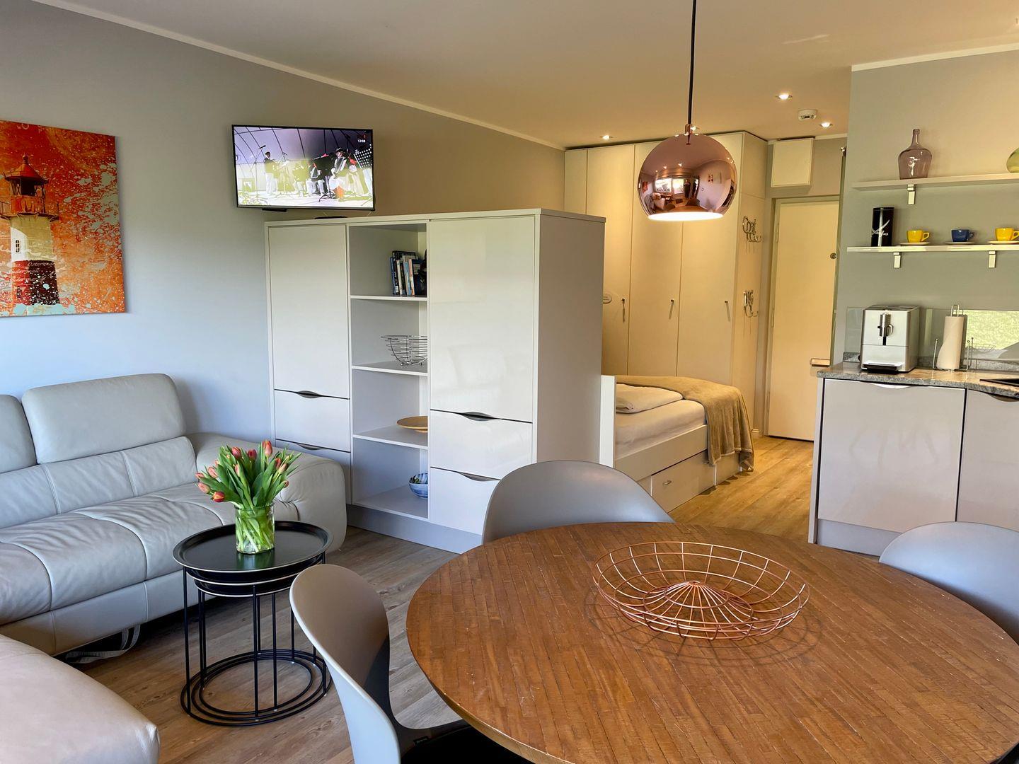 Der Wohnbereich wurde großzügig gestaltet und bietet Ihnen neben komfortablen Polstermöbeln auch einen direkten Zugang zur eigenen westlichen Terrasse. Von hier aus haben Sie auch einen seitlichen Meerblick. Genießen Sie hier die sonnigen Urlaubsstunden in vollen Zügen und lassen Sie die Seele baumeln - gerne auch gemeinsam! Denn neben dem komfortablen Strandkorb stehen Ihnen selbstverständlich auch ein Tisch samt passender Bestuhlung zur Verfügung. Direkt gegenüber erwartet Sie der Essplatz, welcher mit vier Sitzplätzen genügend Platz bietet, um Gäste zu empfangen oder es sich beim Frühstück mit der Tageszeitung gemütlich zu machen.