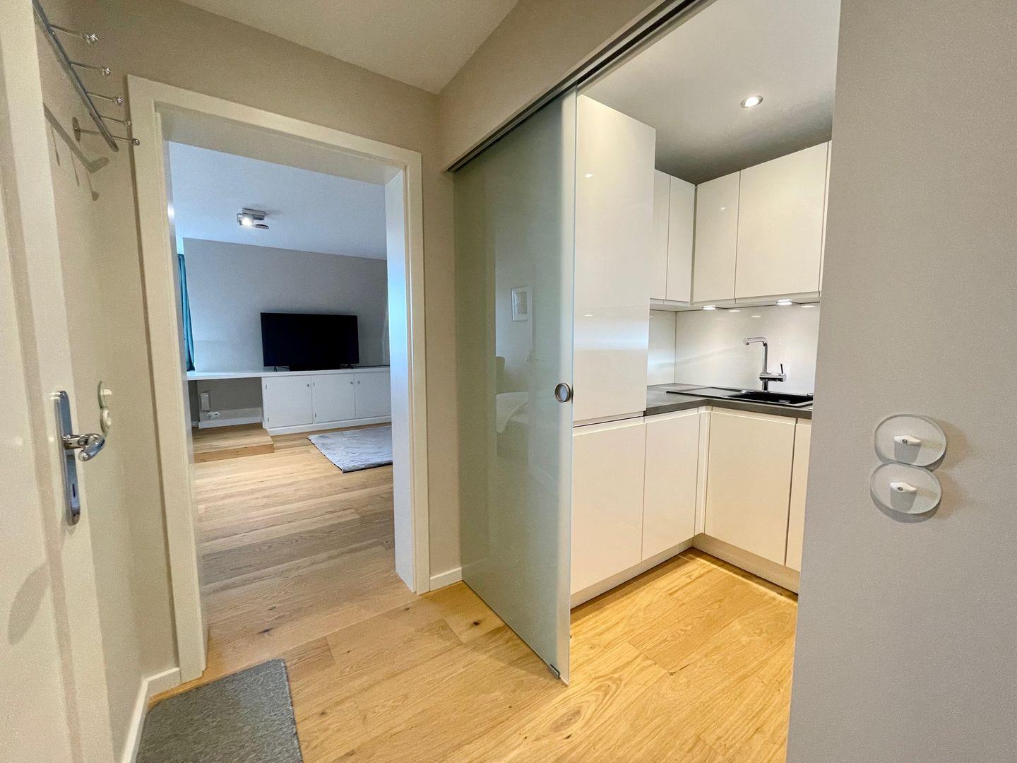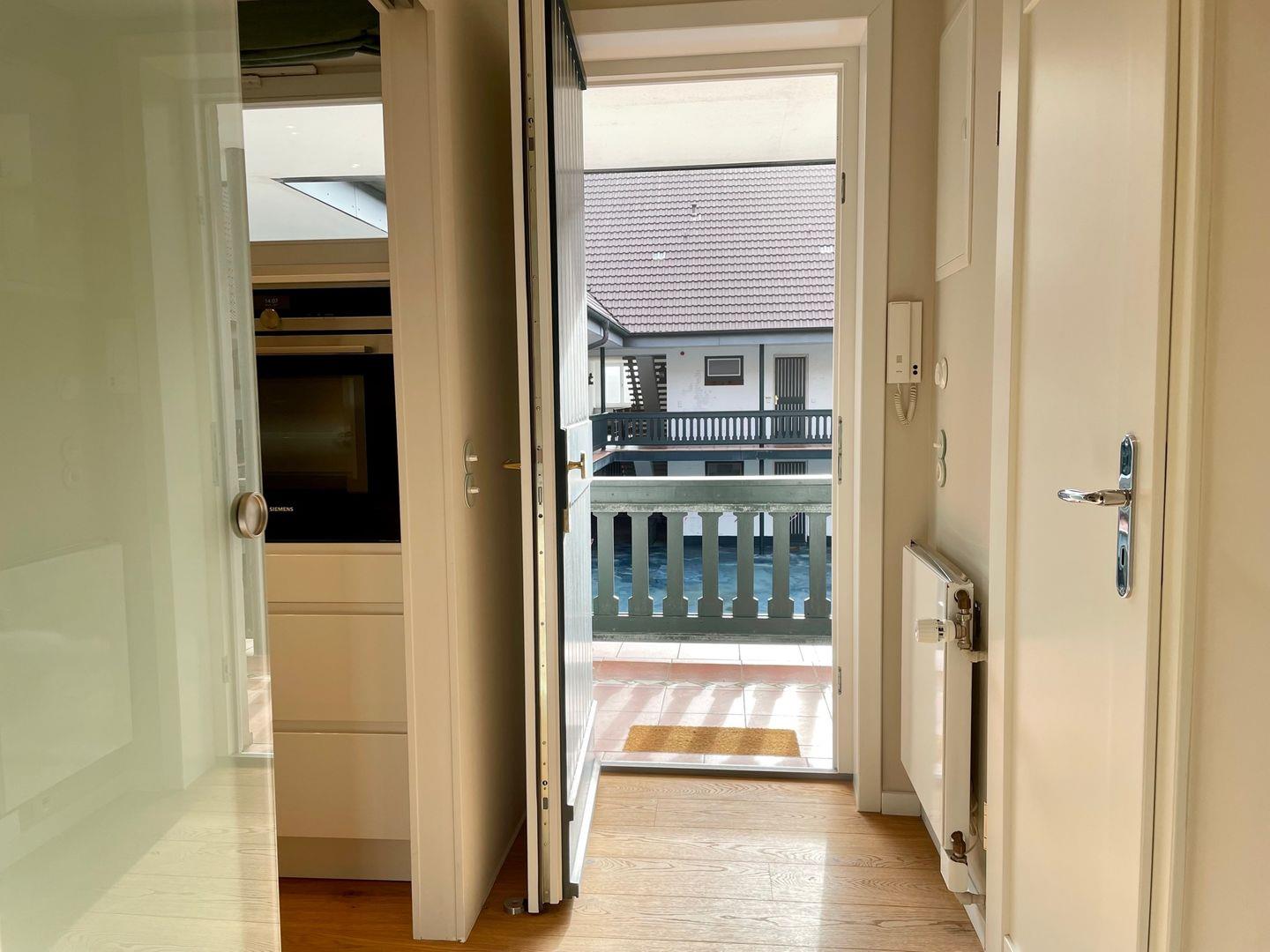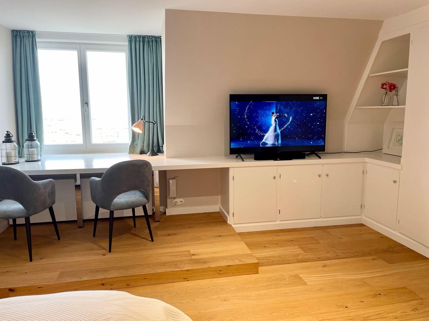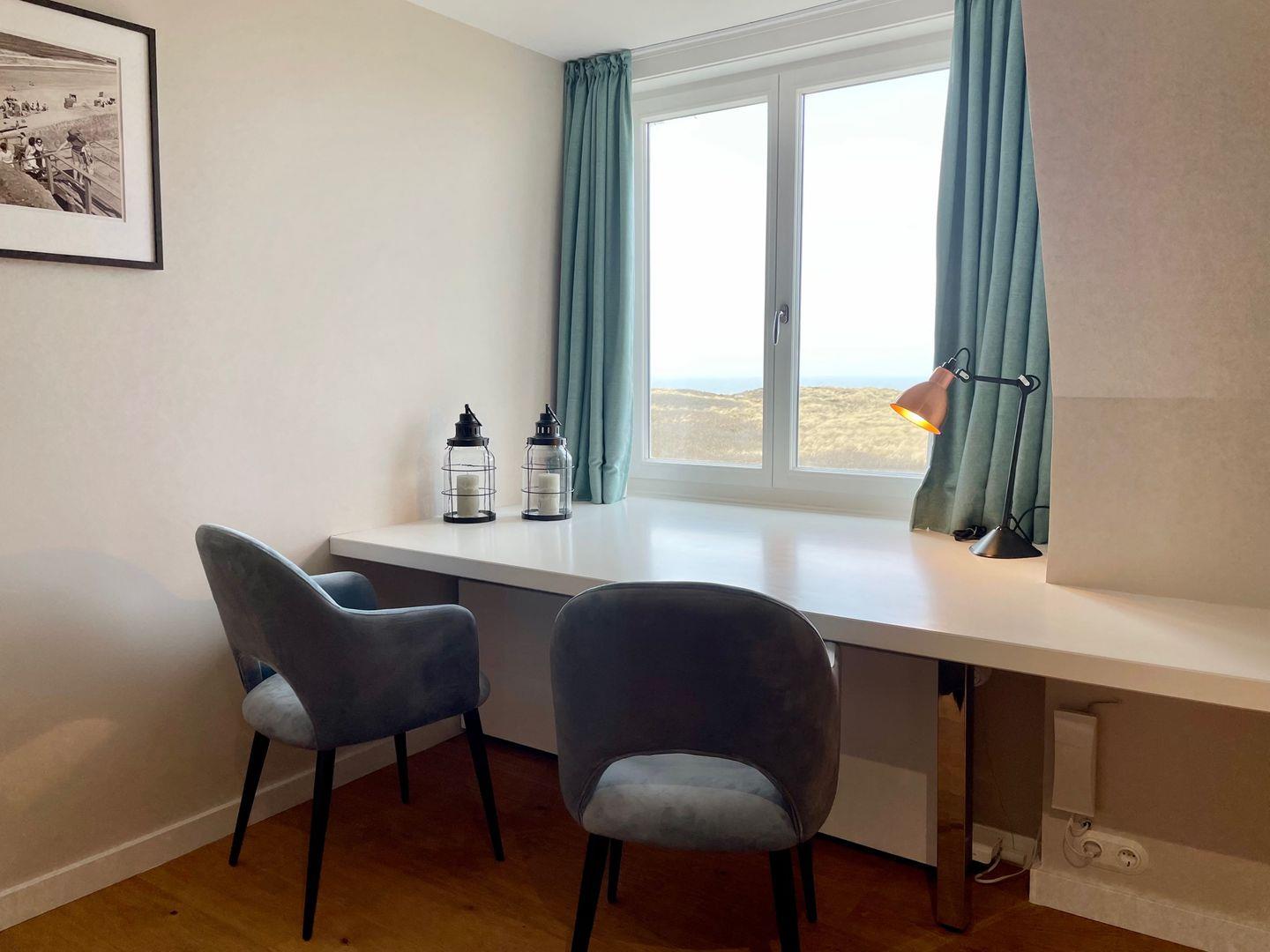 Die stilvoll und hell eingerichtete 1 Raumwohnung erreichen Sie über das offene Treppenhaus im Innenhof, sie verfügt über ein großes Doppelbett und eine geräumige Schrankwand. Für entspannte Abende vor dem Fernseher erwartet Sie eine gemütliche Couch im Zimmer. Vom eingebauten Tisch direkt am Fenster haben Sie einen atemberaubenden Blick auf die wunderschöne Natur mit ihren Dünen und dem Meer. Vom Flur aus gelangen Sie in die angrenzende, modern eingerichtete Küche. Neben einem Kühl - und Gefrierschranks, einem Herd mit Backofen steht Ihnen ein Geschirrspüler sowie eine ausgewählte Variation an Geschirr, Gläsern und Küchenutensilien zur Verfügung. Eine Waschmaschine befindet sich ebenfalls in der Küche. Kaffeeliebhaber kommen Dank der vorhandenen Tchibo- und Filtermaschine voll auf Ihre Kosten. Das helle Badezimmer verfügt über einen großen Spiegel mit integriertem Licht, der sich direkt über dem modernen Waschbecken befindet, einem WC und einer Dusche.
