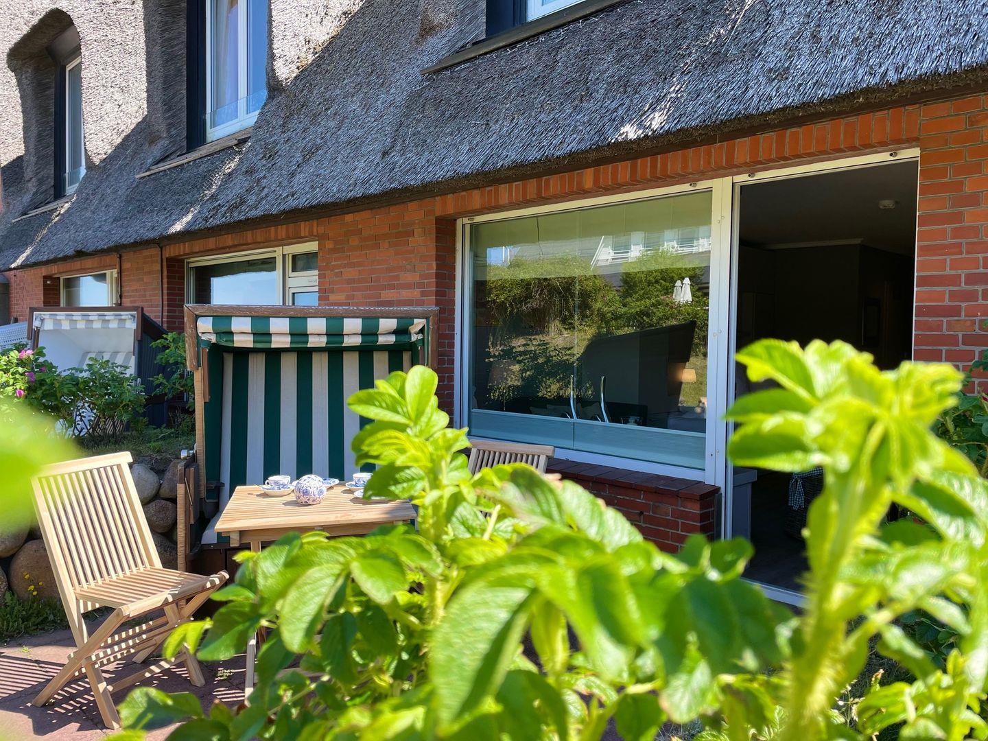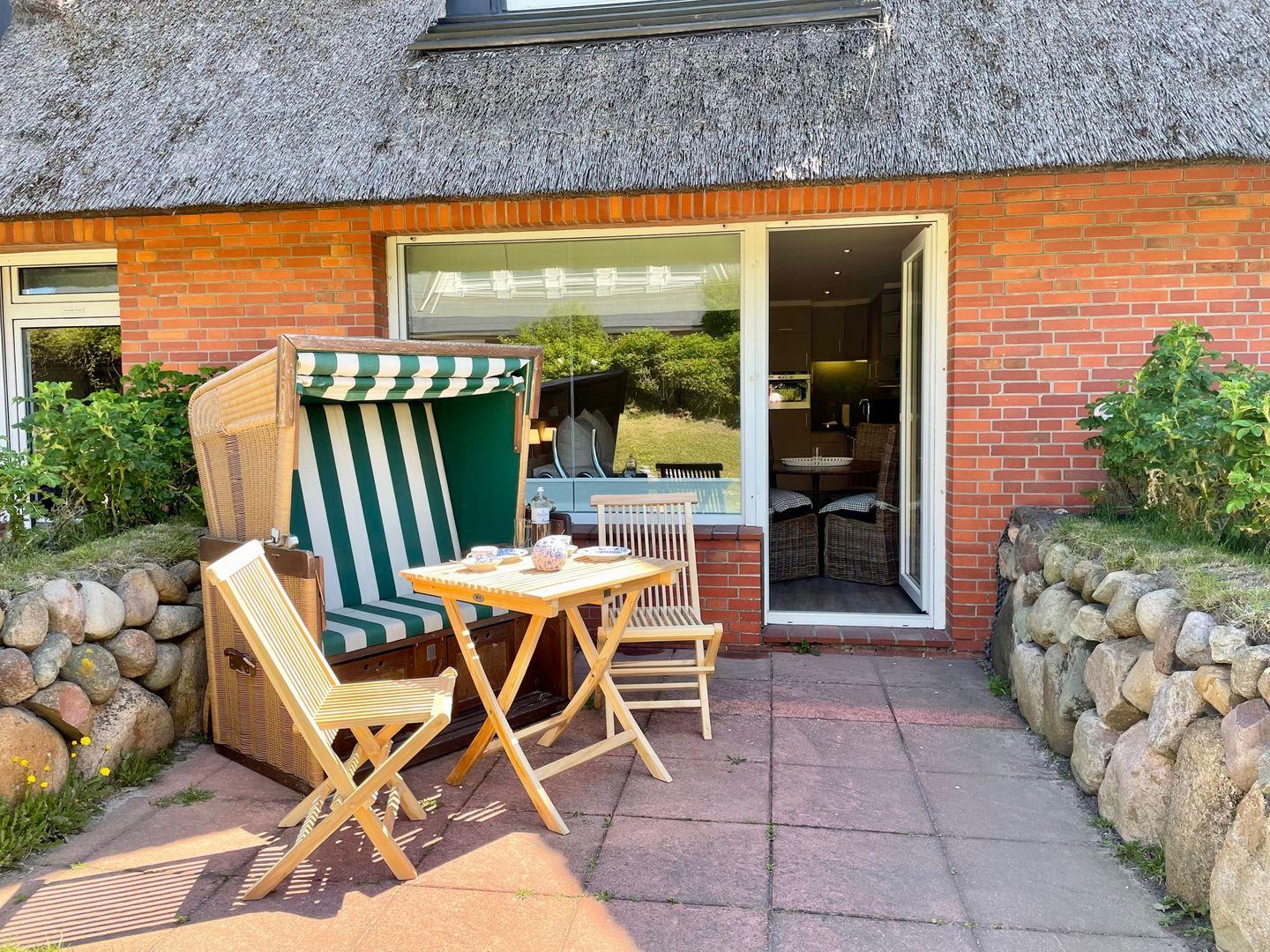 Die hübsche Terrasse lässt sich nicht nur direkt vom Wohnbereich des Studios aus begehen, sondern versprüht mit seinem Strandkorb und dem Friesenwall auch den typischen Charme Sylts. Von hier aus haben Sie auch einen seitlichen Meerblick. Genießen Sie hier die sonnigen Urlaubsstunden in vollen Zügen und lassen Sie die Seele baumeln - gerne auch gemeinsam! Denn neben dem komfortablen Strandkorb stehen Ihnen selbstverständlich auch ein Tisch samt passender Bestuhlung zur Verfügung.