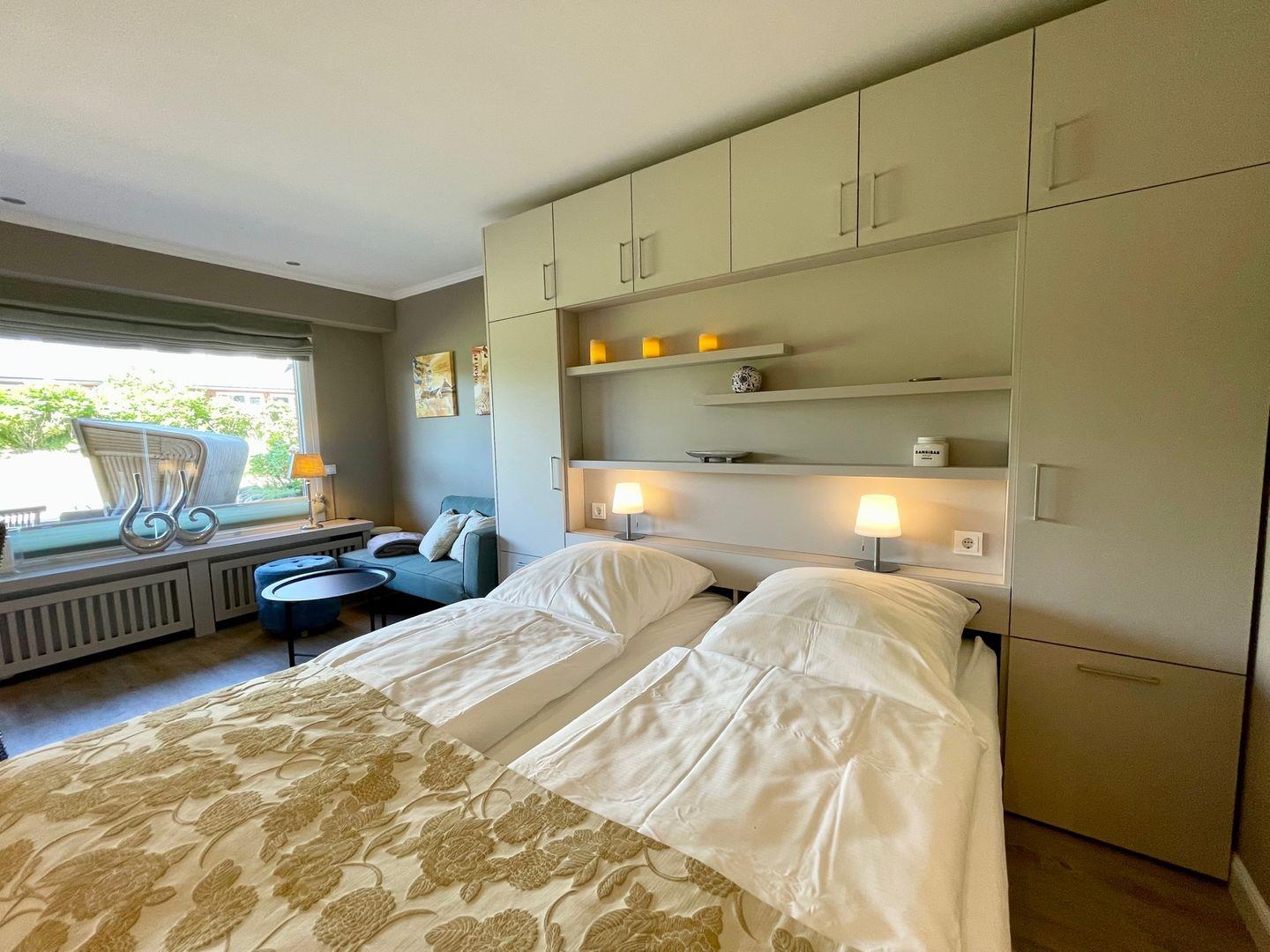 In bester Lage von Kampen erwartet Sie dieses komplett renovierte, charmante Feriendomizil unter Reet im Haus Kampbarg. Eine stilvolle, moderne und sehr durchdachte Möblierung machen das Studioappartement "Lieblingsplatz 2" zu einem idealen Rückzugsort für zwei Gäste. Da sich das Doppelbett elektrisch Ein- und Ausfahren lässt, wird die Raumaufteilung optimal ausgenutzt.
