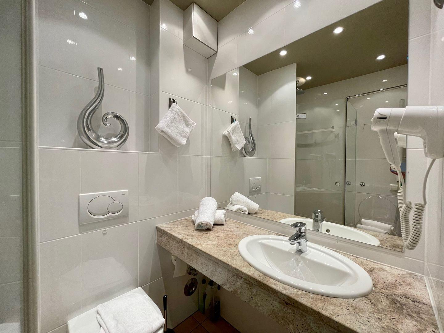 Das separate Badezimmer verfügt über eine Dusche mit Glasabtrennung und wurde weiß gefliest. Ein großer Waschtisch mit passendem Spiegel sowie ein fest installierter Föhn nutzen den Platz im Bad optimal aus.