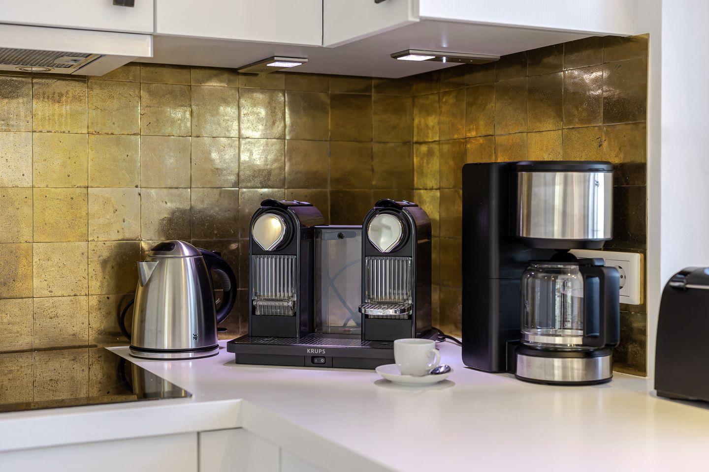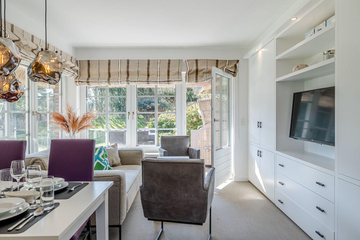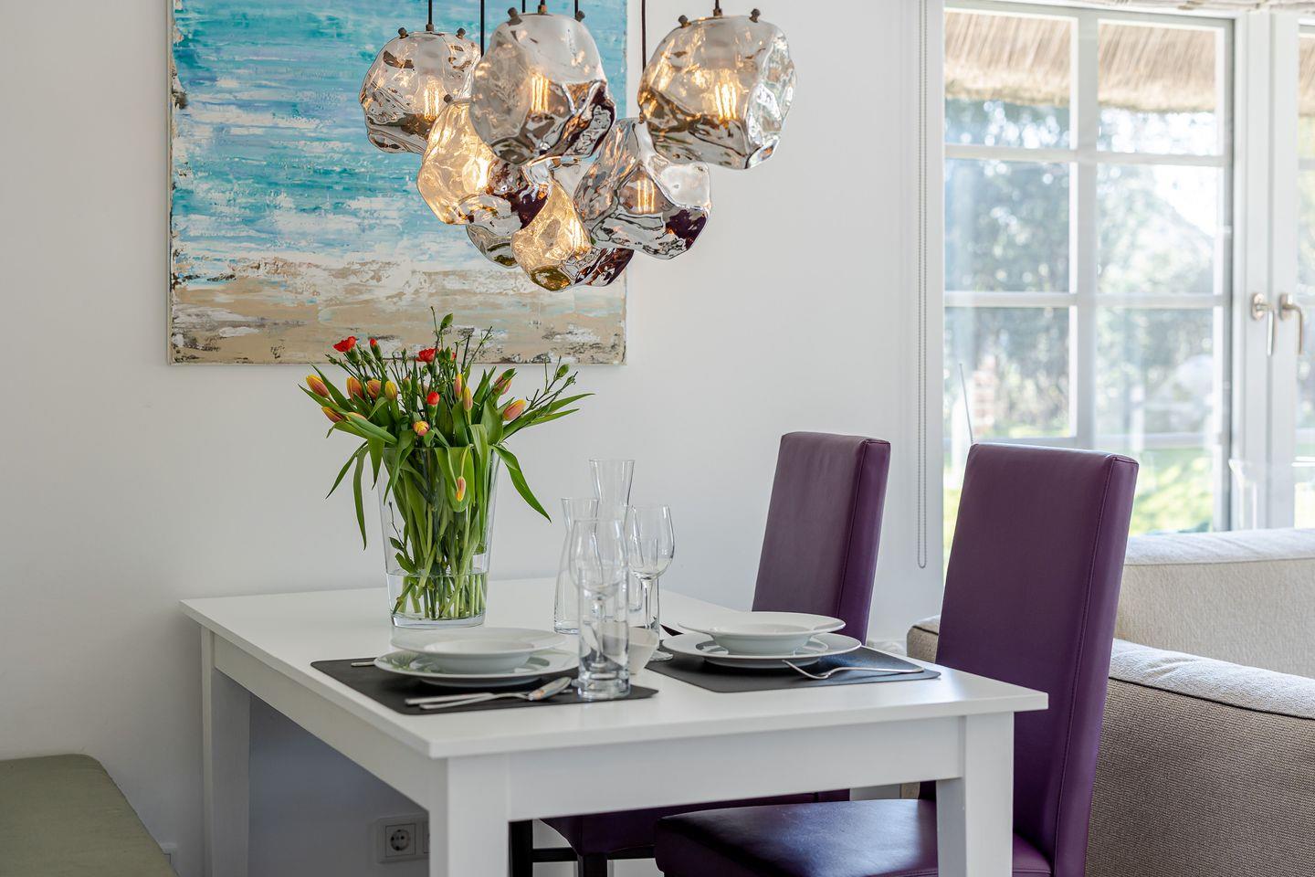 Im Erdgeschoss werden Sie vom Garderoben-Bereich in die voll ausgestatte Küche eingeladen. Die Küche ist mit einer Nespresso-Maschine sowie mit einer Kaffeefltermaschine ausgestattet. Von der Küche blicken Sie in den gemütlich gestalteten Wohn-/Essbereich. Dort erwarten Sie ein ausziehbarer Esstisch mit Sitzbank und Stühlen sowie eine einladende Sofa-Ecke mit traumhaftem Gartenblick. Von dort gelangen Sie in den ruhigen Garten, wo sie die Sonne genießen können, ob beim Kaffee am Terrassentisch oder beim Lesen im Strandkorb.