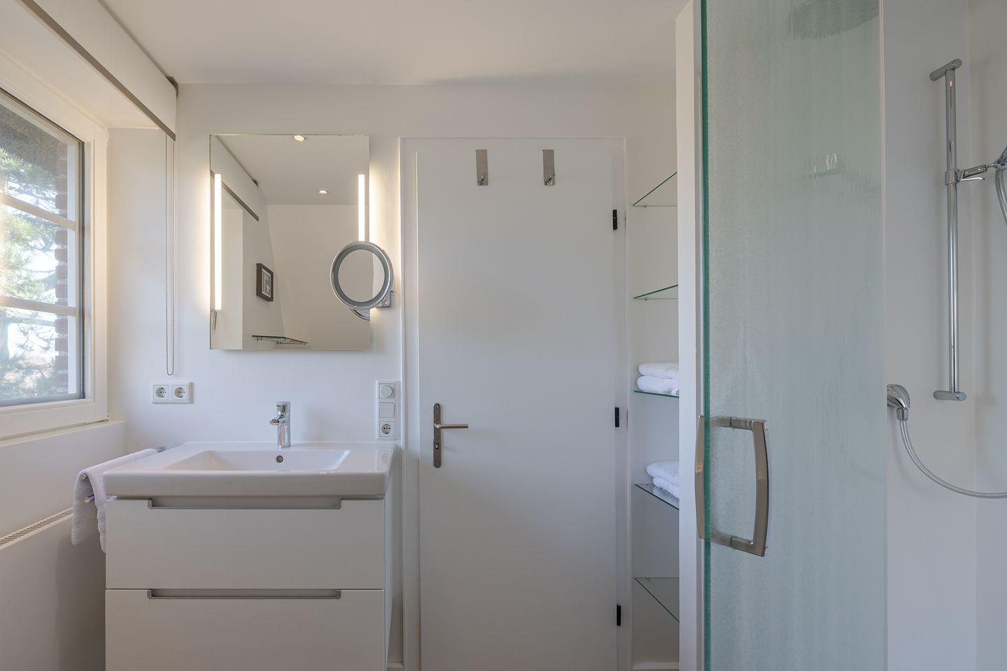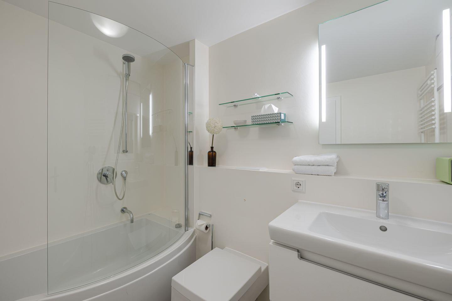 Im Obergeschoss wie im Souterrain erwarten Sie jeweils ein Schlafzimmer für 2 Personen mit bequemen Doppelbetten, TV-Geräten und jeweils eigenem Badezimmer für größtmöglichen Komfort. Im Obergeschoss befindet sich zudem ein kleiner, ruhiger Arbeitsplatz mit Schreibtisch.