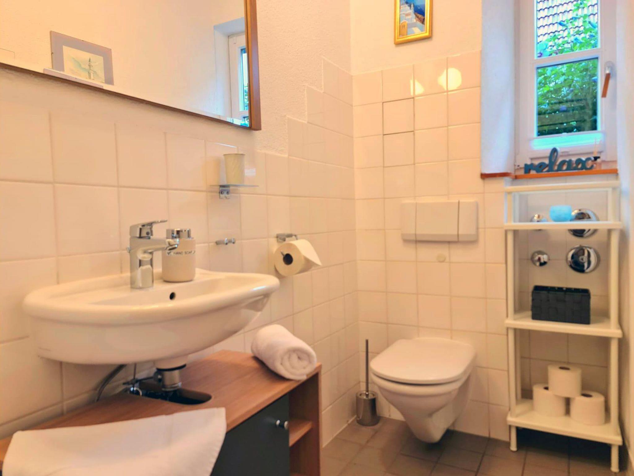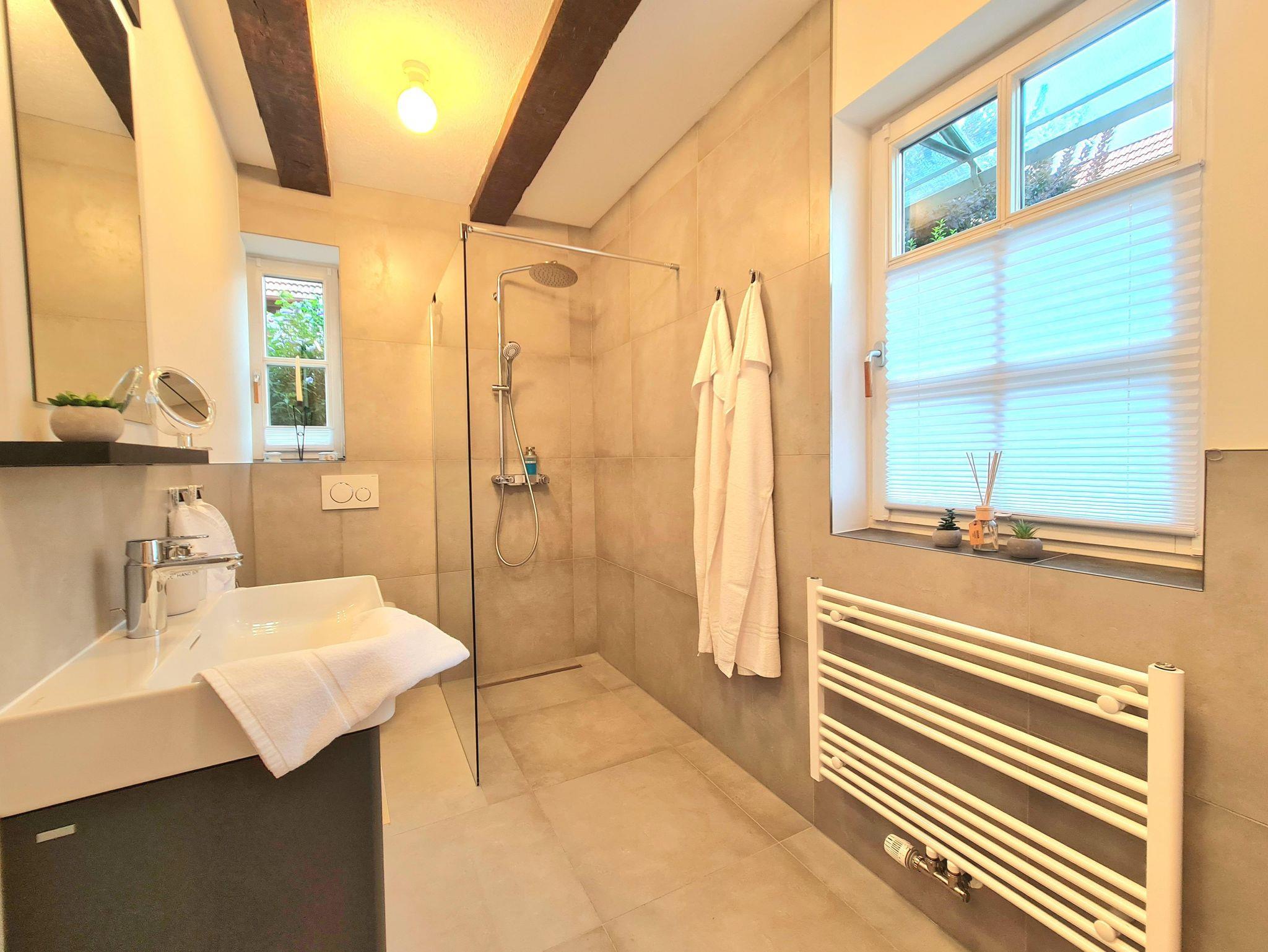 Im neu sanierten und renovierten Tageslicht-Bad kannst mit einer Regendusche ein unvergessliches Duschvergnügen erleben. Selbstverständlich stellen wir frische Handtücher und Dinge wie Toilettenpapier, Seife, Haar- und Bodywaschgel und Föhn zur Verfügung.