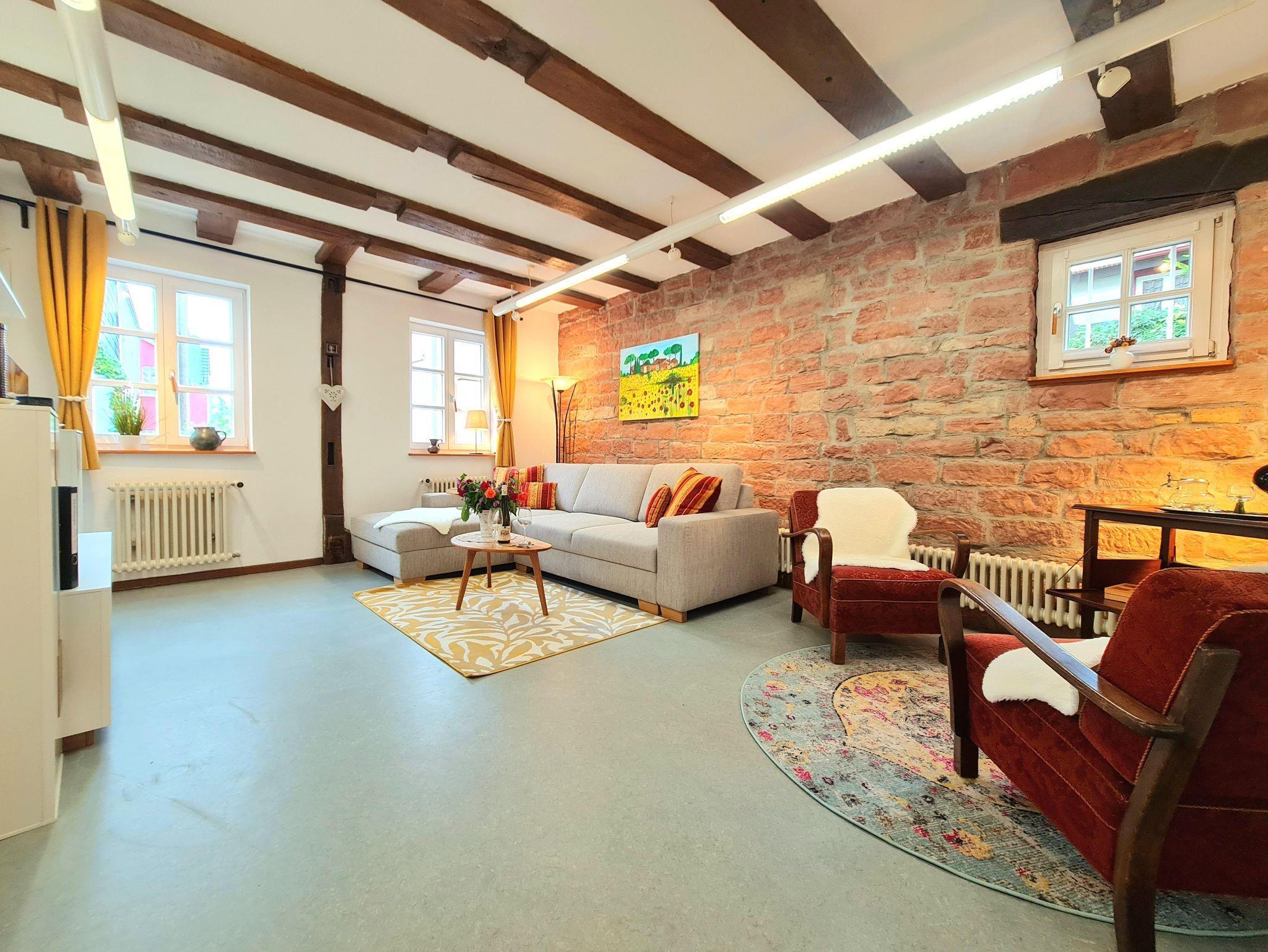 Das stilvolle Fachwerk Apartment mit seinen charmanten Balken und der offenen Natursteinwand in Wohnzimmer und Küche, bietet dir eine hochwertige Ausstattung mit Platz für 6 Gäste. Damit du dich so wohl fühlst wie zu Hause halten wir für dich alle Annehmlichkeiten bereit.