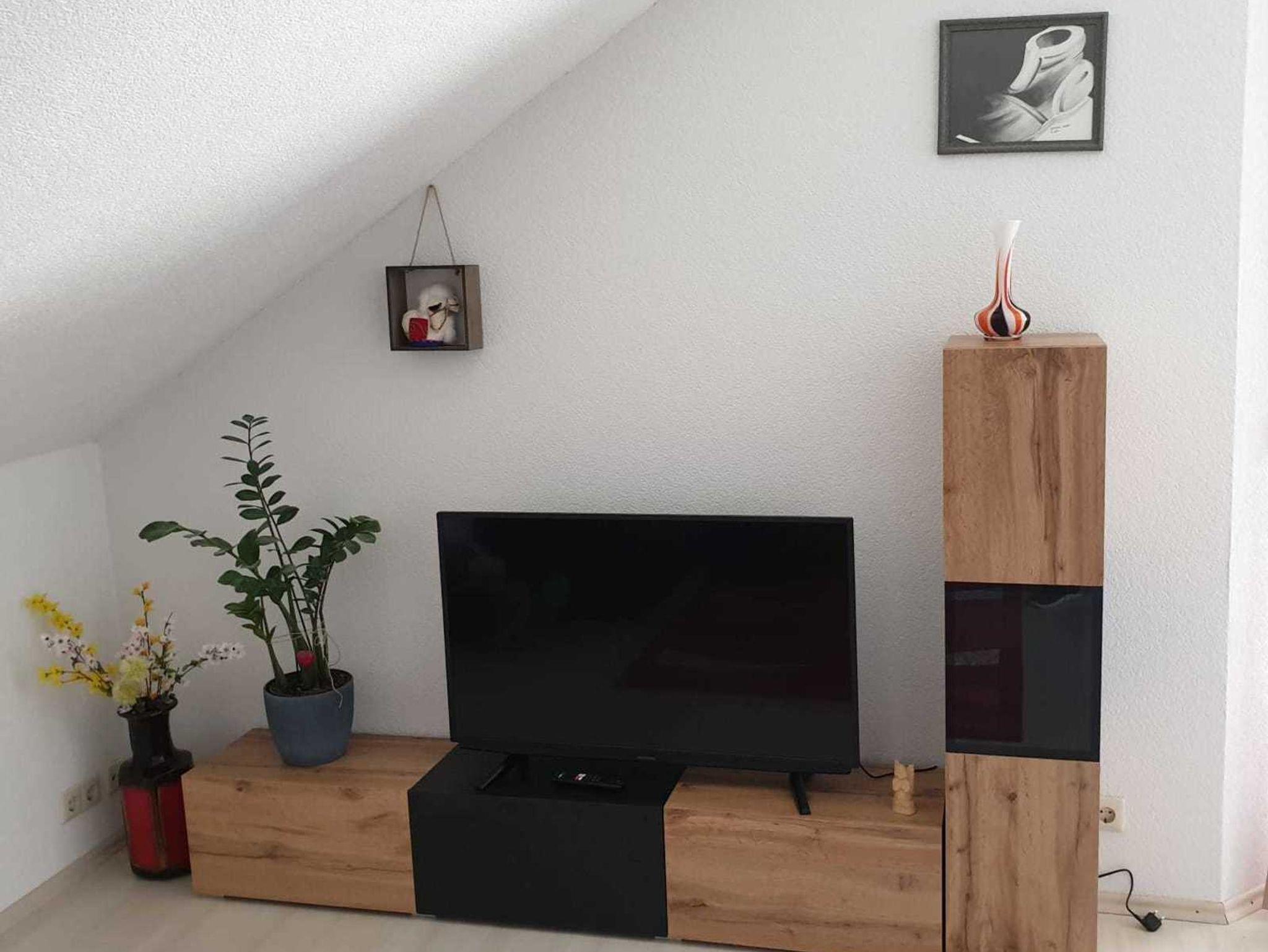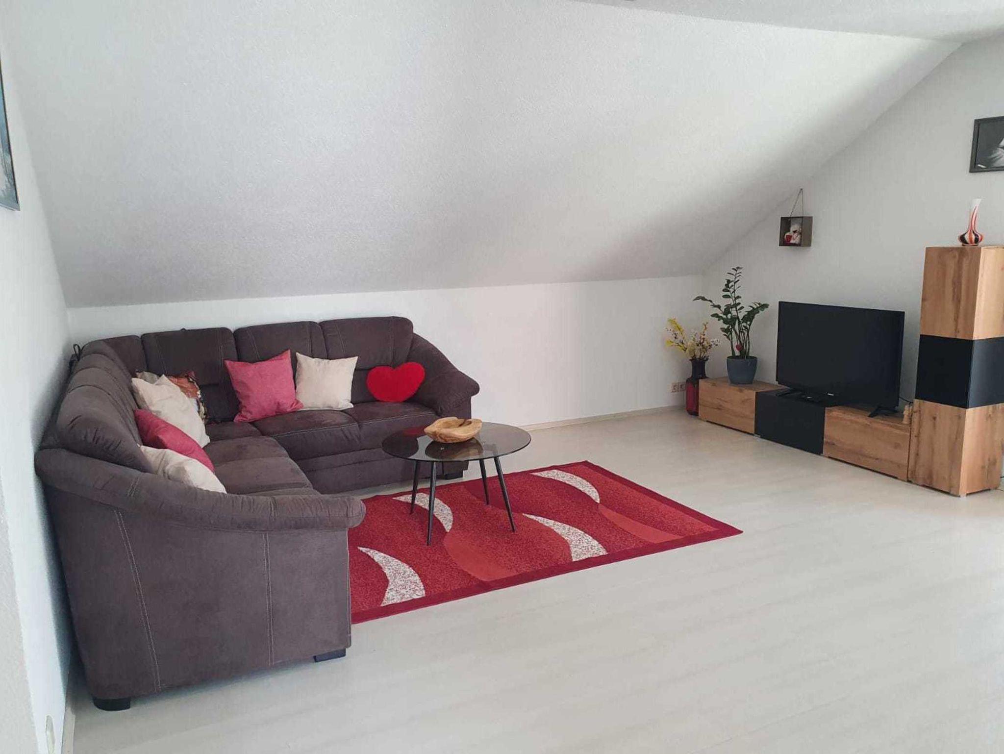 Im Wohnzimmer befindet sich ein gemütliches Sofa um vor dem Smart-TV zu verweilen und ein großer Esstisch für geselliges Beisammensein.
