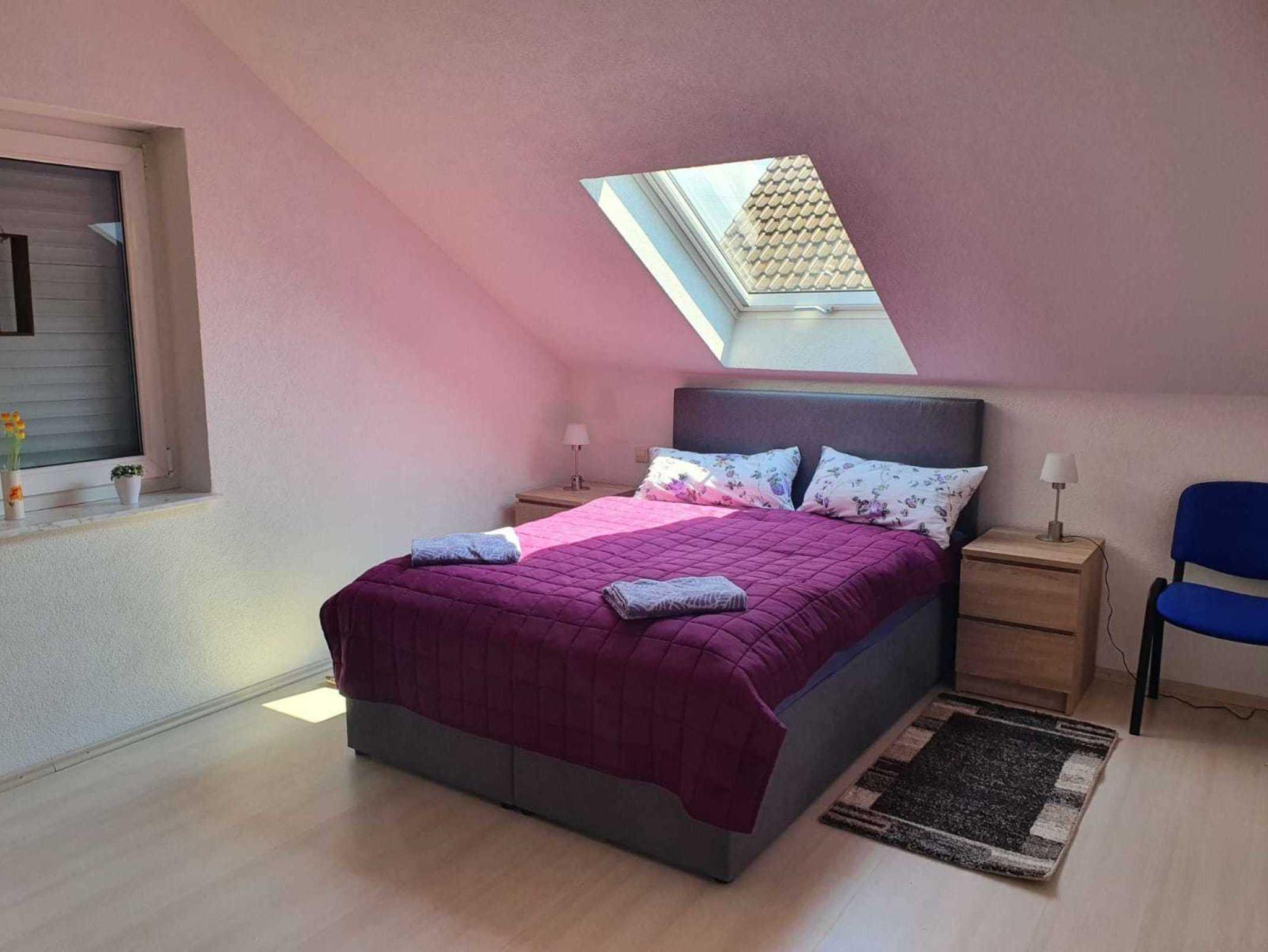 Diese 4-Zimmer-Wohnung im Dachgeschoss mit 80qm bietet ein Schlafzimmer mit Doppelbett und zwei Schlafzimmer mit je zwei Einzelbetten. Die Schlafräume sind mit Kleiderschrank und Nachttischchen ausgestattet. Das 2022 vollständig sanierte Badezimmer verfügt über ein WC, Waschbecken mit Spiegelschrank, eine Dusche und eine Waschmaschine.