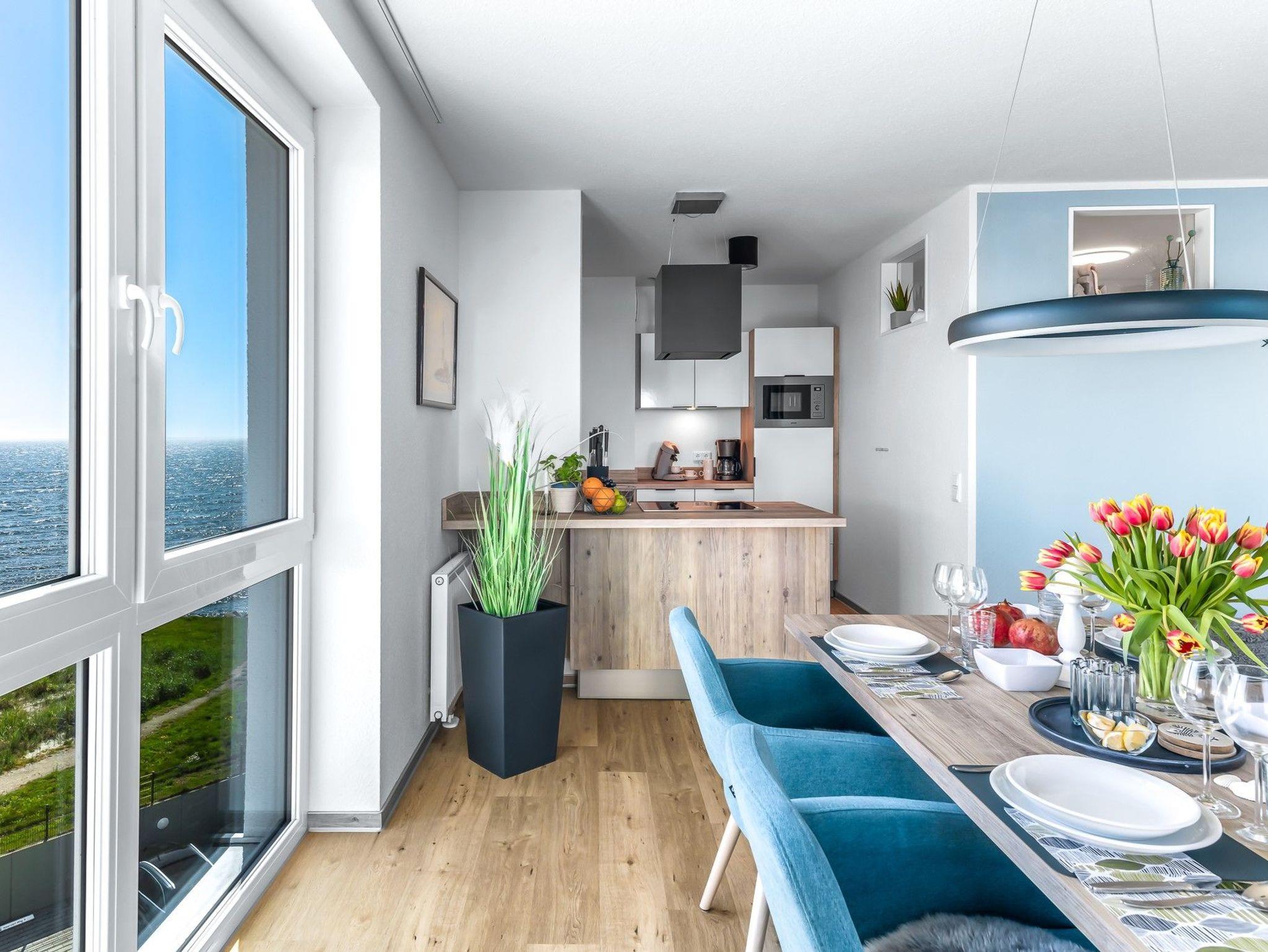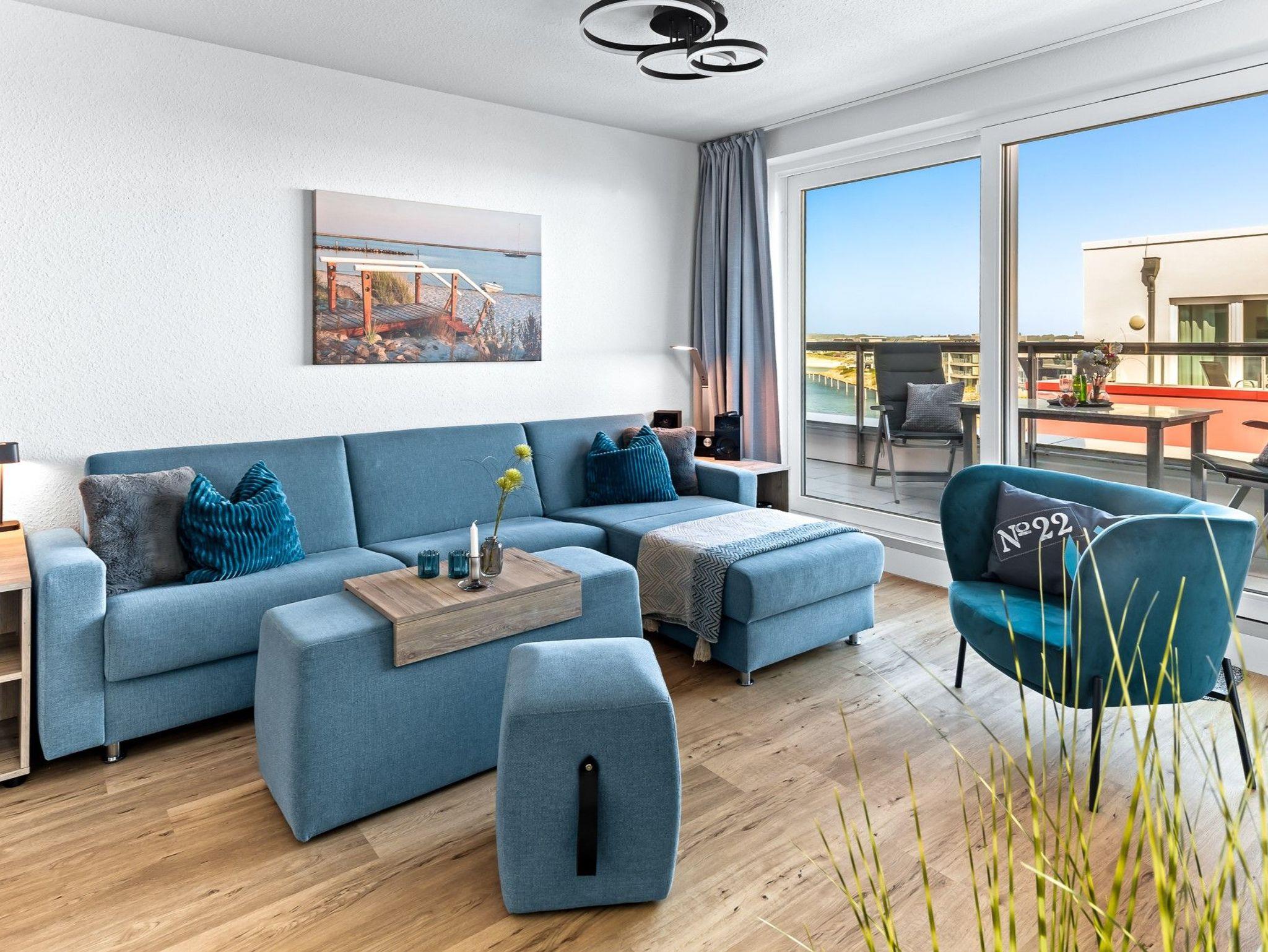 Sie wohnen in einem großzügigen modernen 2-Zimmer-Penthouse-Appartement für bis zu 4 Personen mit Sicht auf den Yachthafen und die Ostsee mit großer Dachterrasse mit Strandkorb, gesamt 80 m² groß