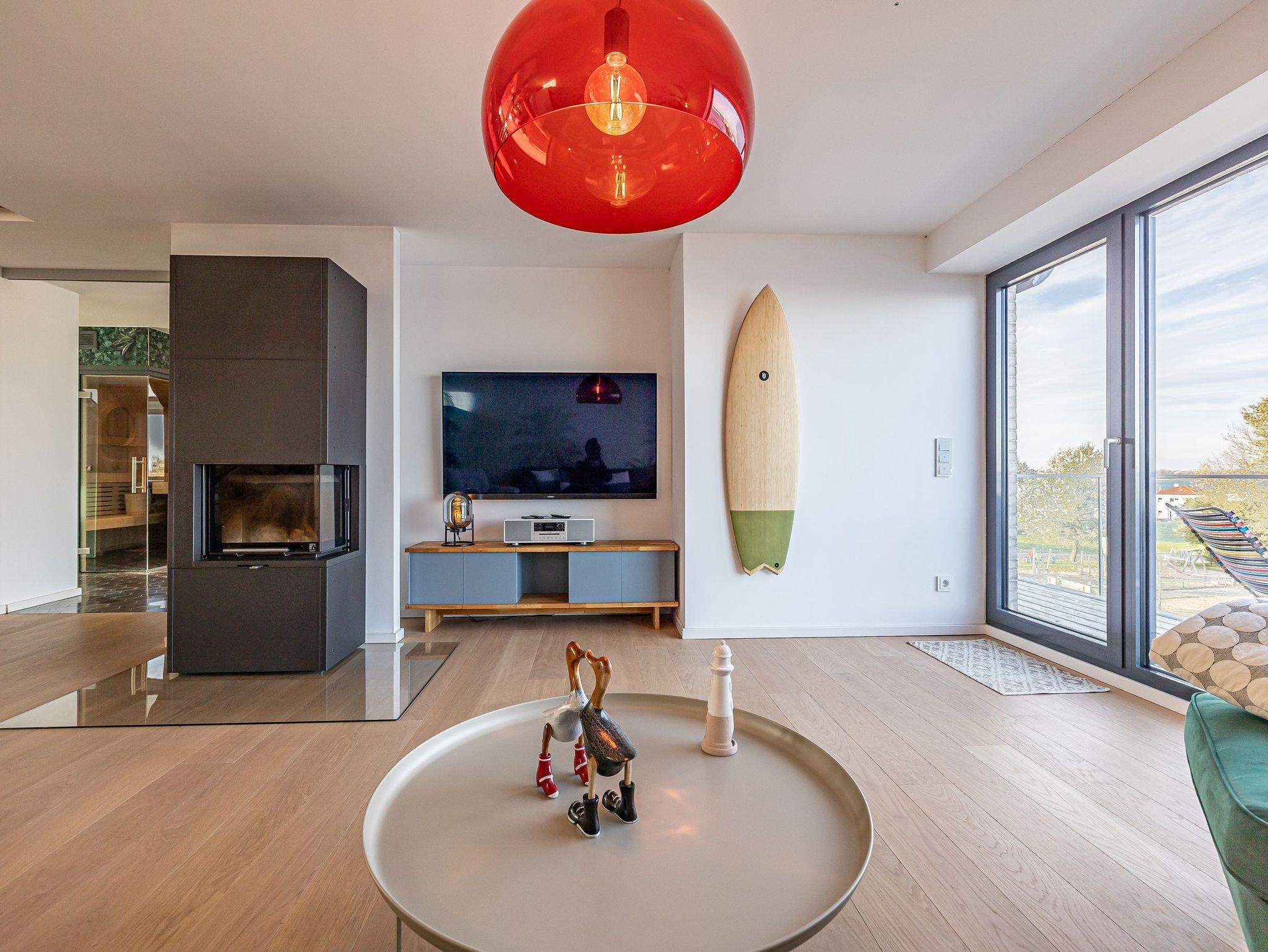 Der lichtdurchflutete Wohnbereich lädt mit einem knisternden Kamin und einem beeindruckenden Panoramablick auf den Hafen, den Leuchtturm von Schleimünde und die Ostsee zum Verweilen ein. Die moderne, voll ausgestattete Küche mit originellem Wandbild schafft die perfekte Atmosphäre für gemeinsame Kochabende. Das elegante Schlafzimmer mit komfortablem Doppelbett und eigenem TV garantiert erholsame Nächte.