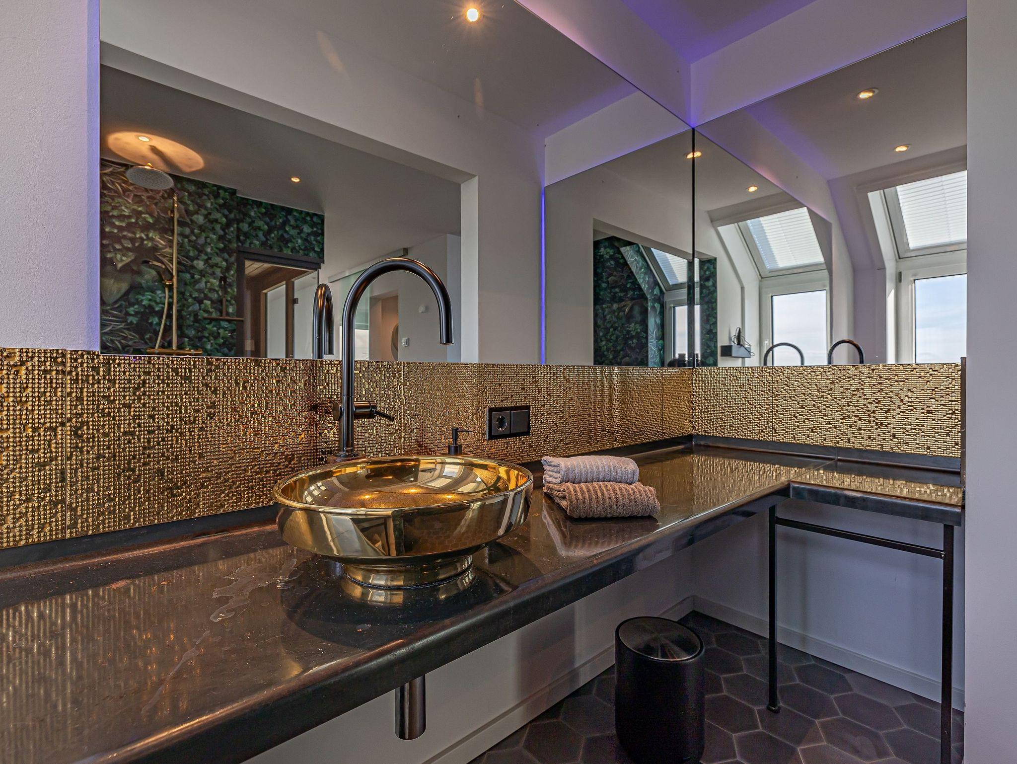 Das obere Stockwerk ist ein weiteres Highlight der Wohnung: Hier finden Sie eine freistehende Badewanne, die ein luxuriöses Badeerlebnis verspricht, sowie eine zweite Schlafmöglichkeit. Von hier aus genießen Sie atemberaubende Ausblicke, die den Raum zu etwas ganz Besonderem machen.