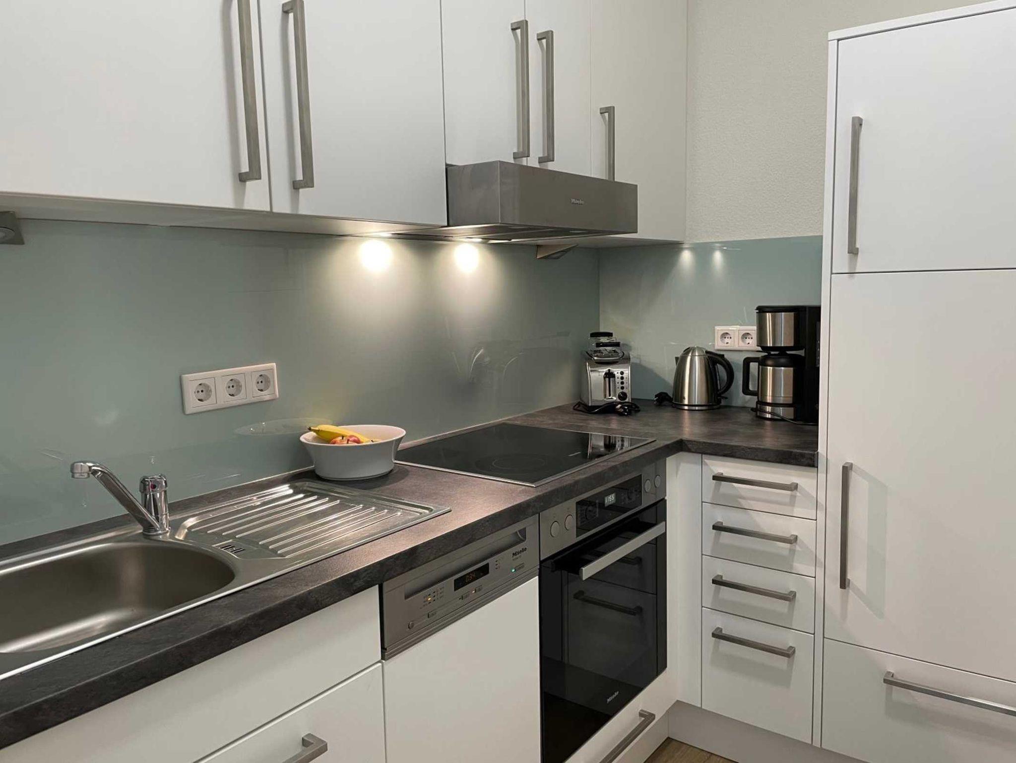 Voll ausgestattete Küche mit Miele/WMF-Geräten (Backofen, Mikrowelle, Geschirrspüler, Kühlschrank mit Gefrierfach etc.).