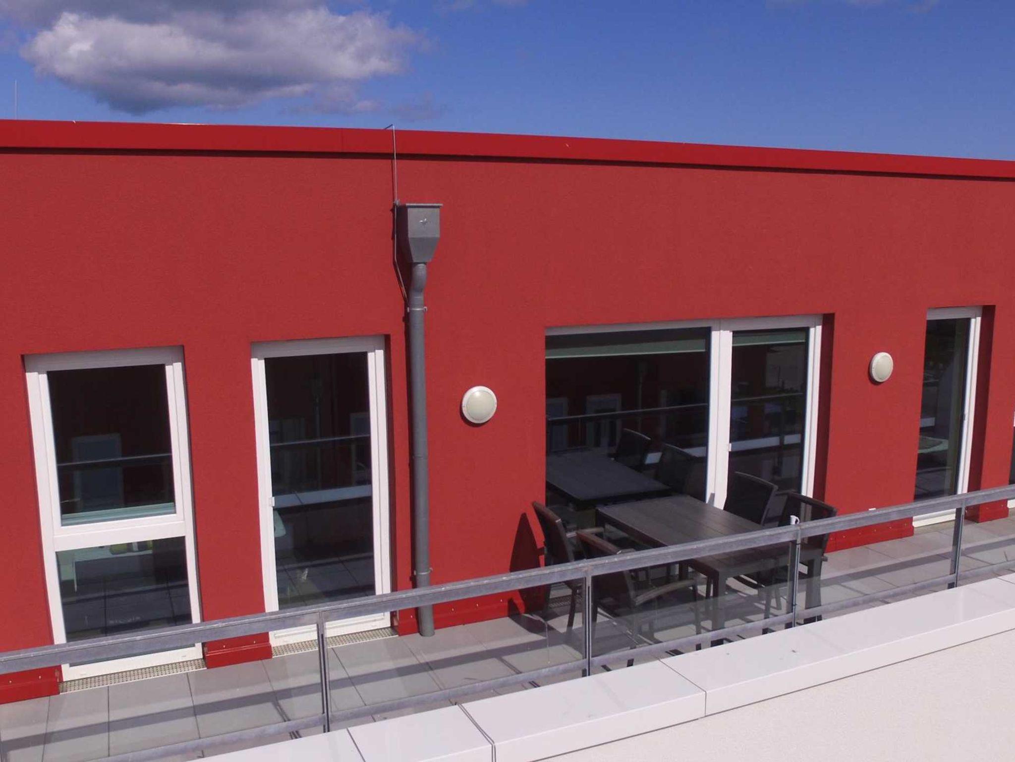 Schon morgens begrüßt Sie die Sonne auf der großen Dachterrasse und begleitet Sie dort über den Tag.