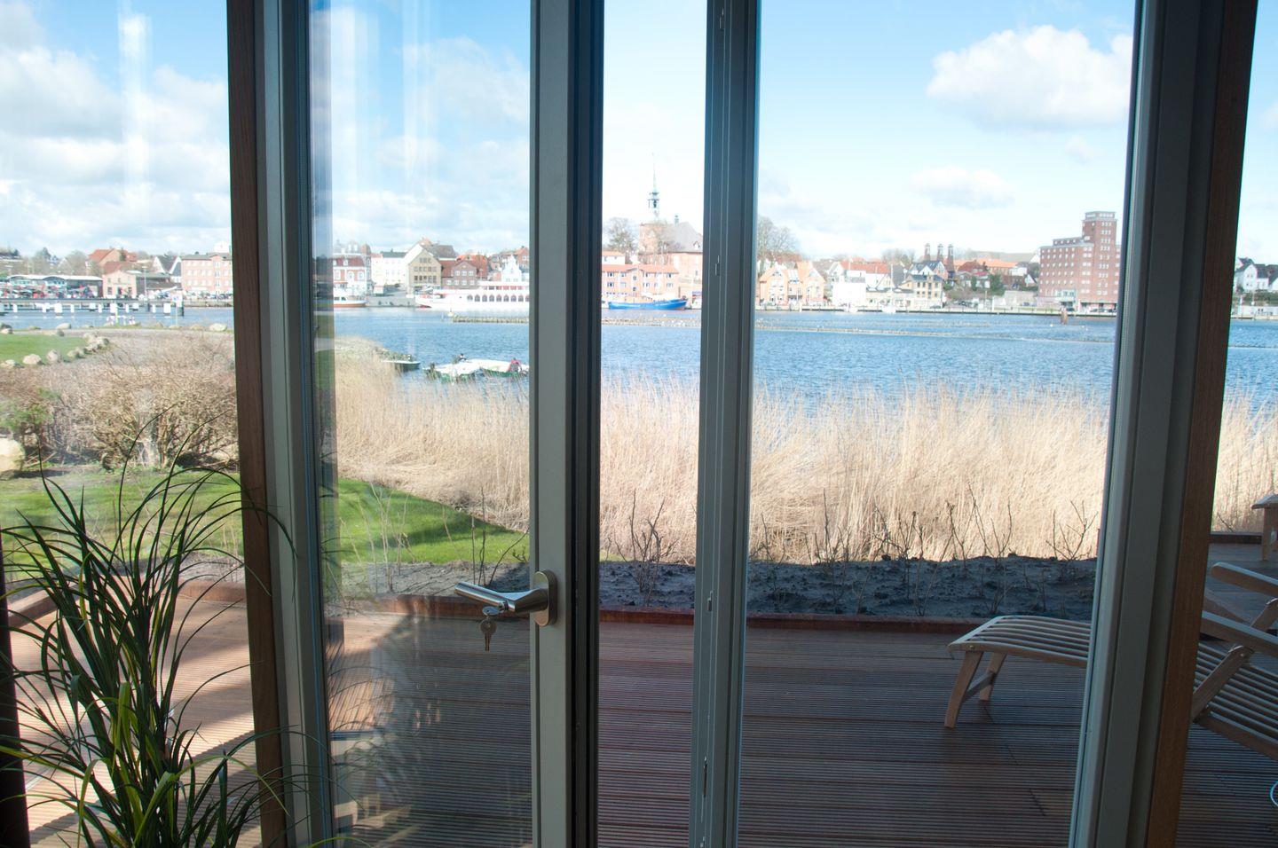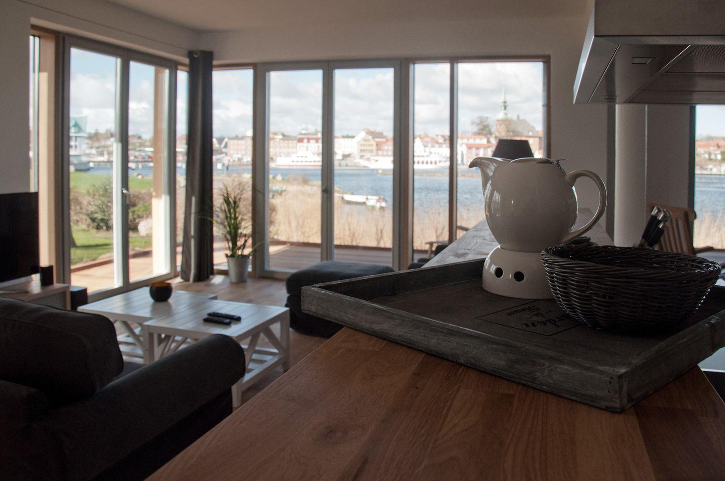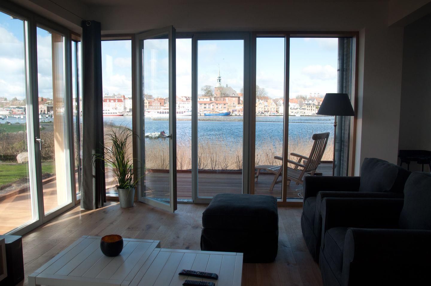 In dieser Eckwohnung mit umliegender Terrasse haben Sie einen besonders schönen Blick und viel Licht zur Schleiseite heraus. Wenn es draußen kälter wird, ist es besonders gemütlich mit Kamin – direkt am Kappelner Hafen und am Ostseefjord Schlei.