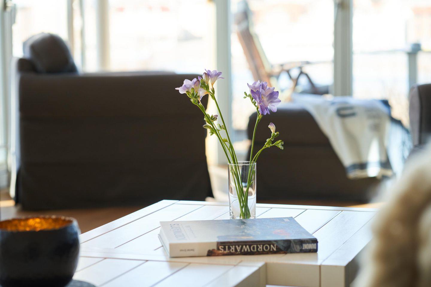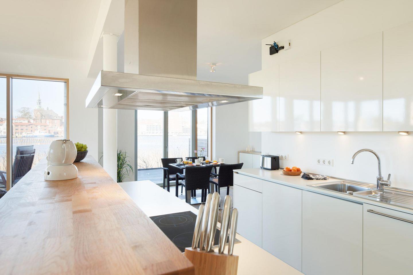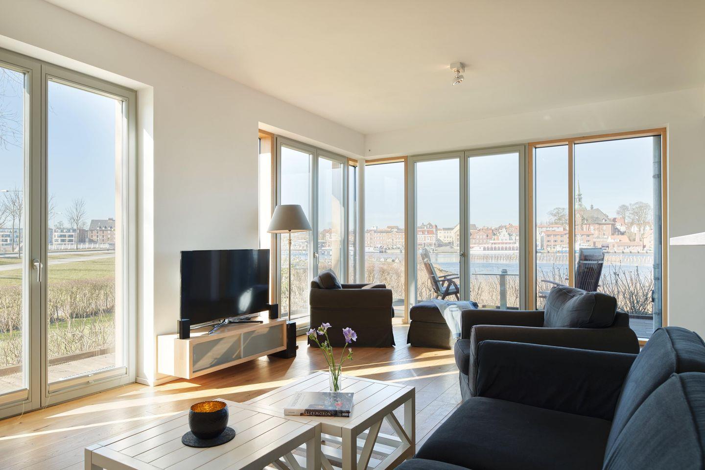 In dieser Eckwohnung mit umliegender Terrasse haben Sie einen besonders schönen Blick und viel Licht zur Schleiseite heraus. Wenn es draußen kälter wird, ist es besonders gemütlich mit Kamin – direkt am Kappelner Hafen und am Ostseefjord Schlei.